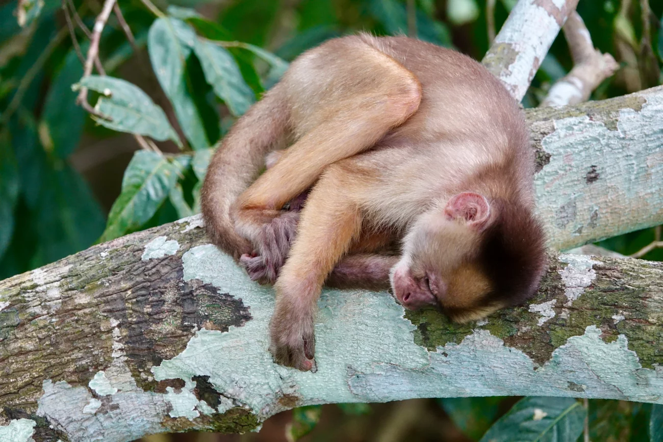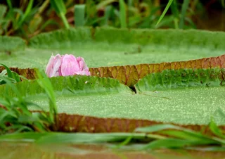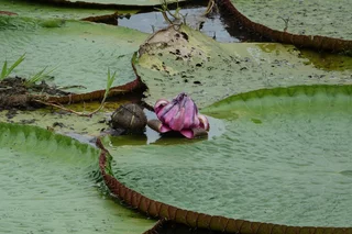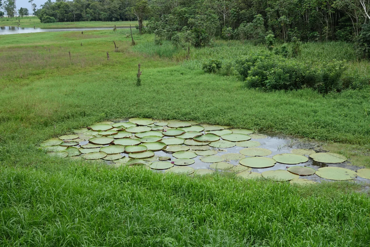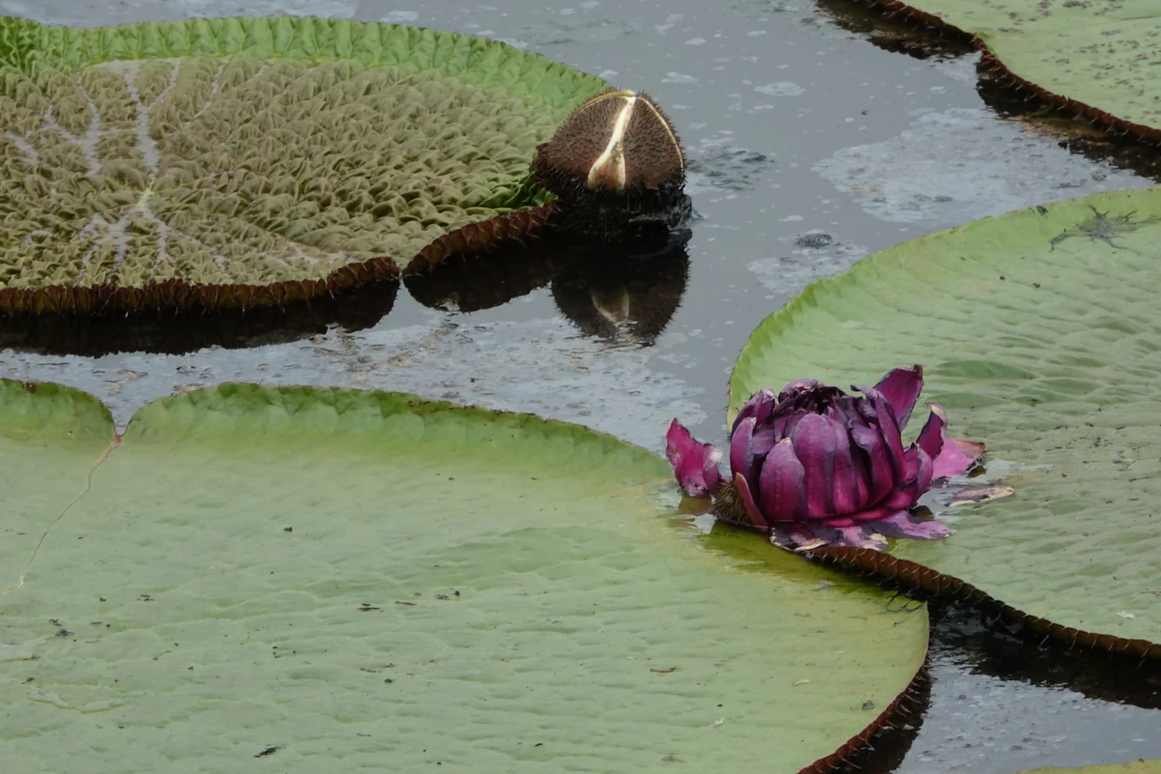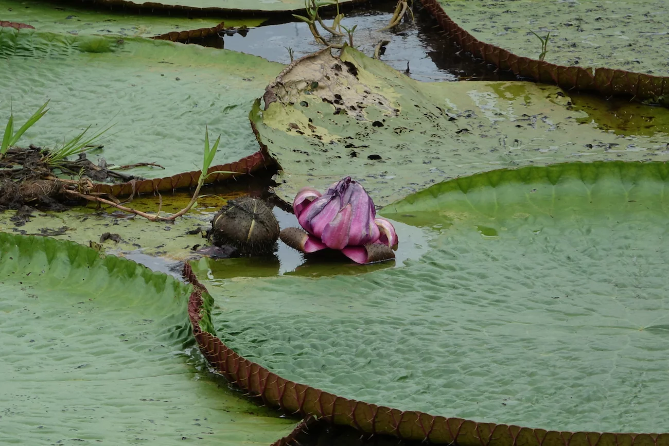 Zum Mittag gab es ein rustikales und sehr leckeres Mittagsessen in einem schwimmenden Restaurant auf dem Janauari See. Zur besseren Verdauung stand anschließend noch ein kurzer Spaziergang über einen wackeligen Baumwipfelpfad zu den Riesenseerosen statt. Dabei konnten wir ein Rudel Weisskopf-Kapuzineräffchen beobachten, die uns zeigten, was eine clevere Alternative zu einem wackeligen Spaziergang ist. Sie lagen faul auf den Ästen herum und hielten ihren Mittagsschlaf. An einem der Bäume hing ein großes Termitennest, das vorne eine Öffnung hatte und die Verästelung im Inneren zeigte. Am Ende des Baumwipfelpfades gab es einen kleinen Aussichtspunkt mit schönem Blick auf die Riesen-Rosen. Die großen Schwimmblätter haben einen aufgestellten Rand, der verhindert, dass sich die Blätter übereinander schieben und gegenseitig das Licht nehmen. Scharfe Stacheln an der Blattunterseite schützen die Seerose vor gefräßigen Fischen. Mehrere kindskopfgroße Blüten haben sich an die Wasseroberfläche geschoben, waren aber noch geschlossen. Geöffnet sind diese Blüten wunderschön.