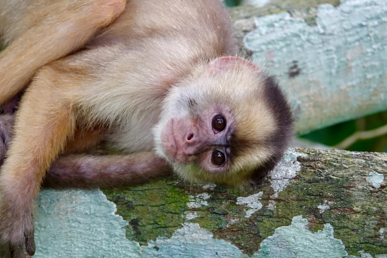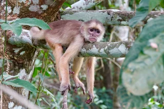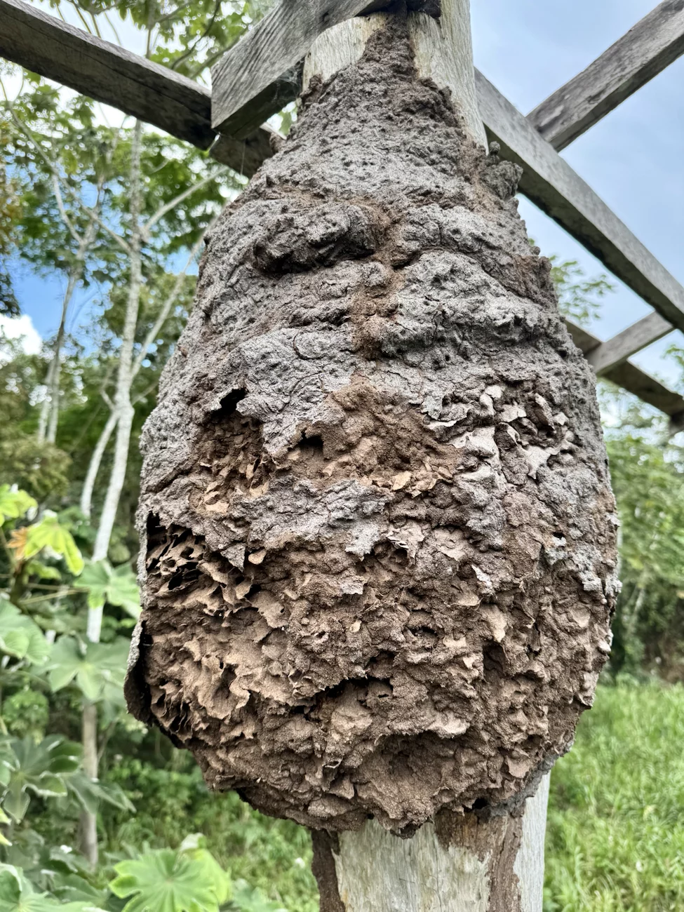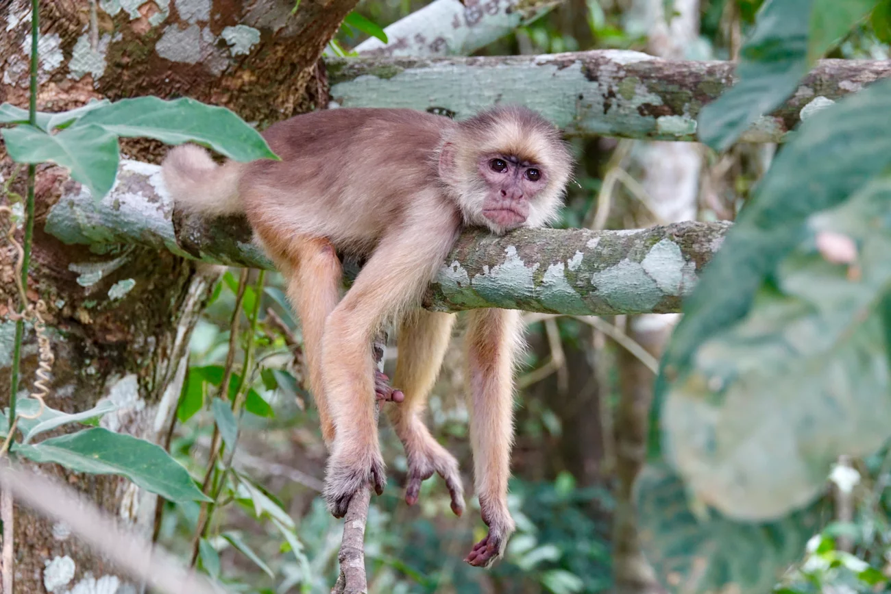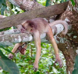 Zum Mittag gab es ein rustikales und sehr leckeres Mittagsessen in einem schwimmenden Restaurant auf dem Janauari See. Zur besseren Verdauung stand anschließend noch ein kurzer Spaziergang über einen wackeligen Baumwipfelpfad zu den Riesenseerosen statt. Dabei konnten wir ein Rudel Weisskopf-Kapuzineräffchen beobachten, die uns zeigten, was eine clevere Alternative zu einem wackeligen Spaziergang ist. Sie lagen faul auf den Ästen herum und hielten ihren Mittagsschlaf. An einem der Bäume hing ein großes Termitennest, das vorne eine Öffnung hatte und die Verästelung im Inneren zeigte. Am Ende des Baumwipfelpfades gab es einen kleinen Aussichtspunkt mit schönem Blick auf die Riesen-Rosen. Die großen Schwimmblätter haben einen aufgestellten Rand, der verhindert, dass sich die Blätter übereinander schieben und gegenseitig das Licht nehmen. Scharfe Stacheln an der Blattunterseite schützen die Seerose vor gefräßigen Fischen. Mehrere kindskopfgroße Blüten haben sich an die Wasseroberfläche geschoben, waren aber noch geschlossen. Geöffnet sind diese Blüten wunderschön.
