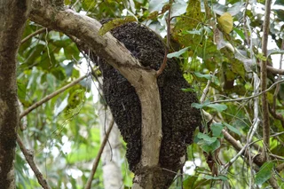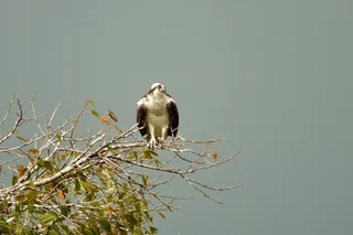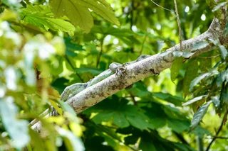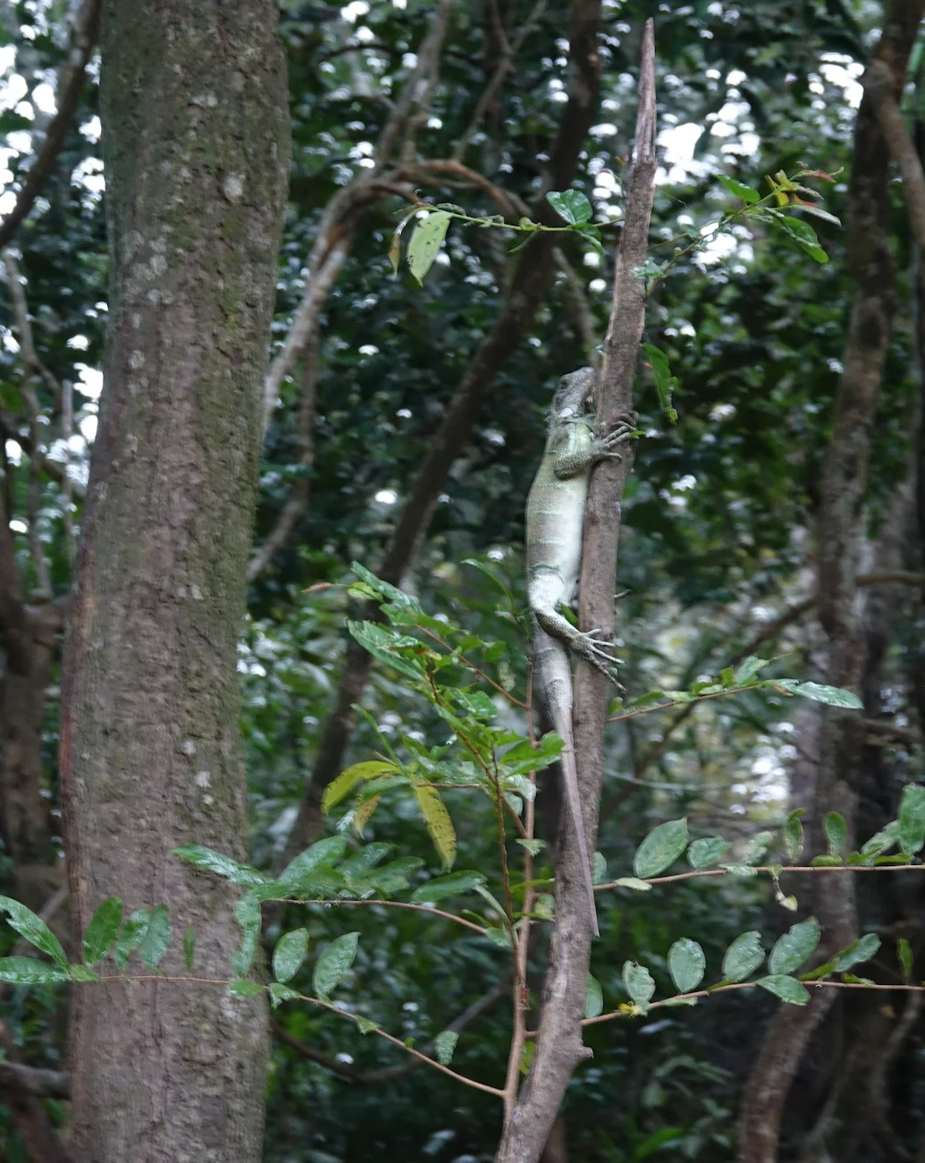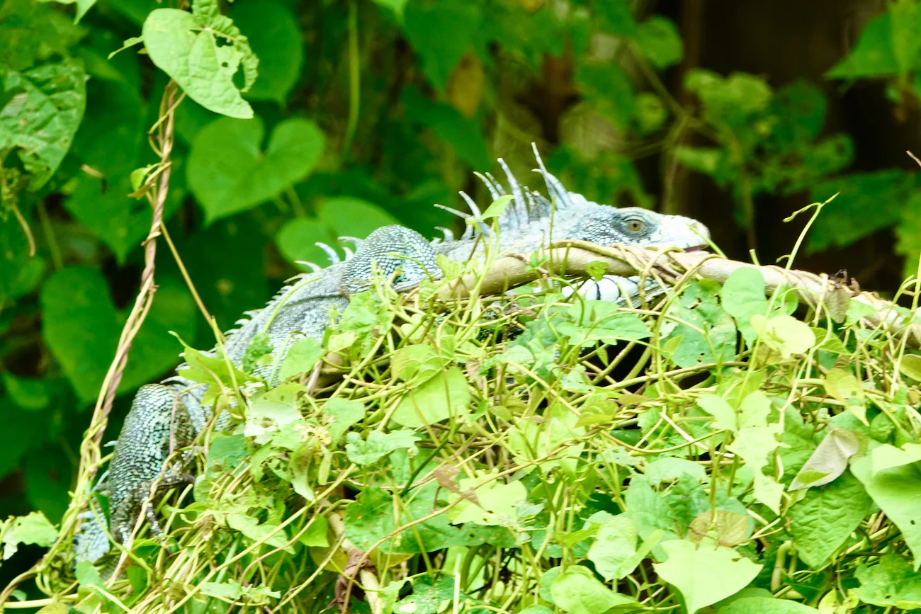 Als nächstes stand die Suche nach einem günstigen Angelplatz für Piranhas an. Dummerweise hatte es inzwischen angefangen zu regnen und zu gewittern. Bei diesen Sturzbächen an Wasser, die hier vom Himmel kommen, war es nicht ganz einfach, einen halbwegs geschützten Platz zu finden. Das empfand der Iguana, der unterwegs an einem Baum hing, wohl genau so.