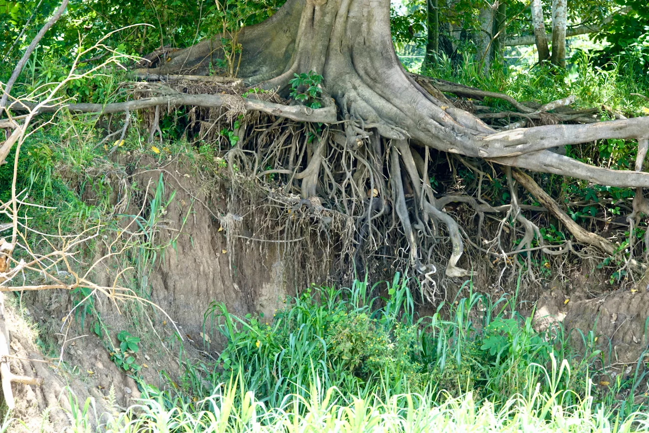 Entlang des Kanals war anhand der Abbruchkanten am Ufer und der freiliegenden Baumwurzeln deutlich zu erkennen, bis zu welcher Höhe das Wasser in der Hauptregenzeit normalerweise steigt. Da ist noch deutlich Luft nach oben, aber wir sind ja auch erst am Anfang der Regenzeit. Die einheimischen Tourguides waren zuversichtlich, dass der Wasserpegel noch deutlich zunehmen wird in dieser Saison.