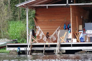 Als es dann endlich losging, bekamen wir bei der Fahrt durch den Hauptkanal des Parks die Gelegenheit, das hier ansässige Dorf vom Boot aus zu besichtigen. Hier leben etwa 700 Einwohner in bzw. auf sogenannten “Floating Homes” = Schwimmende Häuser in einfachsten Verhältnissen. Die Häuser sind je nach Größe auf 3 - 4 massive Baumstämme gesetzt und am Ufer vertäut. Darauf sind als Boden des Hauses einfache Bretter befestigt.