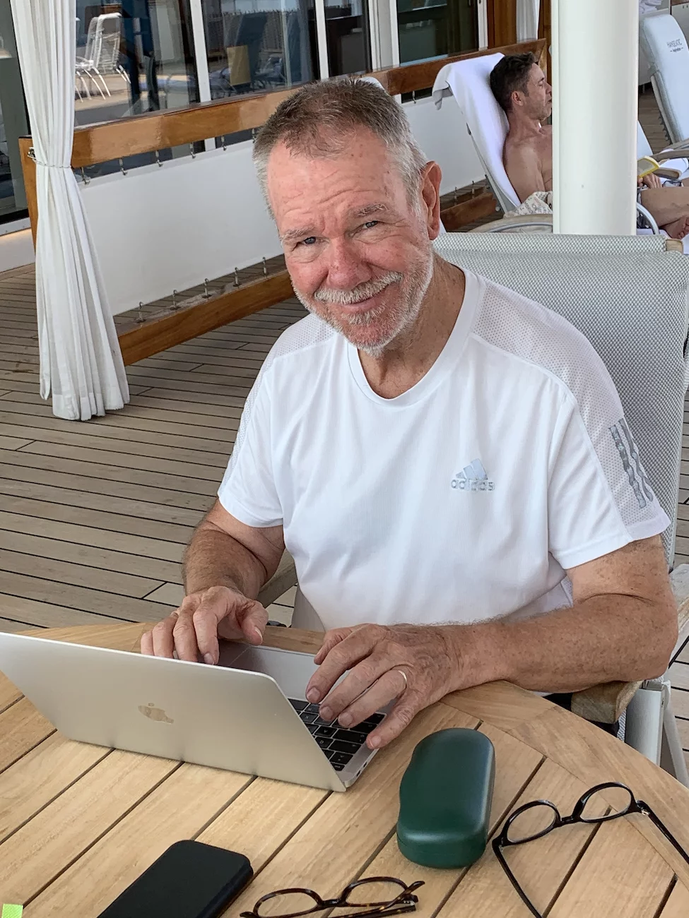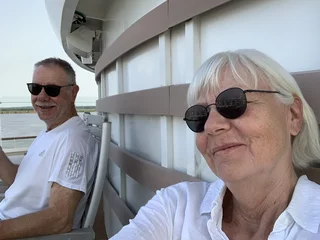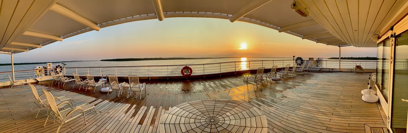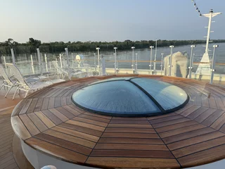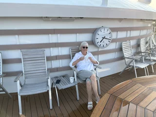 Eigentlich dürfen wir heute endlich mal ausschlafen. Doch dann hat uns die aufgehende Sonne aus dem Bett geschmissen. Wir sind hoch auf Deck 9 und haben es uns mit einer Tasse Kaffee auf dem Vordeck gemütlich gemacht. Dort ist es schön schattig und es weht immer eine leichte Brise. Um die frühe Uhrzeit am Morgen ist diese bei 26° noch eine tolle natürliche Klimaanlage!!