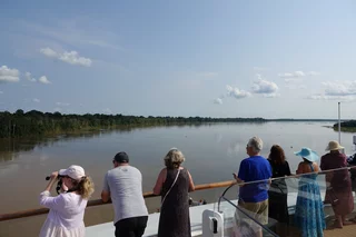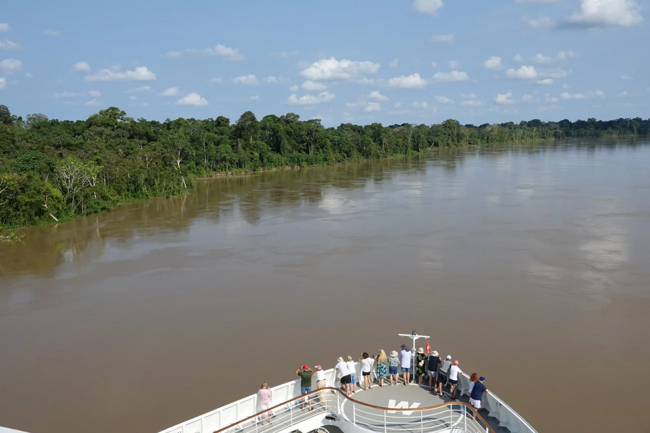 Solange die schnell zunehmenden Temperaturen es erlauben, stehen wir an der Reling und bewundern immer wieder die vorbeiziehende einzigartige Natur an beiden Ufern. Gerne nehmen wir diesen Tag als kurze “Auszeit vom Abenteuer”, denn es ist der EINZIGE ohne Expeditionsaktivitäten auf dieser 18-tägigen Schiffsreise!! Abgesehen von heute, wo Faulenzen im Fokus steht, sieht unser normaler Tagesablauf in etwa so aus: