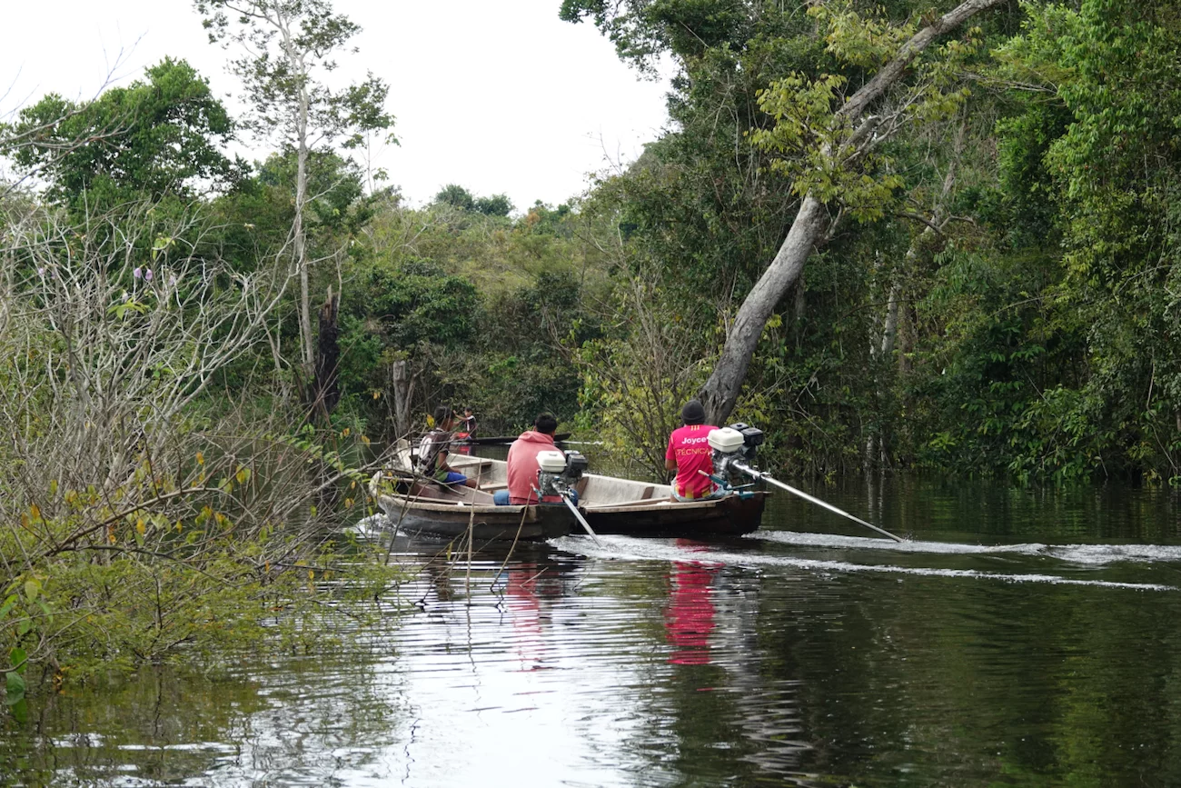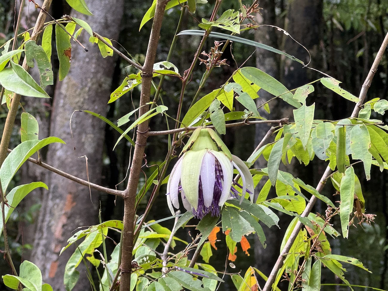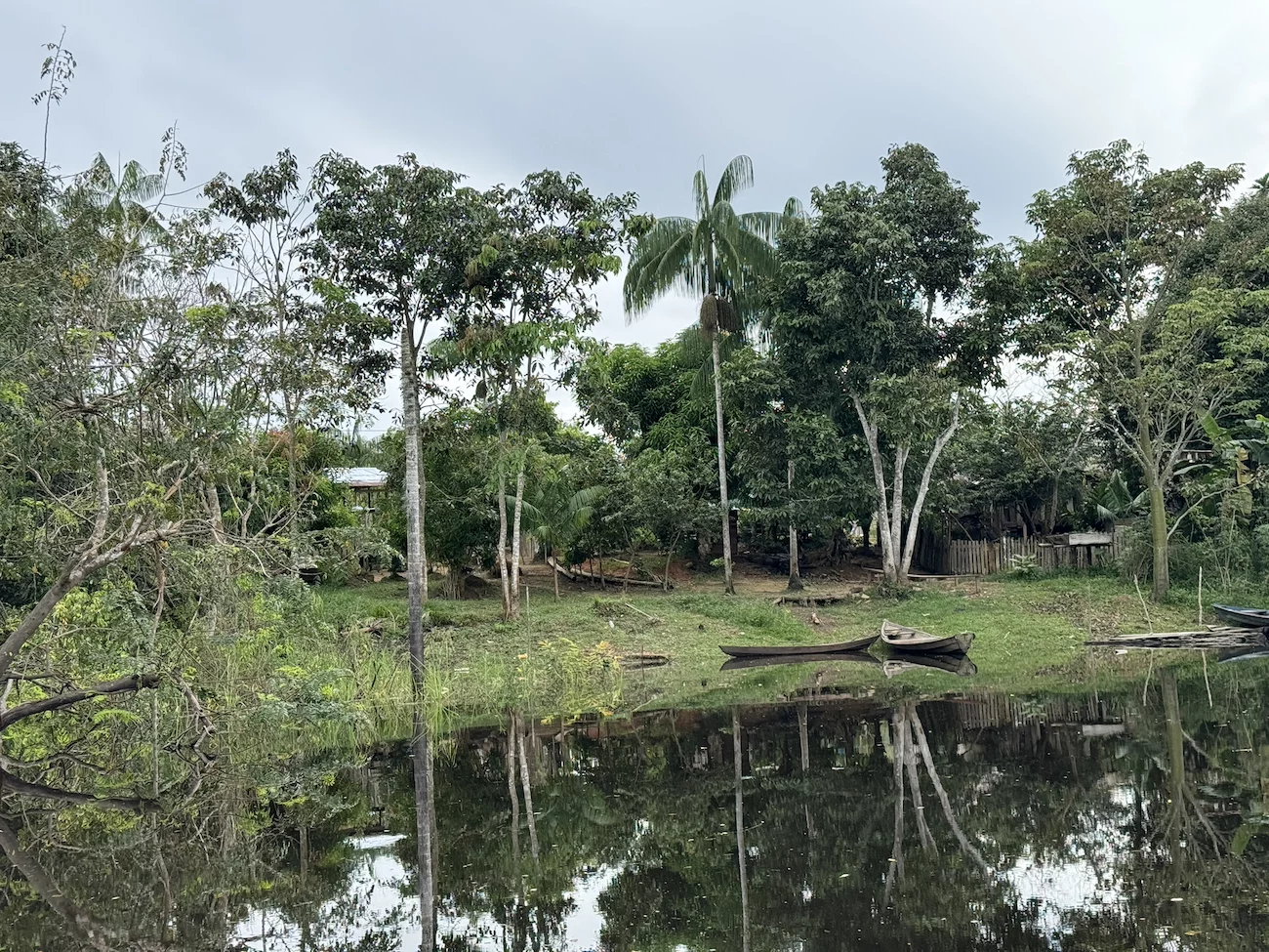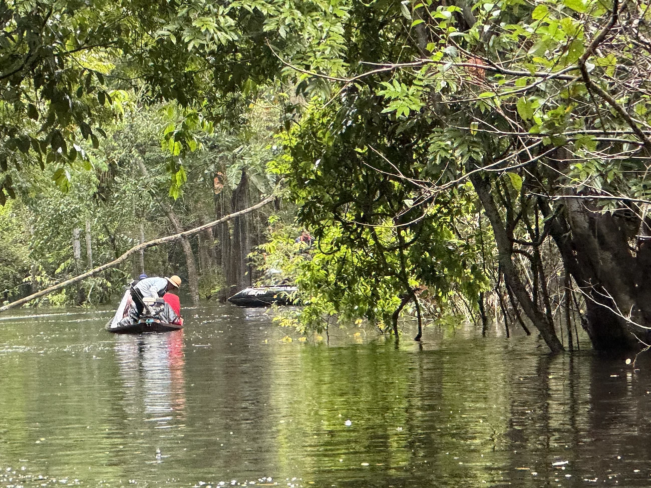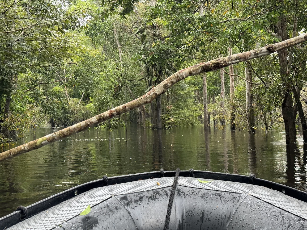 So glitten wir mit den Booten gemächlich durch diese überwältigende Natur, begleitet vom Geschrei und Gepiepe der Papageien und anderer Vogelarten, die sich unsichtbar irgendwo in den Baumkronen versteckten. Eine Hoffnung auf Tiersichtungen brauchten wir uns laut unserem Experten nicht zu machen, denn die suchen Schutz im dichten Wald, bis der Regen aufhört.
