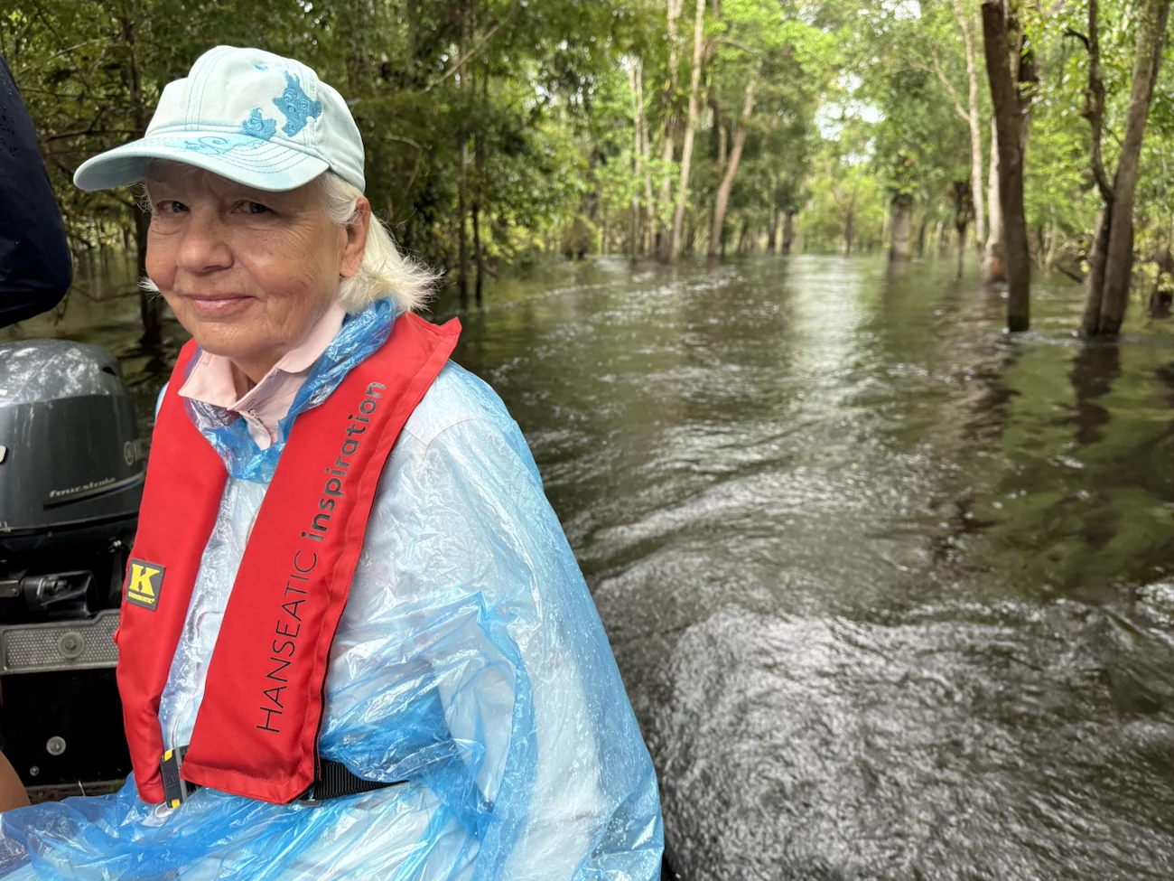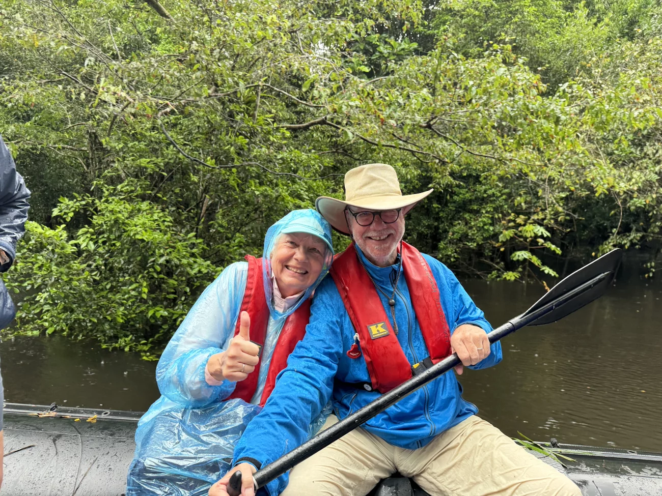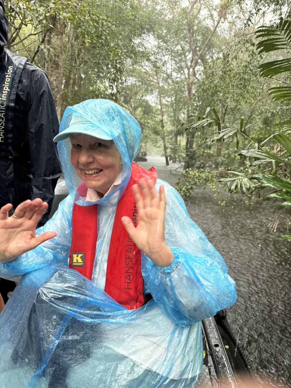 Unsere Fahrt führte uns in einen engen Kanal und begann trocken, aber nach ca. 10 Minuten öffneten sich die himmlischen Schleusen. Allerdings zunächst noch nicht sehr weit. Es tröpfelte mal etwas mehr, mal etwas weniger stark. Da konnten wir dem Regen sogar noch etwas Positives abgewinnen, denn hier regnet es warm.