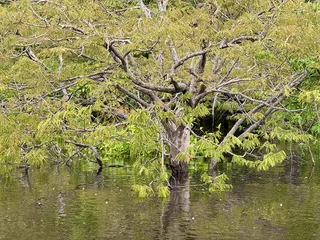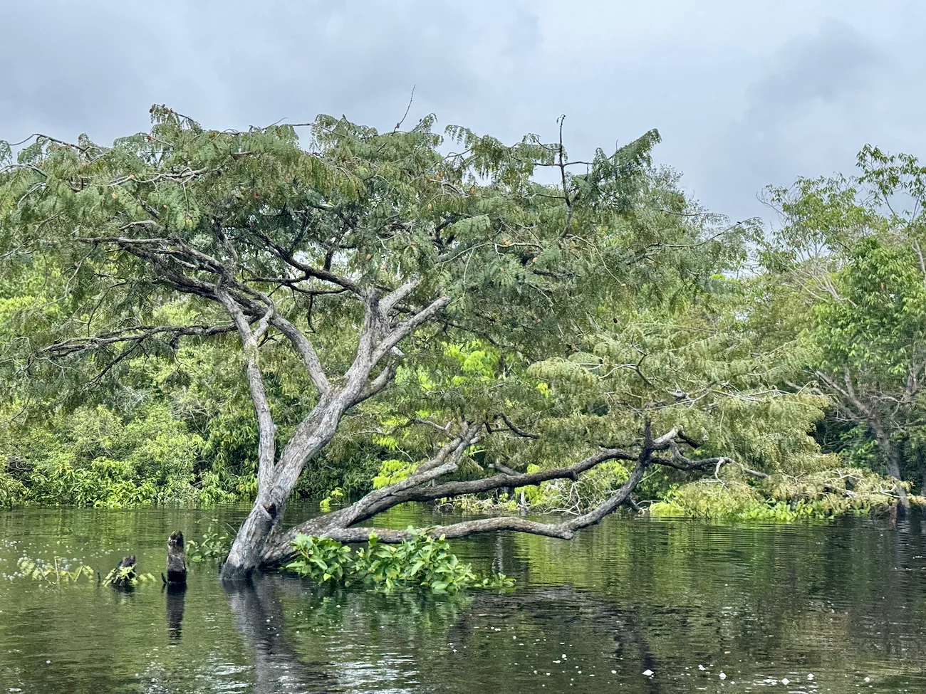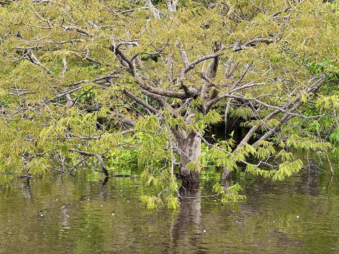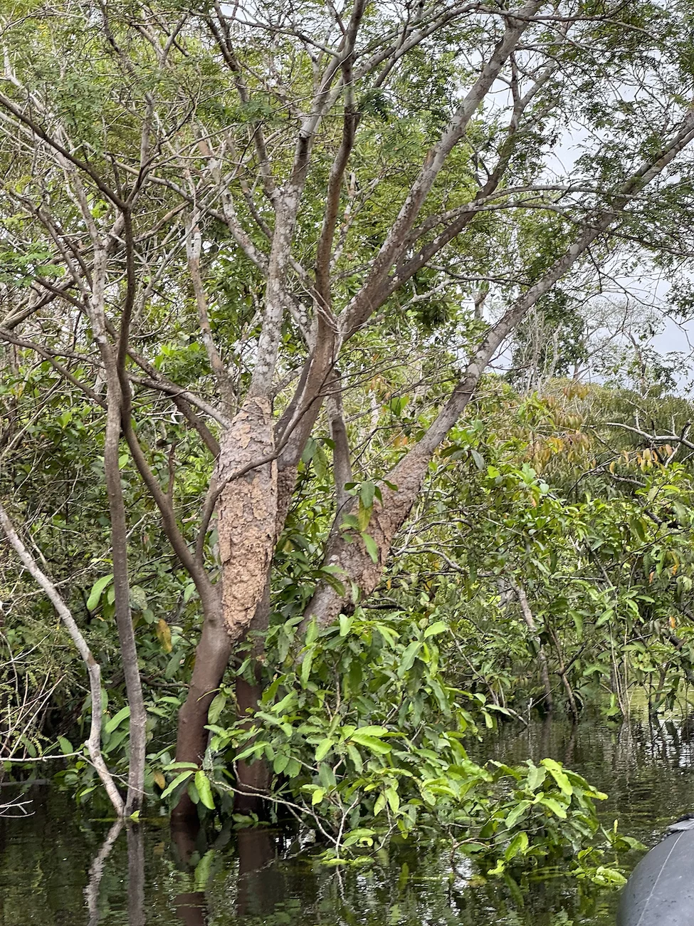 Beeindruckend sind auch die verschiedenen Baumformen in diesem “Wald”. Oft sieht es so aus, als hätte man von außen einen Knoten in die Äste gemacht. Manchmal stehen aber auch nur noch nackte Stämme im Wasser. Zu bemerken sei auch, dass zur Zeit die Hälfte der Bäume und Büsche unter Wasser stehen. Im Moment sind wir noch am Anfang der Regenzeit. In diesem Jahr sieht es so aus, als würde es eine normal Regenzeit werden, was bedeutet, dass die Einheimischen in 2-3 Monaten mit ihren Booten in Höhe der Baumkronen fahren.