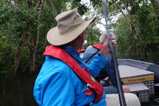 Je weiter wir in den Wald eindrangen, wurde die “Fahrtrinne” immer enger, so daß wir mit den Hilfspaddeln auf beiden Seiten des Bootes immer wieder überhängende Zweige von Palmen, Büschen und Farnen wegdrücken mussten. Denn auf deren Blättern und Zweigen halten sich mit Vorliebe Spinnen, Käfer und andere Krabbeltiere auf, die nicht nur ins Boot, sondern auch gerne mal in den Kragen fallen. Deshalb trage ich bei den Ausfahrten immer meinen Hut mit der großen Krempe.