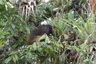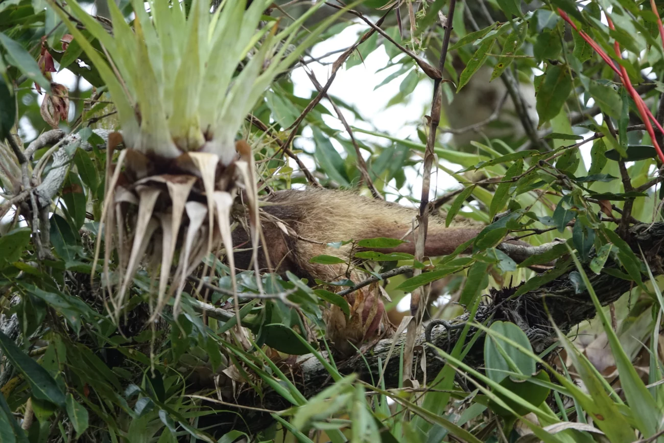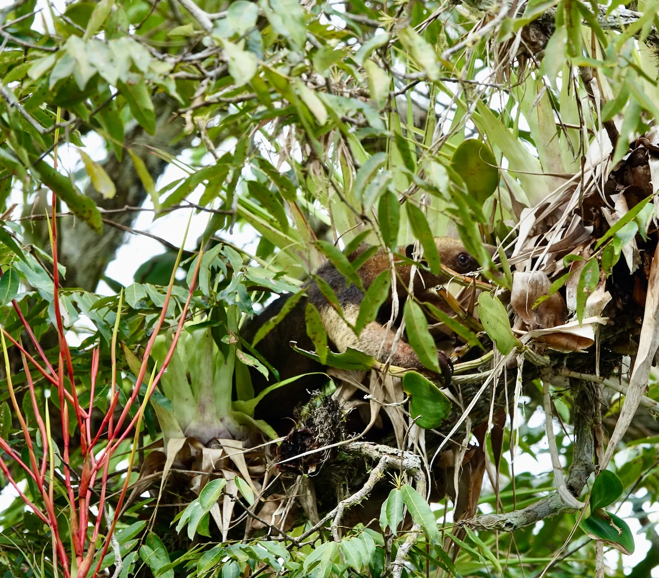 Kaum waren wir am anderen Ende des See’s wieder in den Kanal eingefahren, gab es einen kleinen Zodiac-Stau. Hoch oben in einer Baumkrone war ein kleiner Ameisenbär auf Futtersuche. Mal sah man den Schwanz, dann wieder einen Teil des Körpers, aber ganz bekam man ihn durch das relativ dichte Blattwerk nicht zu sehen.