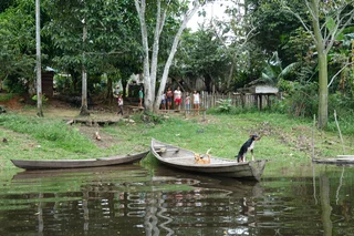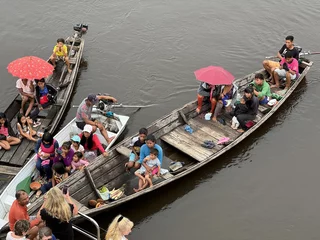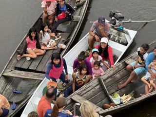 Während des Mittagessens bekam die Inspiration Besuch. Der Kapitän hatte die Marina herunterfahren lassen und eine ganze Flotte von Kanus mit Tikuna-Indianern belagerte das Heck des Schiffes. Nachdem die erste Scheu auf beiden Seiten etwas abgenommen hatte, begann ein reger Tauschhandel. Kokosnüsse, Bananen, Wassermelonen, Kunsthandwerk, T-Shirts, Baseballkappen und andere Textilien wechselten den Besitzer. Die Verständigung lief über Gesten wie Zeigen, Kopfnicken-oder Schütteln, Lächeln oder auch einfach Wegschauen.