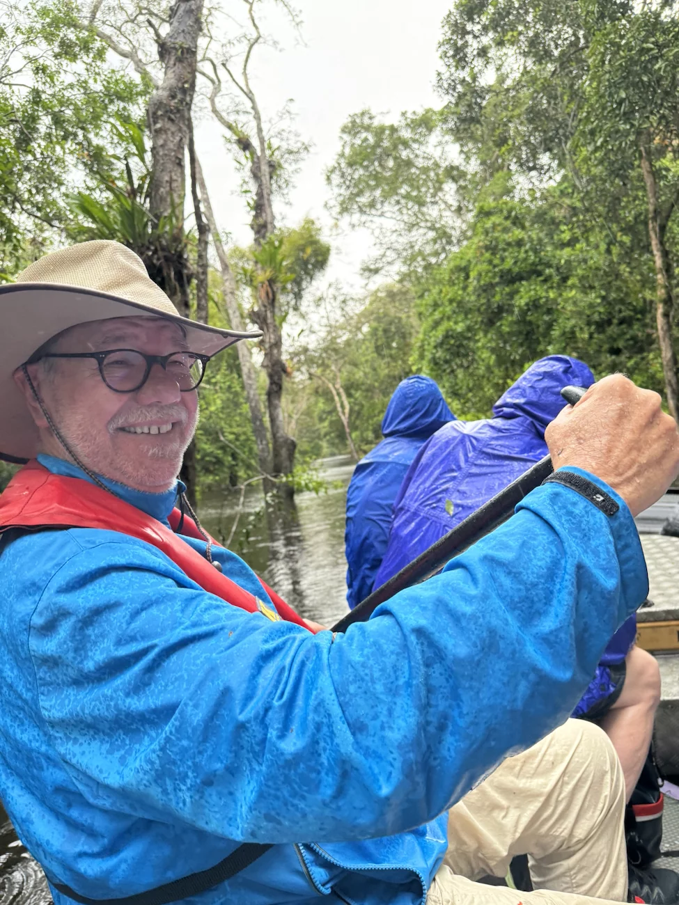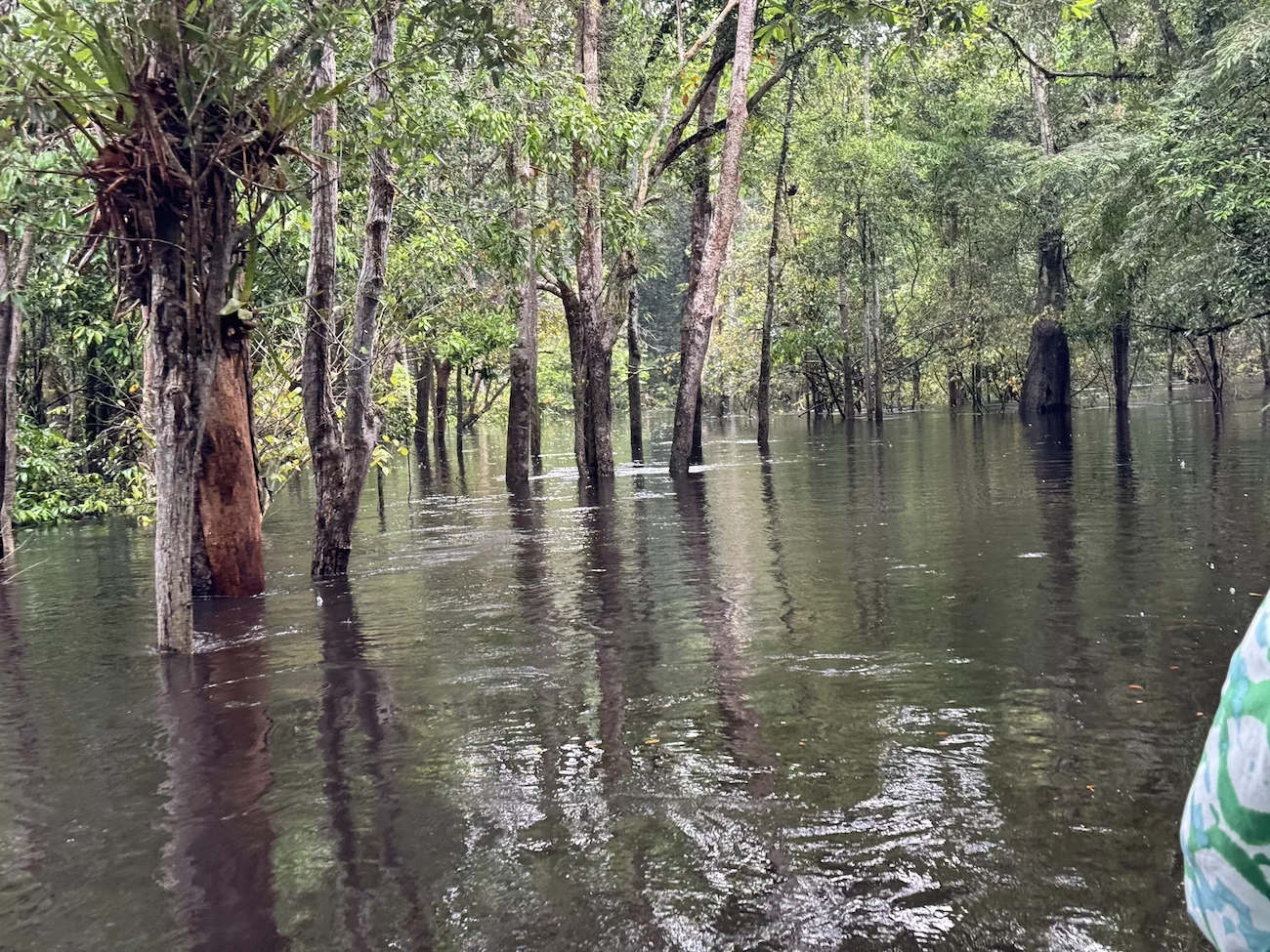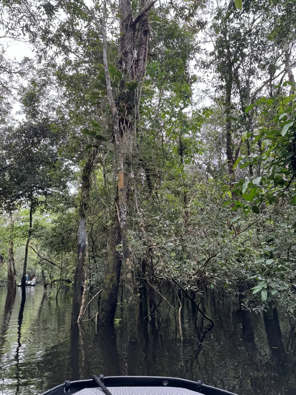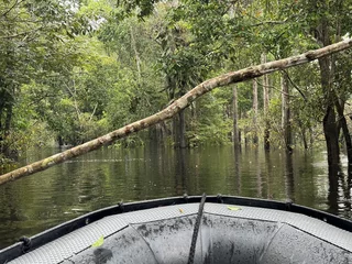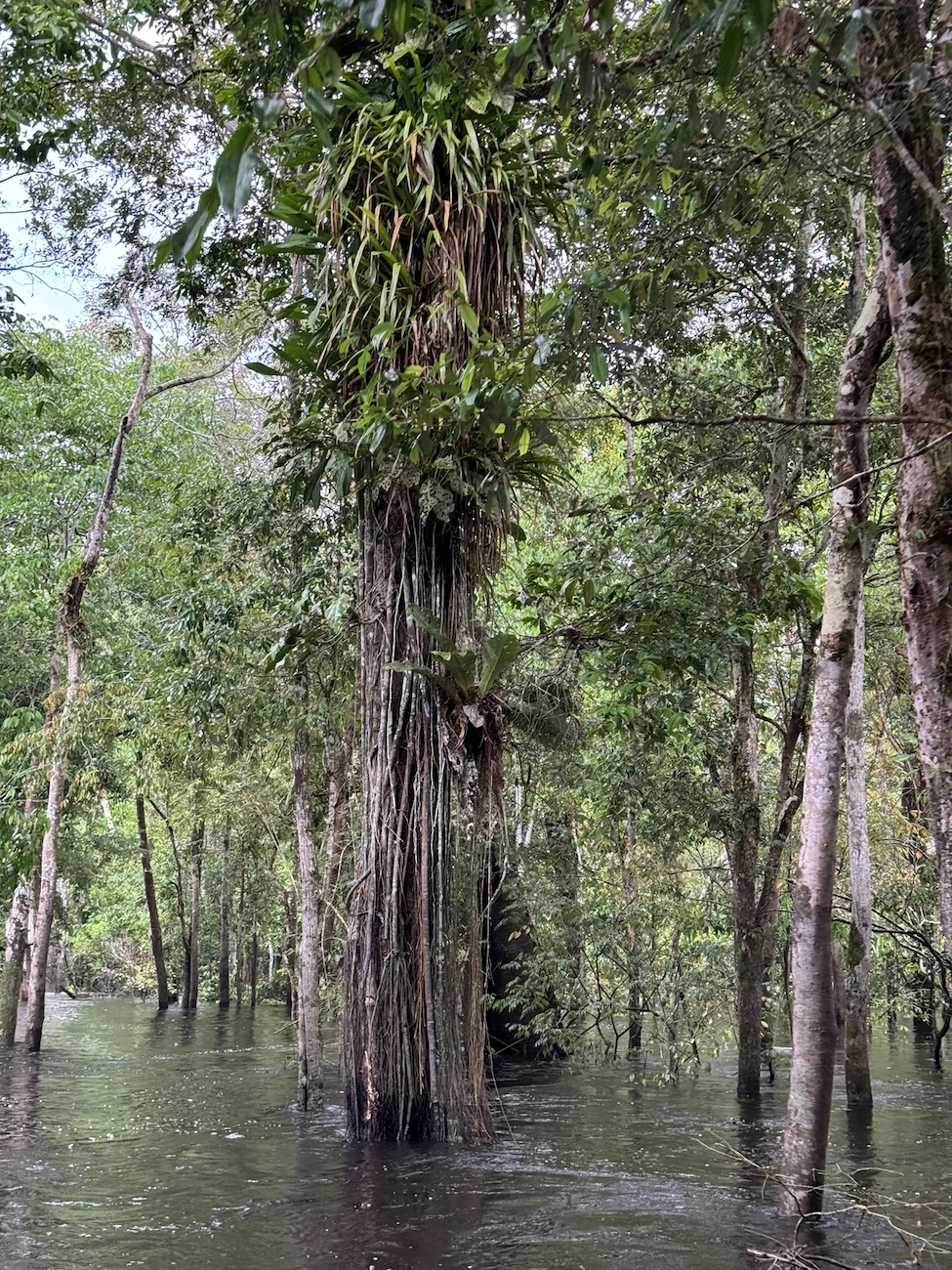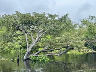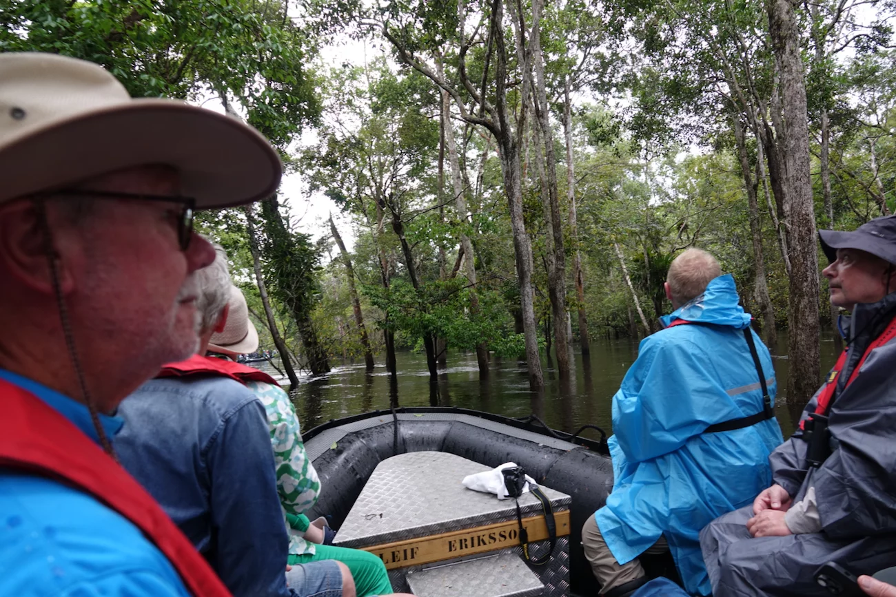 Heute ankern wir im Rio Jutai. Natürlich haben wir auch heute wieder ein strammes Tagesprogramm. Bei zwei Ausfahrten geht es in den Igapó Wald. Dabei handelt es sich um einen immergrünen Überschwemmungswald, der in den Auen entlang der nährstoffarmen Schwarzwasserflüsse zu finden ist. Bei dem jetzigen Wasserstand, fühlt es sich an, als würden wir in Höhe der Baummitte fahren.