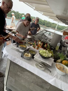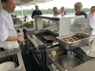 Vorher gab es zum Mittagessen im Lido-Restaurant an der Grillstation leckere Burger, von Beef über Pulled Pork bis Veggie. Dazu sehr leckere Süßkartoffel Pommes.