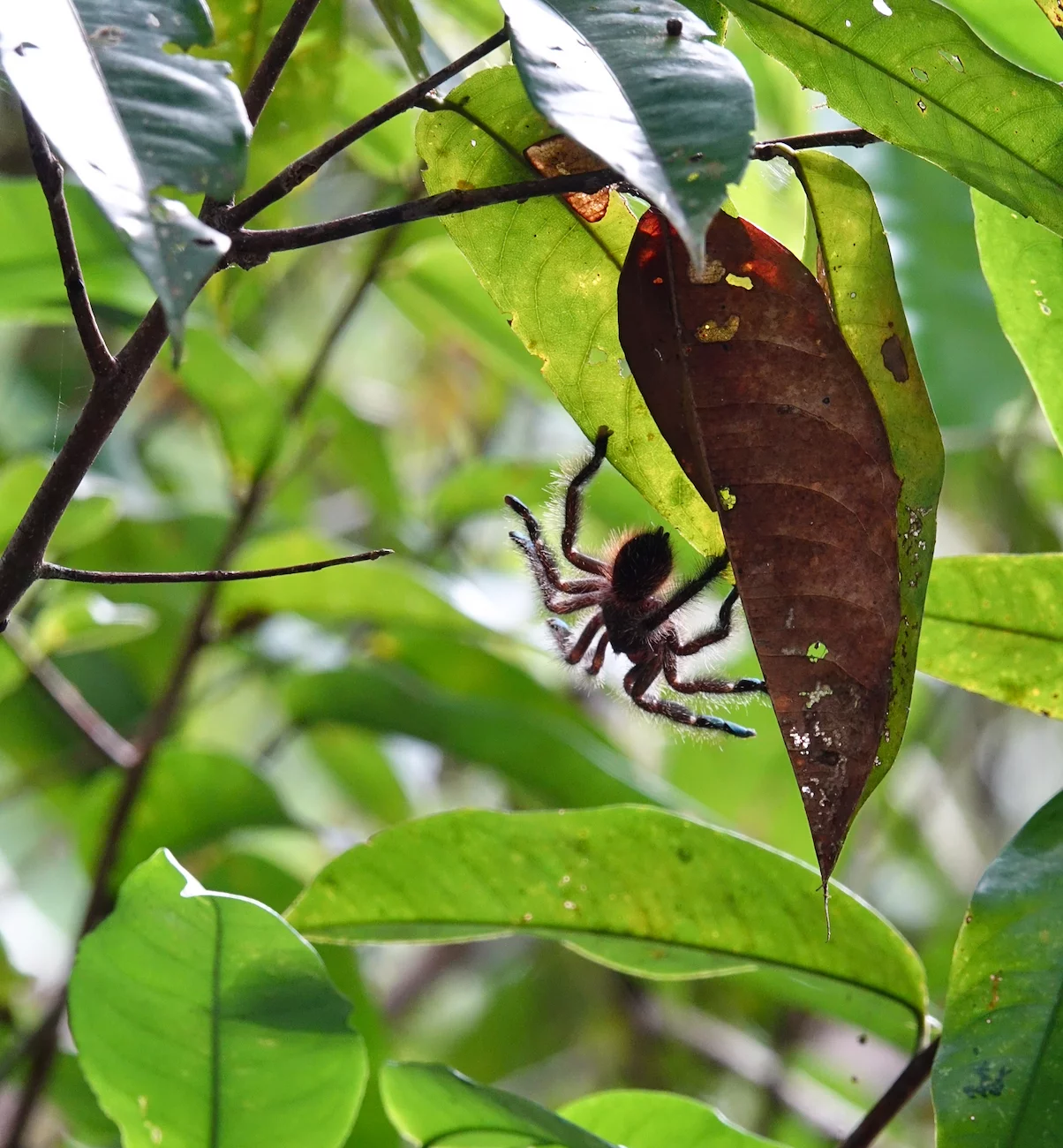 Eine Begegnung der besonderen Art hatten wir, als eine Mitfahrerin plötzlich ausrief: “Stop, Stop, da hängt eine Vogelspinne!!” Also, Rückwärtsgang rein und langsam zurückgleiten. Nun bin ich auf ein solches “Rendezvous” nicht unbedingt scharf, aber neugierig war ich doch. Tatsächlich hing sie am Blatt eines Busches, unter dem wir ein paar Sekunden vorher durch gefahren sind. Kein sehr angenehmer Gedanke.