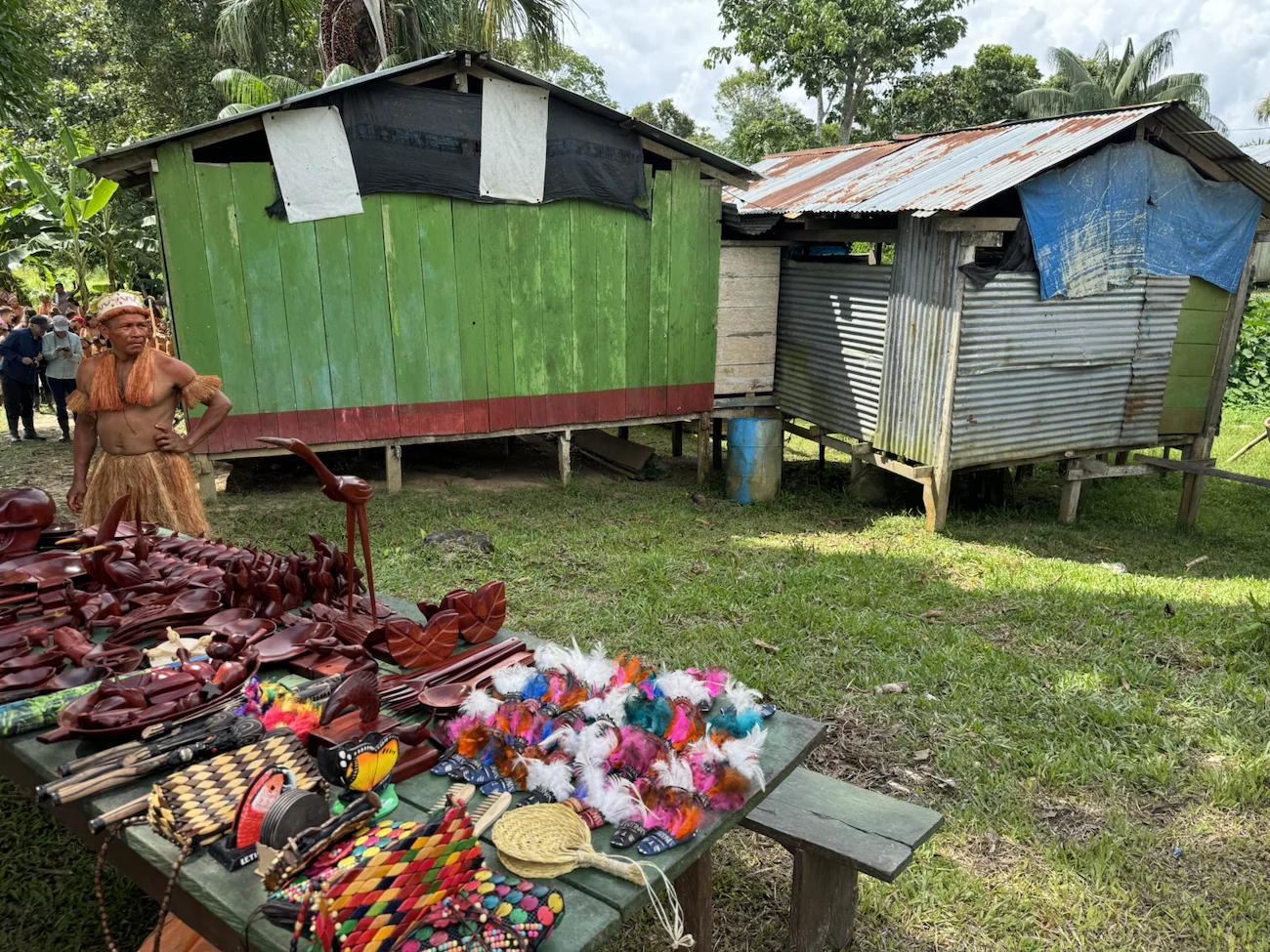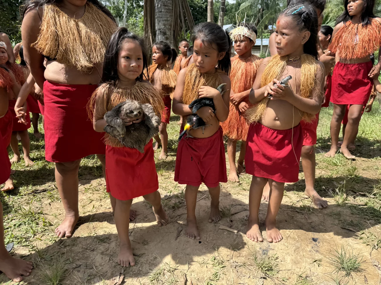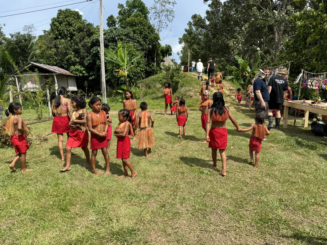 Die etwa 480 Bewohner sind gut auf uns vorbereitet! Viele der haben traditionelle Kleidung angelegt, einige führen Tänze und Musik vor. Als Geste der Freundschaft werden wir im Gesicht mit roter, zum Glück abwaschbarer, Farbe vom Häuptling persönlich bemalt. Kleine Kinder präsentieren uns junge Wildtiere, die sie hier eine Weile als Haustiere halten und die dann freigelassen werden, z.B. Affenarten, Faultiere, und verschiedene Papageien. Stolz zeigen sie uns bei einem Rundgang ihr Dorf.