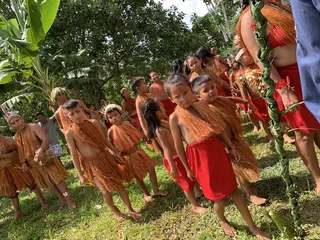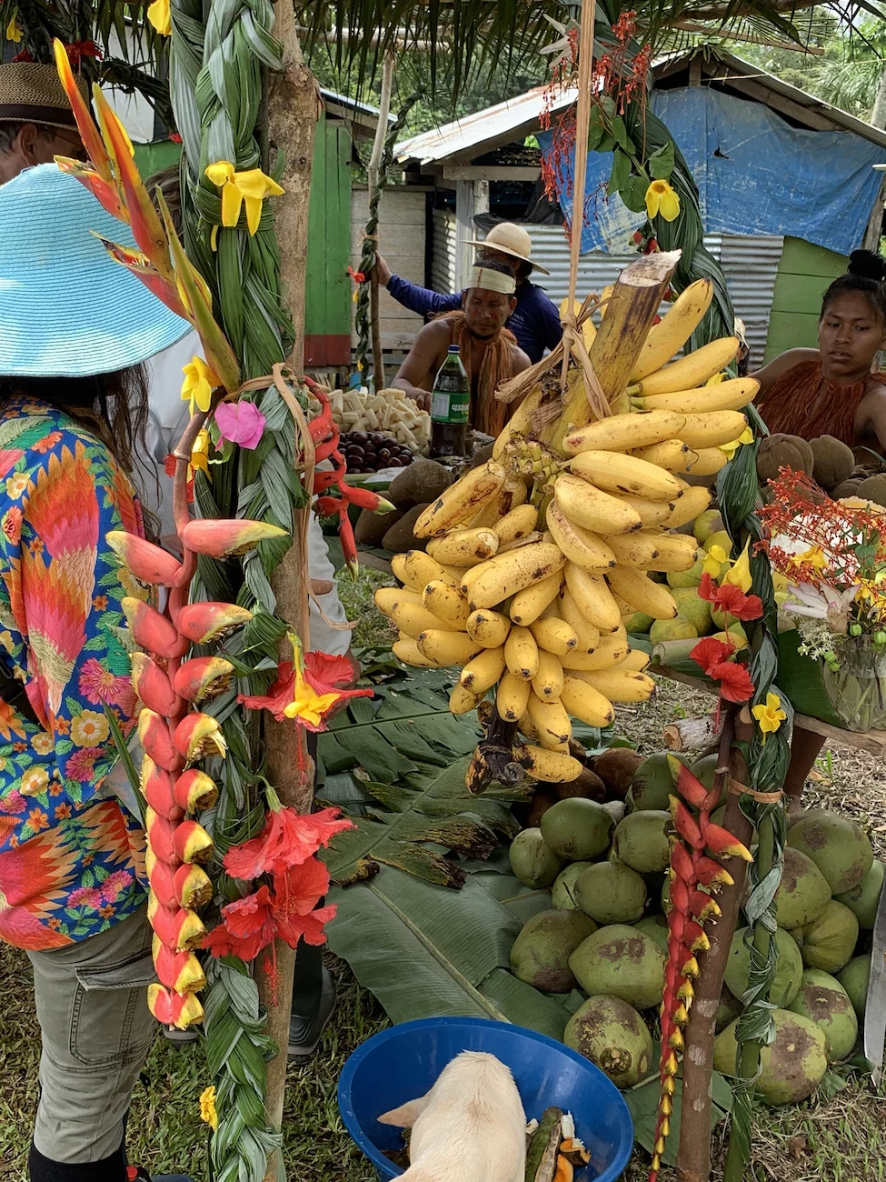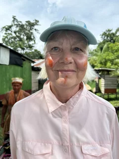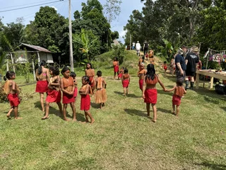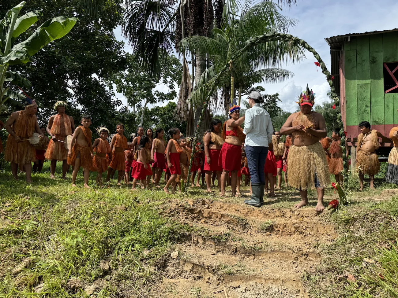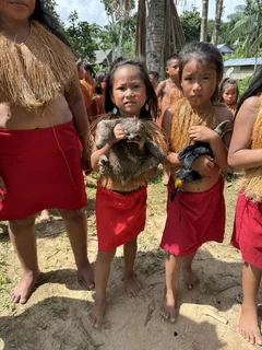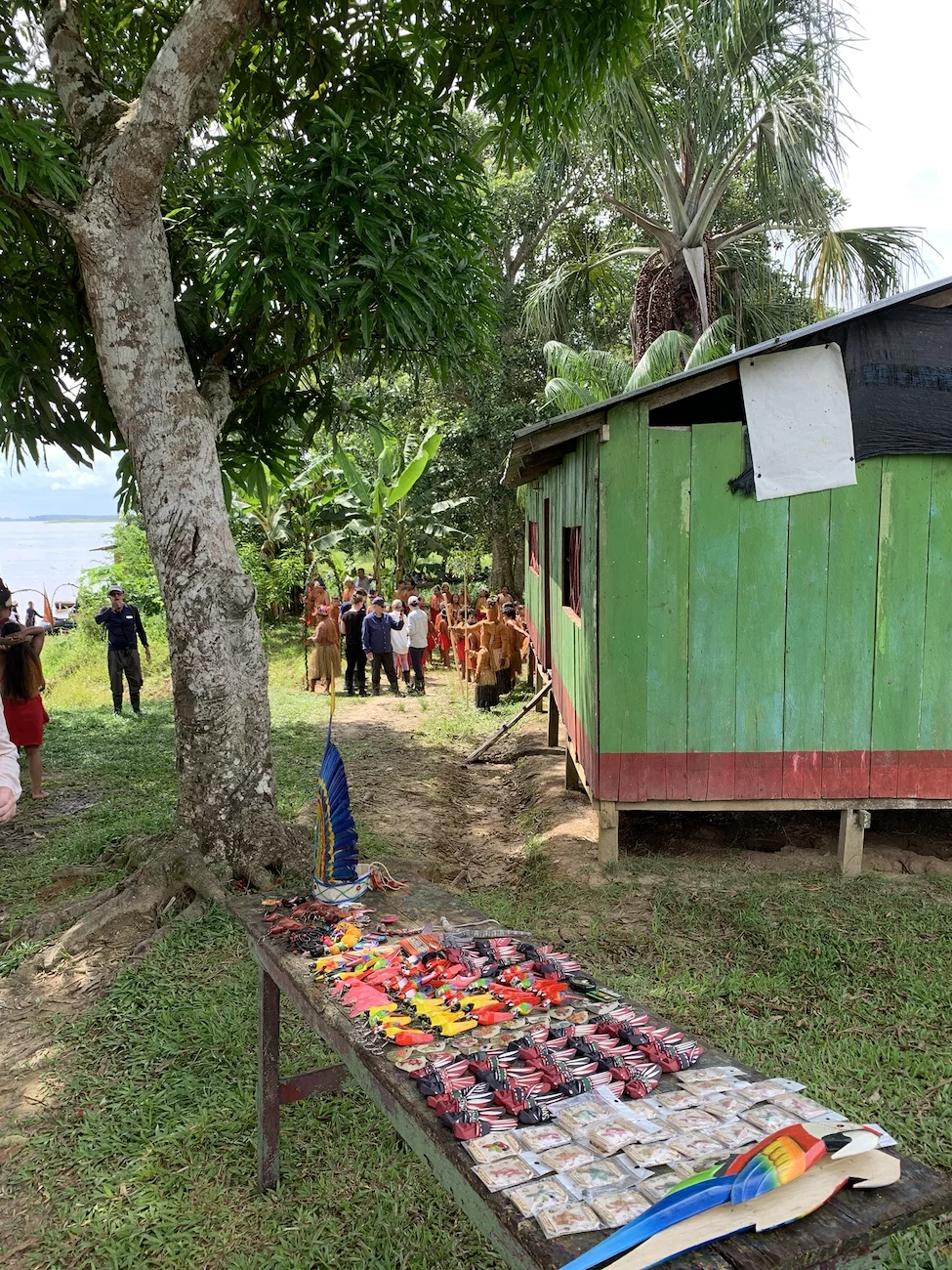 Die etwa 480 Bewohner sind gut auf uns vorbereitet! Viele der haben traditionelle Kleidung angelegt, einige führen Tänze und Musik vor. Als Geste der Freundschaft werden wir im Gesicht mit roter, zum Glück abwaschbarer, Farbe vom Häuptling persönlich bemalt. Kleine Kinder präsentieren uns junge Wildtiere, die sie hier eine Weile als Haustiere halten und die dann freigelassen werden, z.B. Affenarten, Faultiere, und verschiedene Papageien. Stolz zeigen sie uns bei einem Rundgang ihr Dorf.