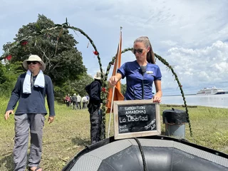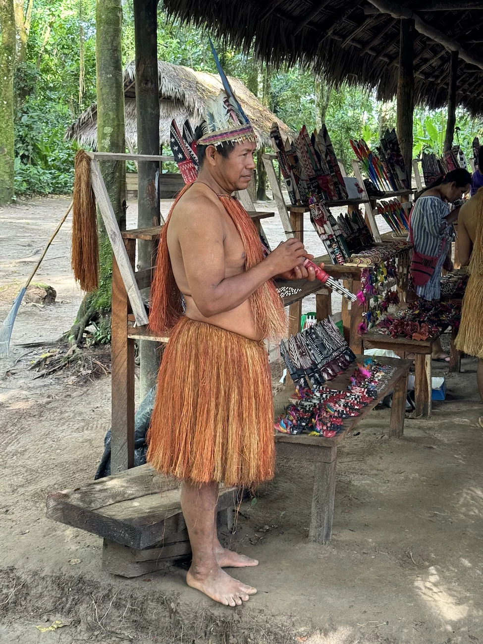 Über Mittag verholt die Hanseatic Inspiration nur sieben Seemeilen weiter stromaufwärts. Hier liegt La Libertad („Die Freiheit“), ein weiteres Dorf von Yagua-Indianern, die vor etwa 30 Jahren „aus den Wäldern Perus“ von einem Agenten hierhergebracht wurden, um ein besseres Leben zu finden und vom Tourismus zu profitieren. Auch dieses Dorf wird von Hapag Lloyd Cruises aktiv unterstützt.