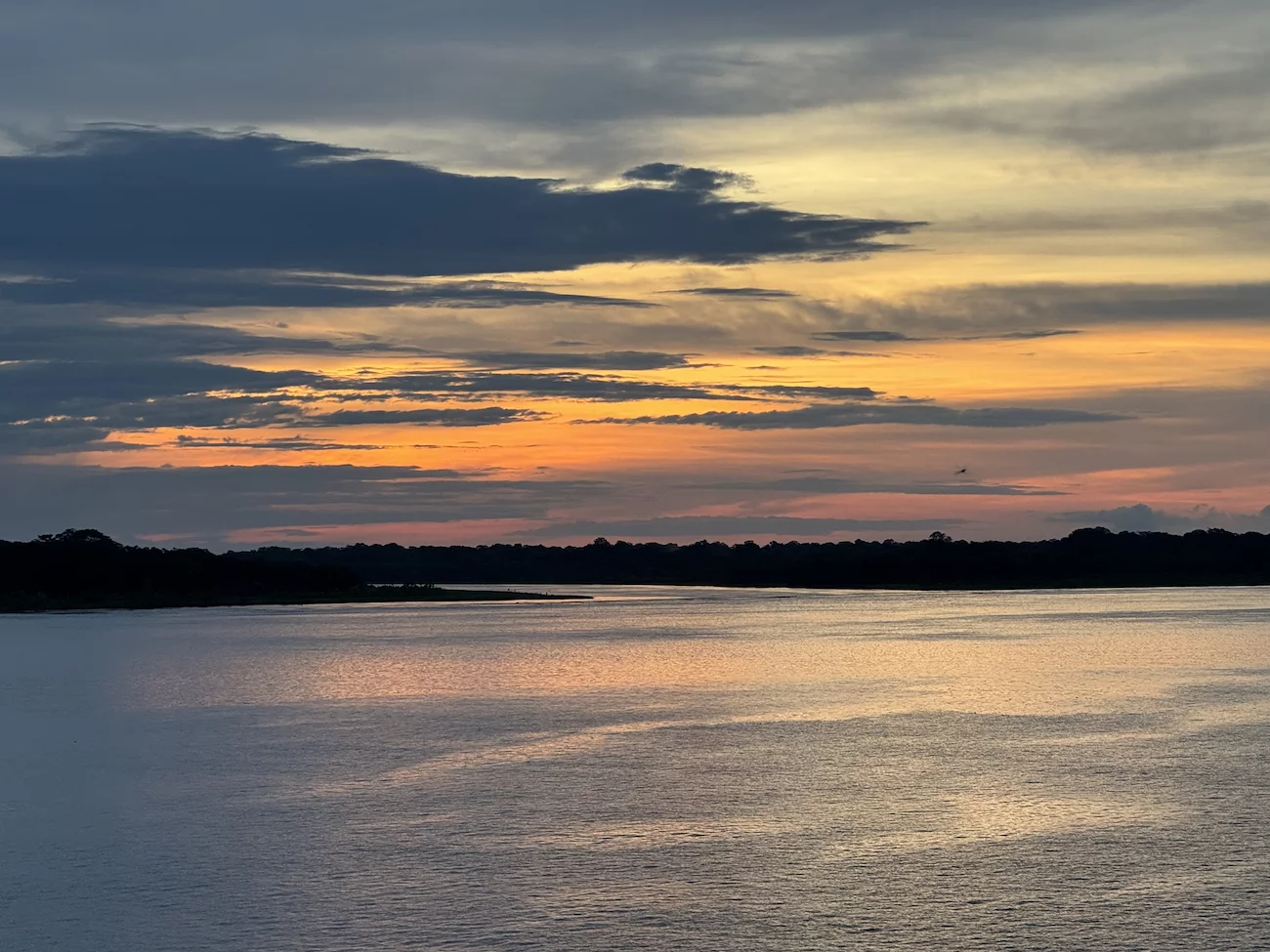 Dann geht es zurück aufs Schiff, und wir fahren weiter den großen Strom hinauf in einen traumhaften Sonnenuntergang, der hier bereits um 17:15 Uhr einsetzt. Dann muss man schnell sein, denn er dauert wirklich nur ein paar Minuten und schon ist es stockdunkle Nacht. In solchen Momenten müssen wir uns manchmal kneifen, ob das alles was wir hier Tag für Tag erleben nicht doch bloss ein Traum ist. Ja , es ist einer, aber er ist sehr real!!