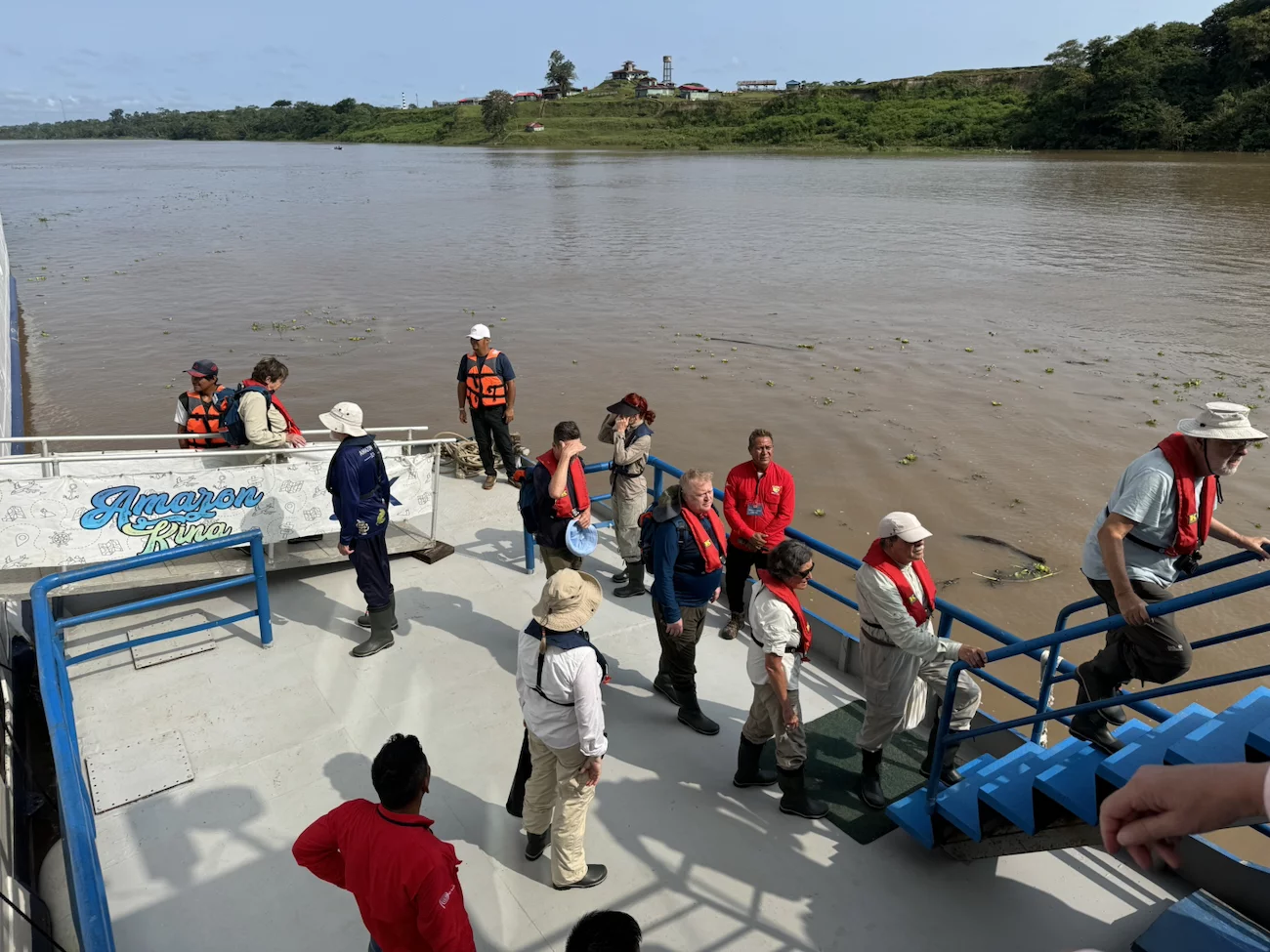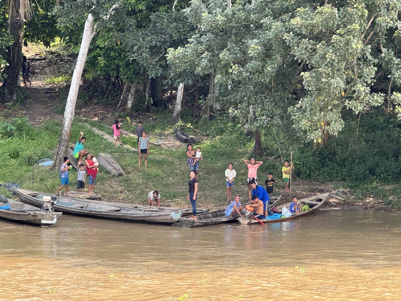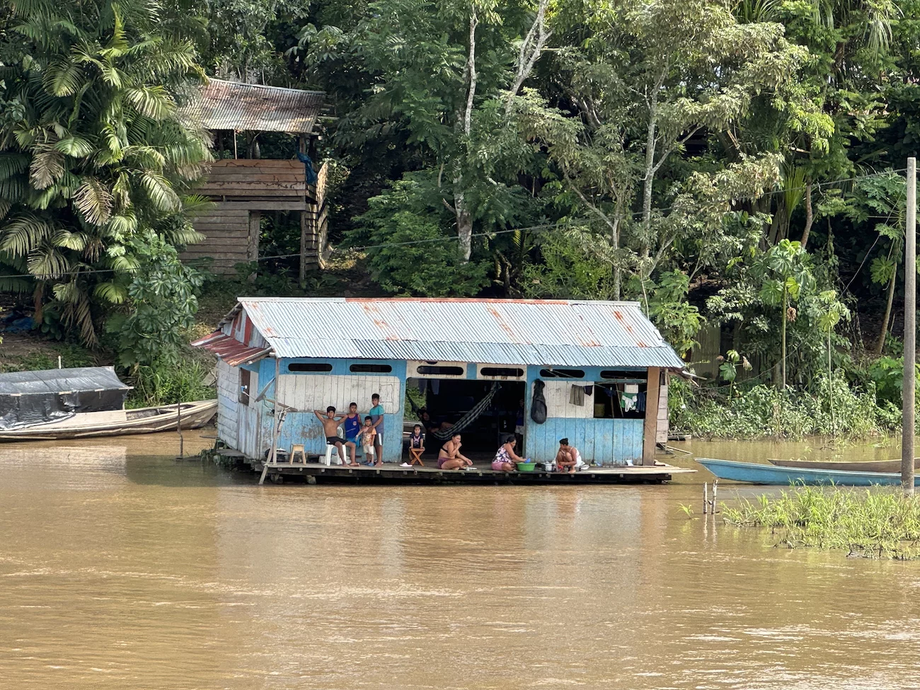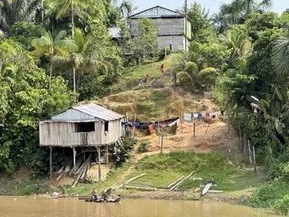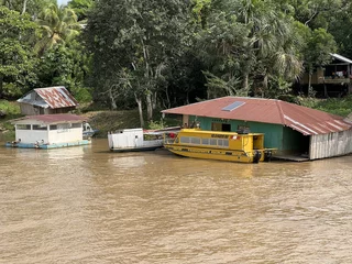 Auf der Amazonas King gab es Erläuterungen von einem lokalen Tour Guide zu den beiden Stämmen, deren Zusammenleben, und zu dem was uns erwartet. Wie schon in anderen Dörfern, unterstützt Hapag Lloyd Cruises auch hier regelmäßig mit Schulmitteln für die Kinder und soweit möglich mit anderen Dingen die benötigt werden. Die Fahrt dauerte 45 Minuten und bot uns ein ähnliches Bild wie das, was wir schon vorher in anderen kleinen Dörfern entlang der Ufer des Amazonas und seiner Nebenflüsse gesehen hatten. Ab und zu treffen wir unsere Zodiacs, die natürlich ihren Schnelligkeitsvorteil nutzen, nochmal einen schnellen Blick in den einen oder anderen Seitenkanal zu werfen. Immer wieder wird uns von den Einheimischen freundlich vom Ufer aus zu gewunken.