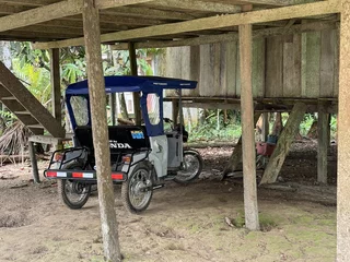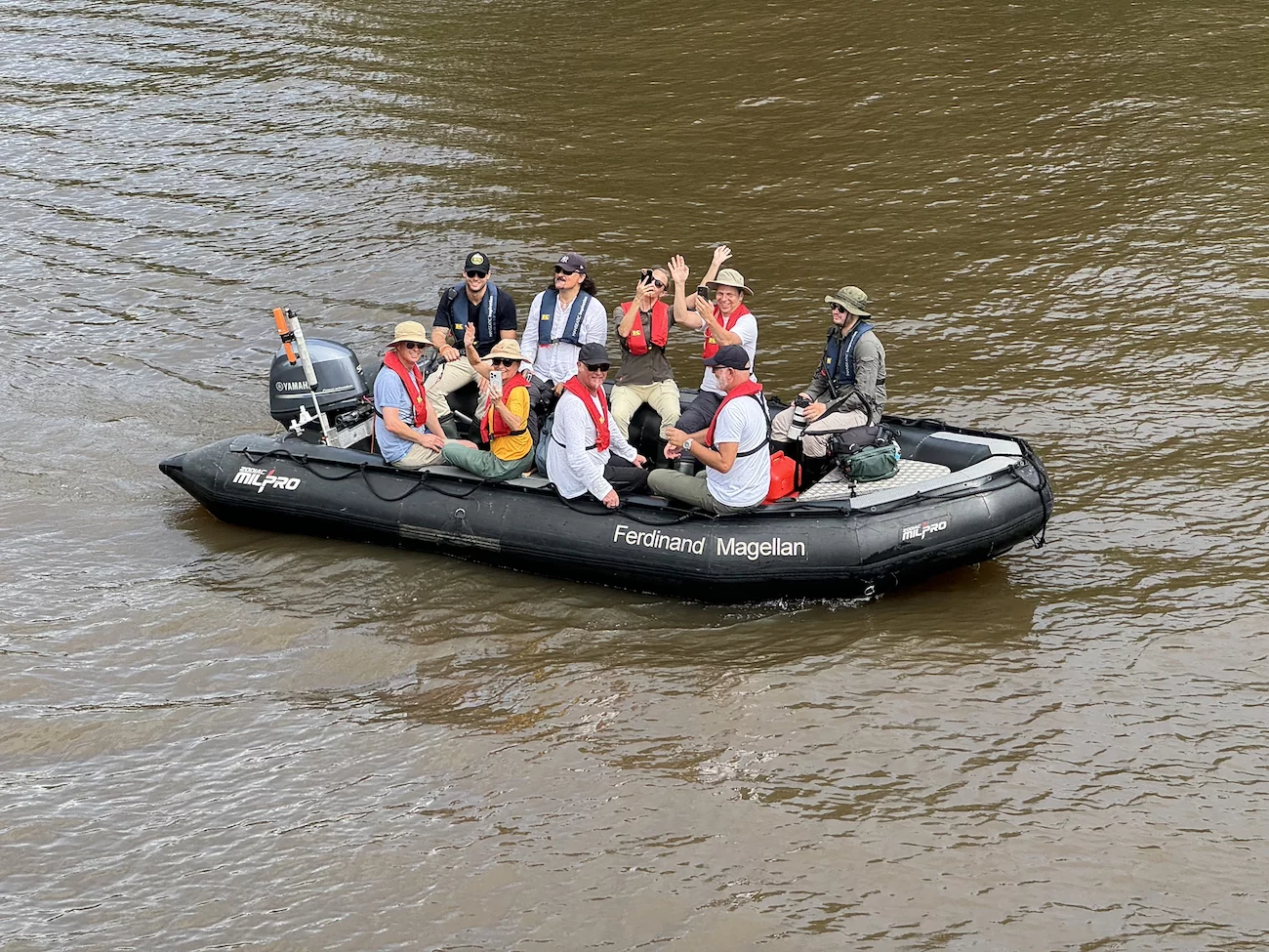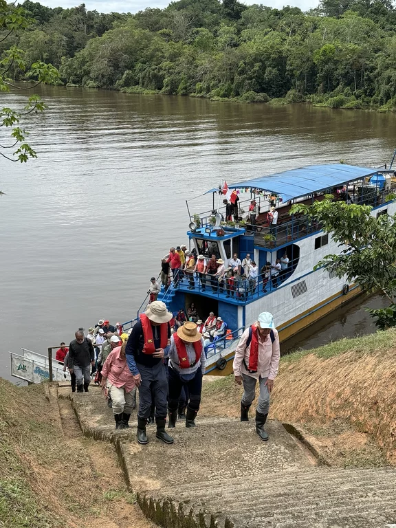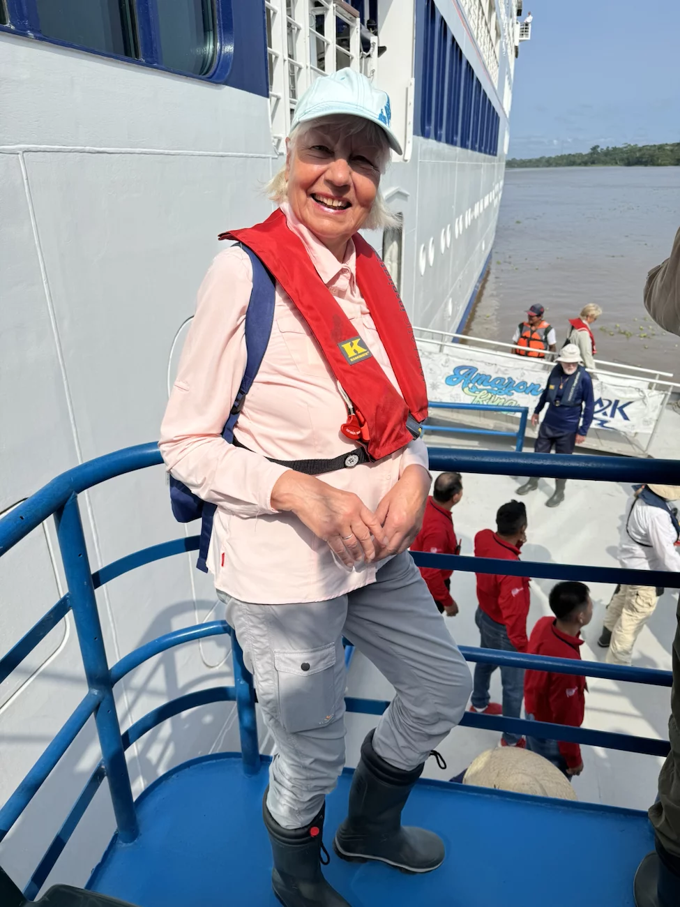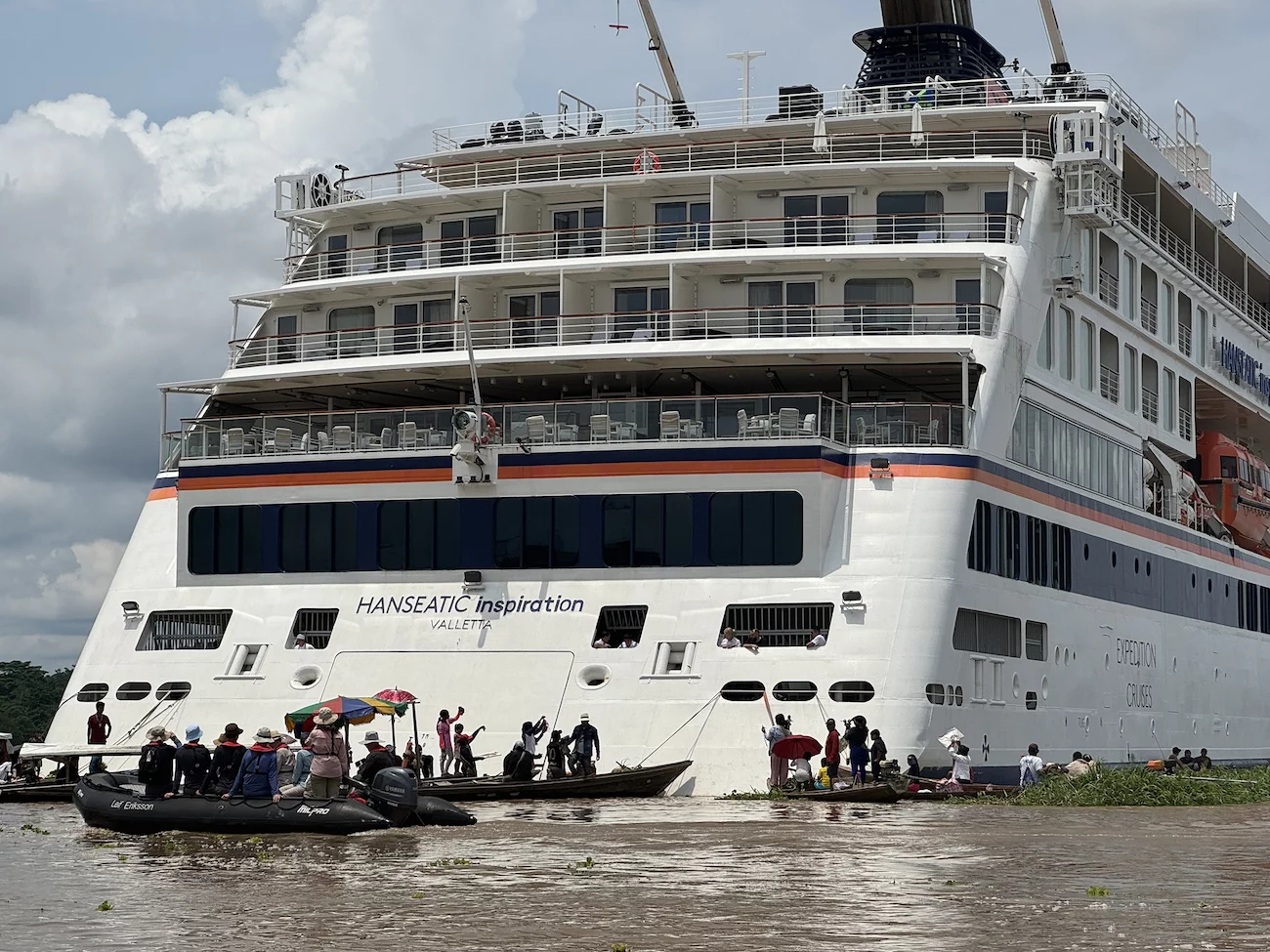 Auf der Amazonas King gab es Erläuterungen von einem lokalen Tour Guide zu den beiden Stämmen, deren Zusammenleben, und zu dem was uns erwartet. Wie schon in anderen Dörfern, unterstützt Hapag Lloyd Cruises auch hier regelmäßig mit Schulmitteln für die Kinder und soweit möglich mit anderen Dingen die benötigt werden. Die Fahrt dauerte 45 Minuten und bot uns ein ähnliches Bild wie das, was wir schon vorher in anderen kleinen Dörfern entlang der Ufer des Amazonas und seiner Nebenflüsse gesehen hatten. Ab und zu treffen wir unsere Zodiacs, die natürlich ihren Schnelligkeitsvorteil nutzen, nochmal einen schnellen Blick in den einen oder anderen Seitenkanal zu werfen. Immer wieder wird uns von den Einheimischen freundlich vom Ufer aus zu gewunken.