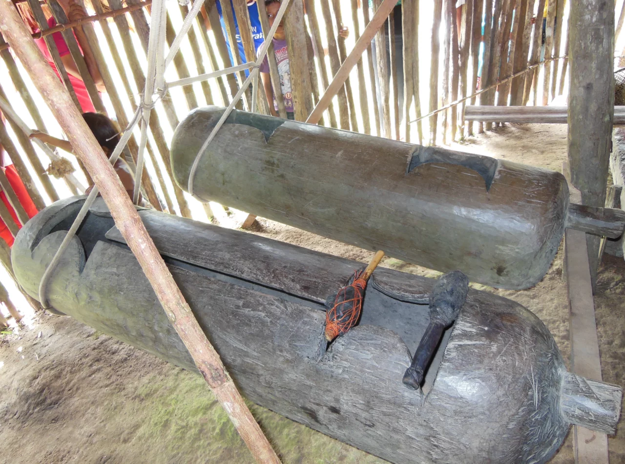 Die Präsentation begann mit der Vorführung zur Kommunikation der beiden Stämme untereinander. Dazu wird ein Paar aus einer männlichen und einer weiblichen Schlitztrommel genutzt. Die Sprachen der Huitoto und Bora sind Tonalsprachen, bei denen die Tonhöhe bedeutungstragend ist. Die Sprache bekommt dadurch eine natürliche Melodie. Diese kann durch die verschieden gestimmten Zungen der ausgehöhlten Trommeln nachgeahmt werden. Deshalb dienen diese riesigen, weittragenden Schlitztrommeln bis heute auch dazu, Botschaften in andere Dörfer zu übermitteln.