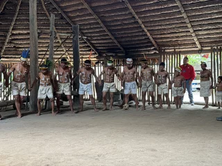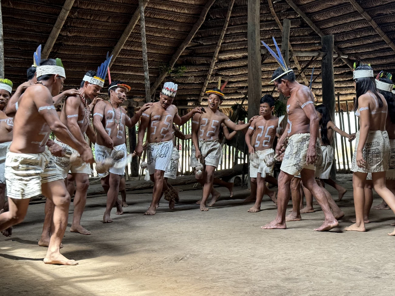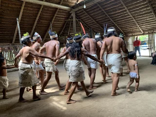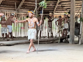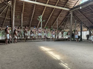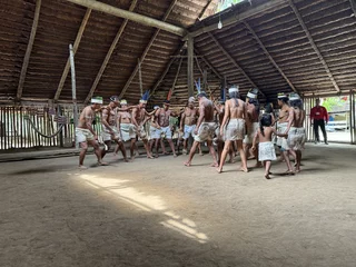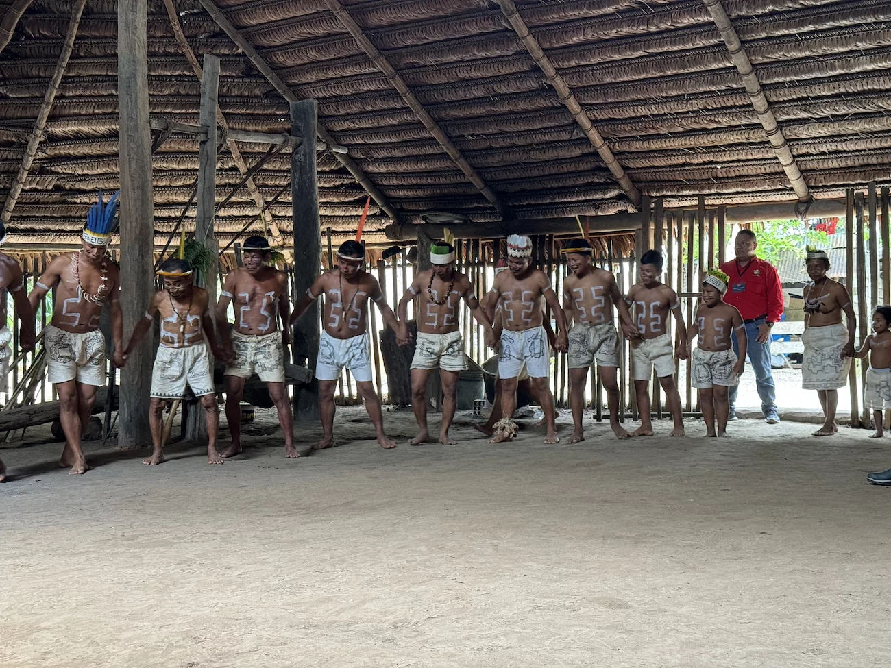 Oben angekommen führte man uns direkt zur Maloka, dem Gemeinschaftshaus. Wir wurden vom Stammesältesten und seiner Frau begrüßt. Zunächst fand der Austausch von Willkommensgeschenken statt. Anschließend bekamen wir eine kurze Erklärung zu den Tänzen, die man uns zeigen wollte.