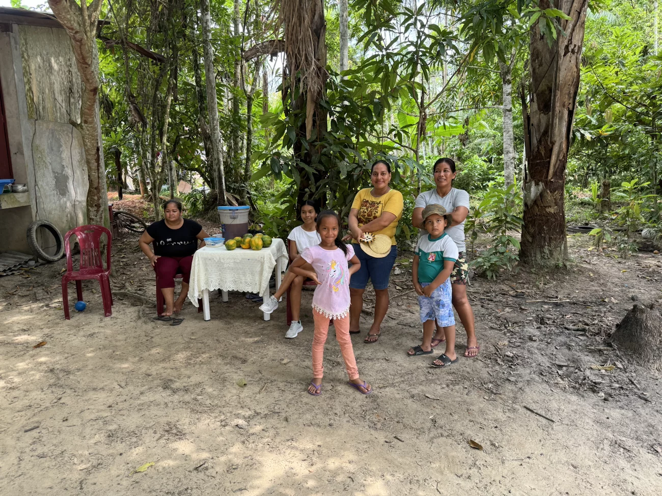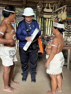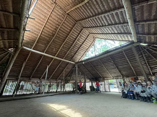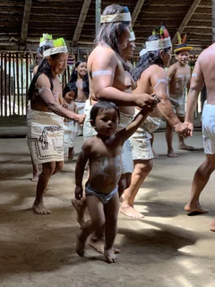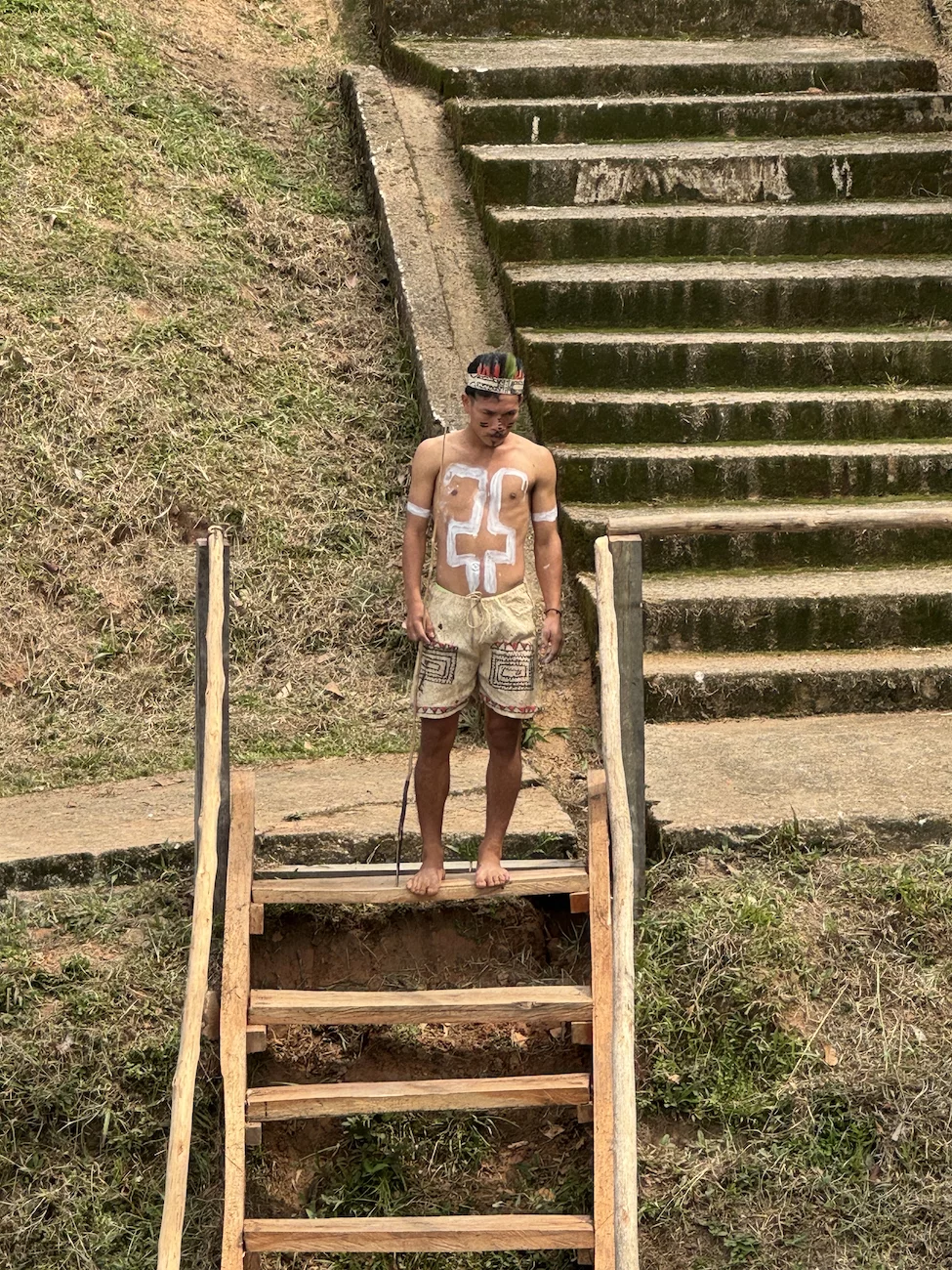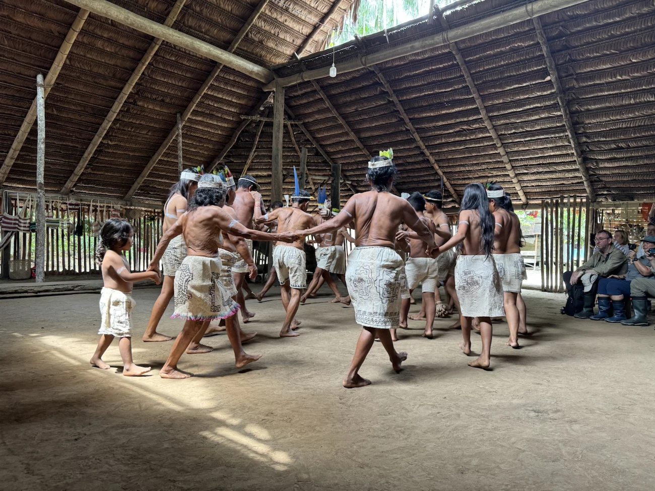Oben angekommen führte man uns direkt zur Maloka, dem Gemeinschaftshaus. Wir wurden vom Stammesältesten und seiner Frau begrüßt. Zunächst fand der Austausch von Willkommensgeschenken statt. Anschließend bekamen wir eine kurze Erklärung zu den Tänzen, die man uns zeigen wollte.