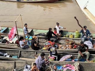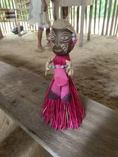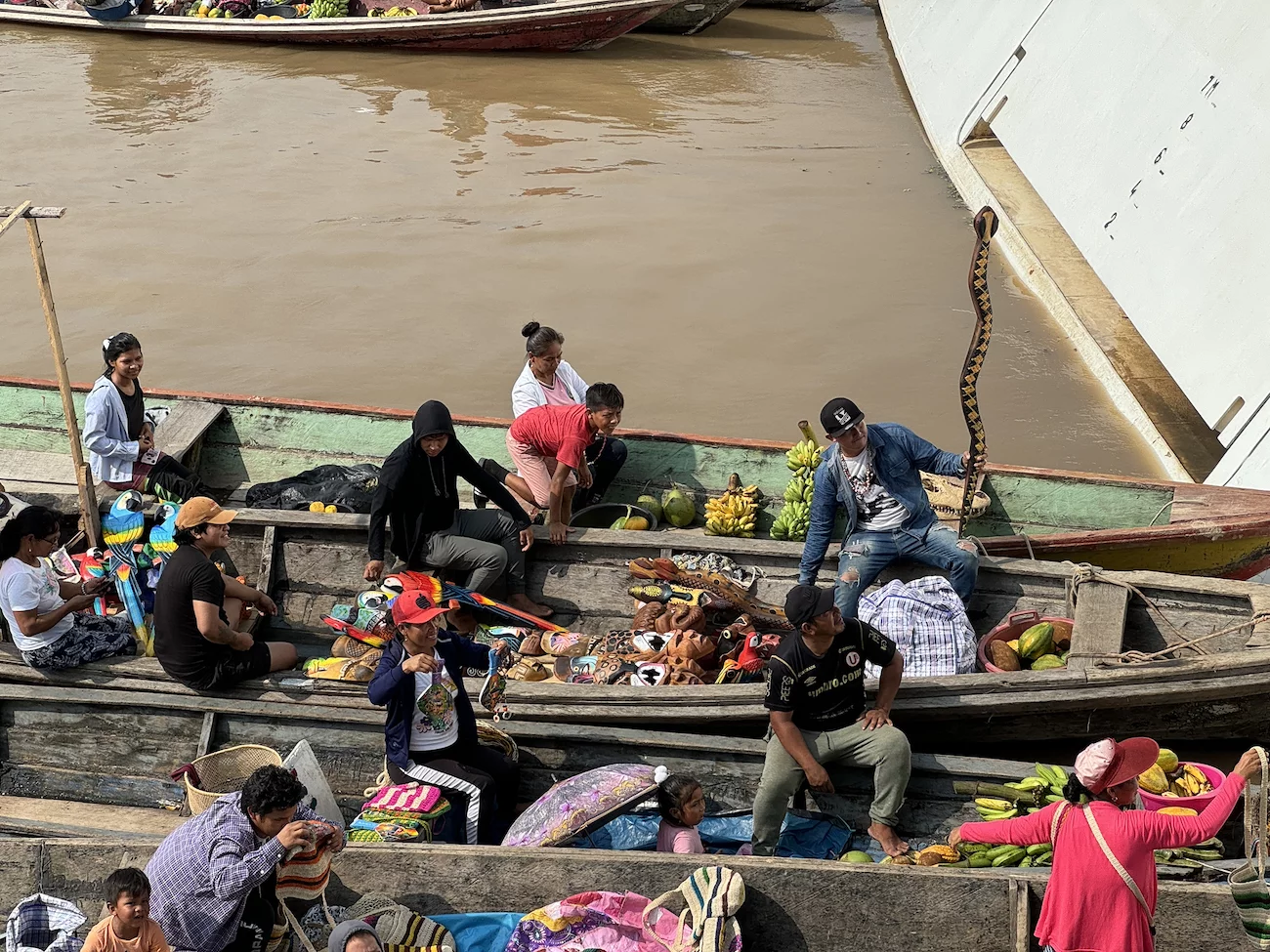 Wer hier im Dorf kein Souvenir finden konnte , bekam nach der Rückkehr zum Schiff über Mittag noch einmal Gelegenheit. Da hatten wieder reichlich lokale Boote an unserer Marina fest gemacht. Unter großem Gefeilsche kann getauscht und gekauft werden. Im Angebot sind allerdings auch Dinge, die wir nicht einführen dürfen wie Ozelot-Felle, Krokodil-Schädel und riesige Krallen von Ameisenbären. Der Gipfel war ein lebendiges Ferkel.