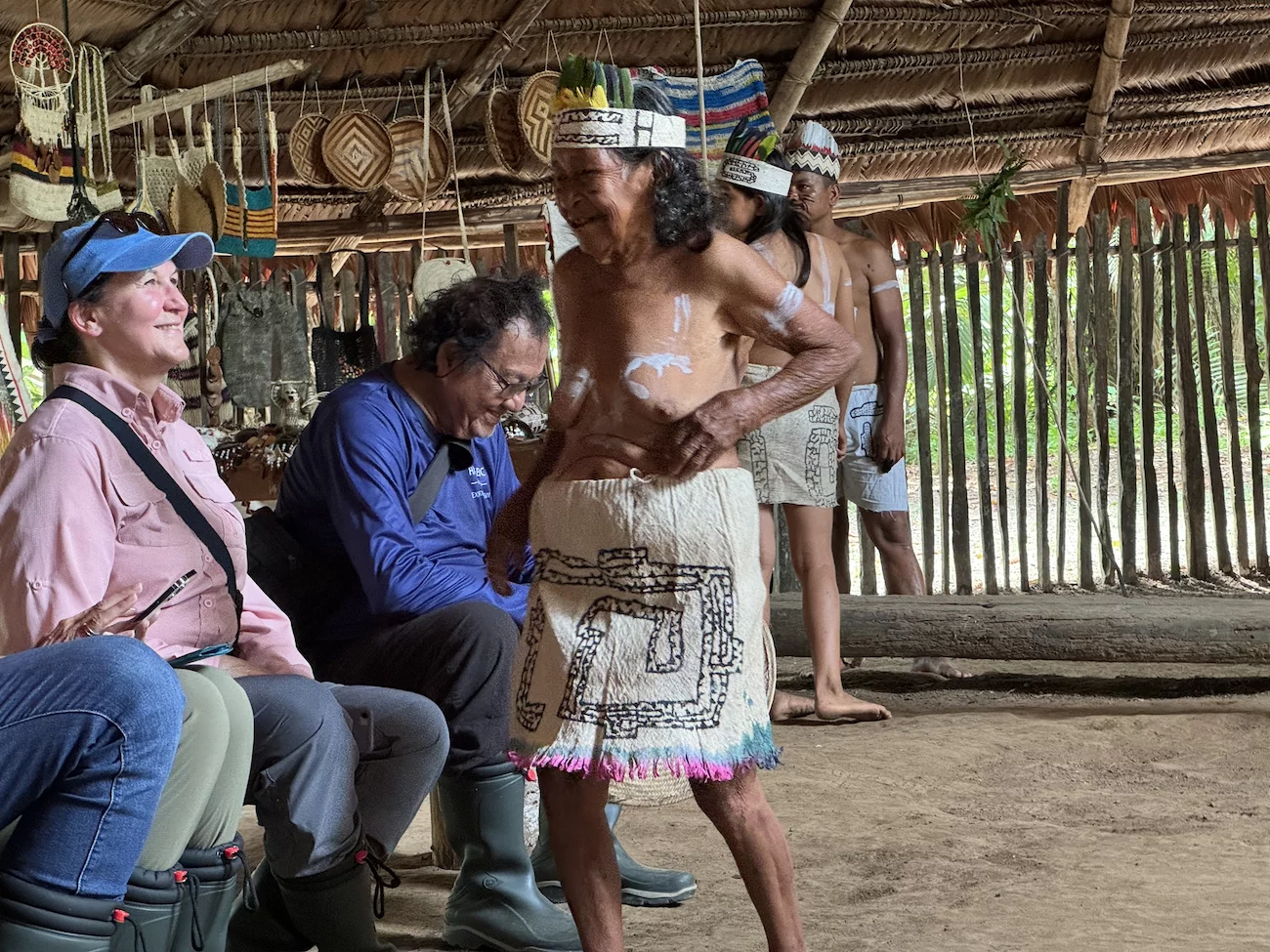 Die Fahrt zu der Ortschaft stellt die Crew und besonders das Expeditionsteam vor gewisse logistische Herausforderung, denn es gibt kein lokales Boot, das groß genug ist für alle expeditionswütigen Passagiere. Also wurde aufgeteilt. Die Hälfte der Gäste fuhr mit den Zodiacs in die Huitoto-Dorfhälfte. Dort gab es einen geführten Spaziergang mit Erklärungen und eine Tanzvorführung in der Maloka, dem Gemeinschaftshaus.