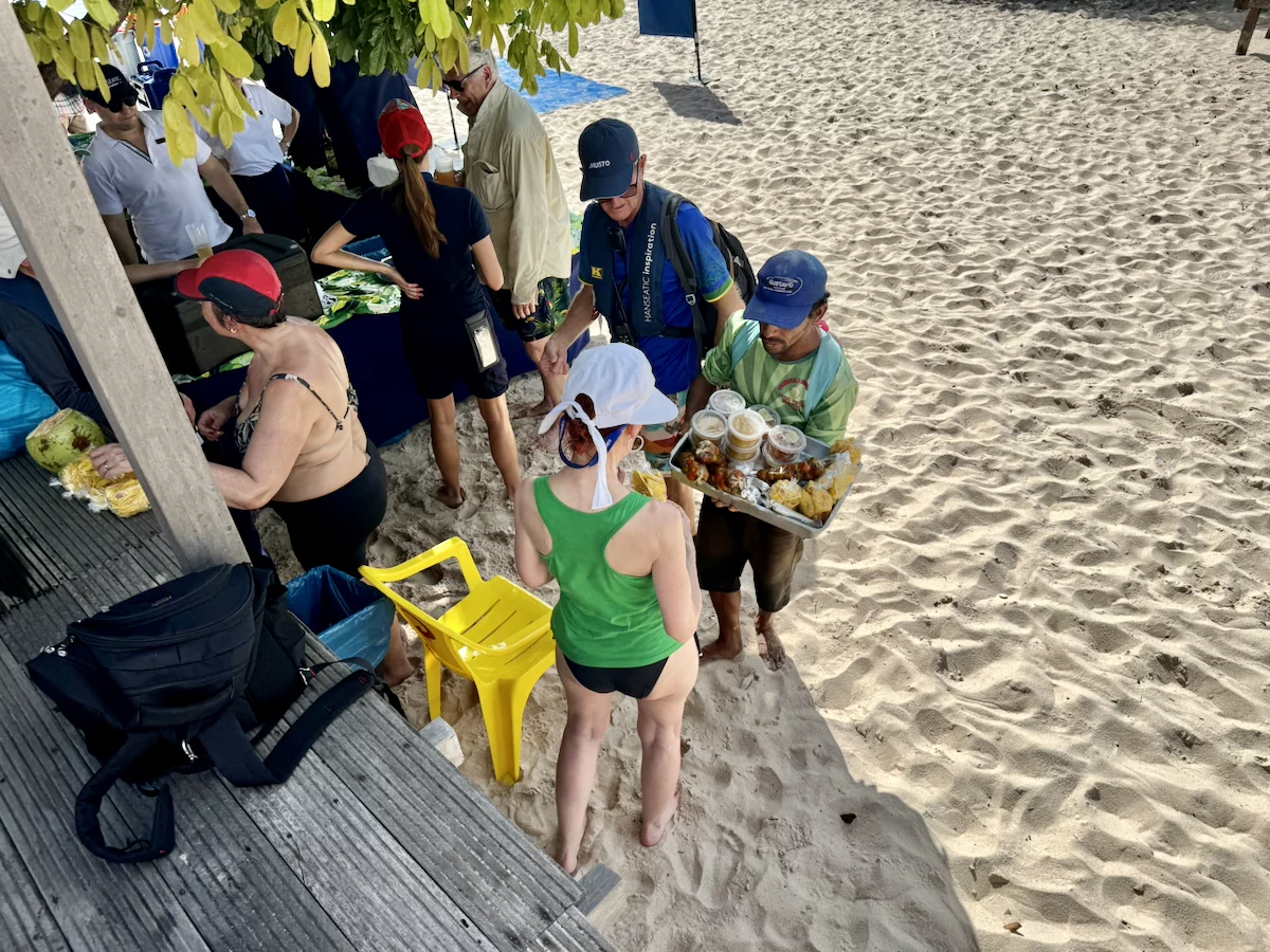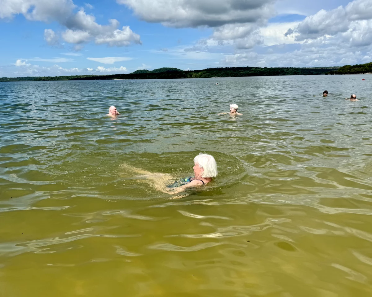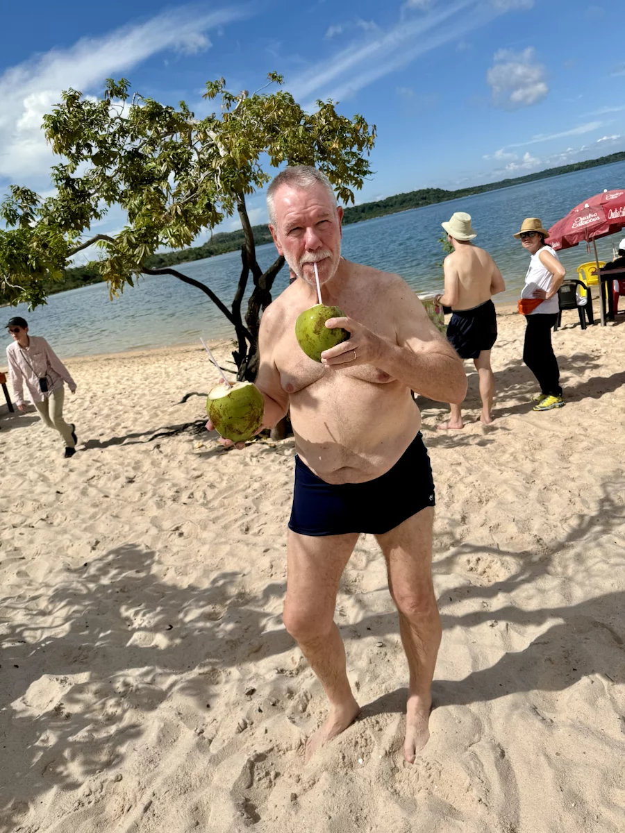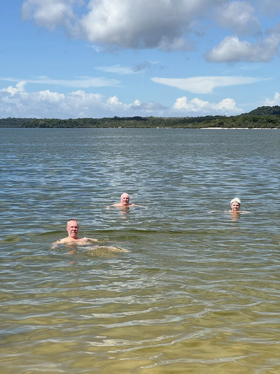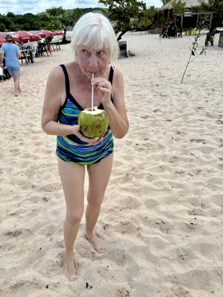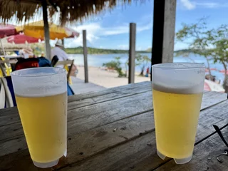 Neben dem BBQ stand für den Nachmittag aber auch noch Baden und Plantschen im Amazonas auf dem Programm. Abkühlung war davon bei der Wassertemperatur zwar nicht wirklich zu erwarten, denn dessen Temperatur lag mit 30° eher im Badewannenbereich. Aber natürlich haben wir die Gelegenheit genutzt, um den Piranhas einmal Guten Tag zu sagen. Wann bekommt man schonmal die Gelegenheit im Amazonas zu baden?? Es war eine sehr willkommene Abwechslung und hat viel Spaß gemacht. Etwas Kühles zu trinken gab es auch, denn das Küchenteam hatte noch schnell eine kleine "Versorgungsstation" an den Strand gezaubert.