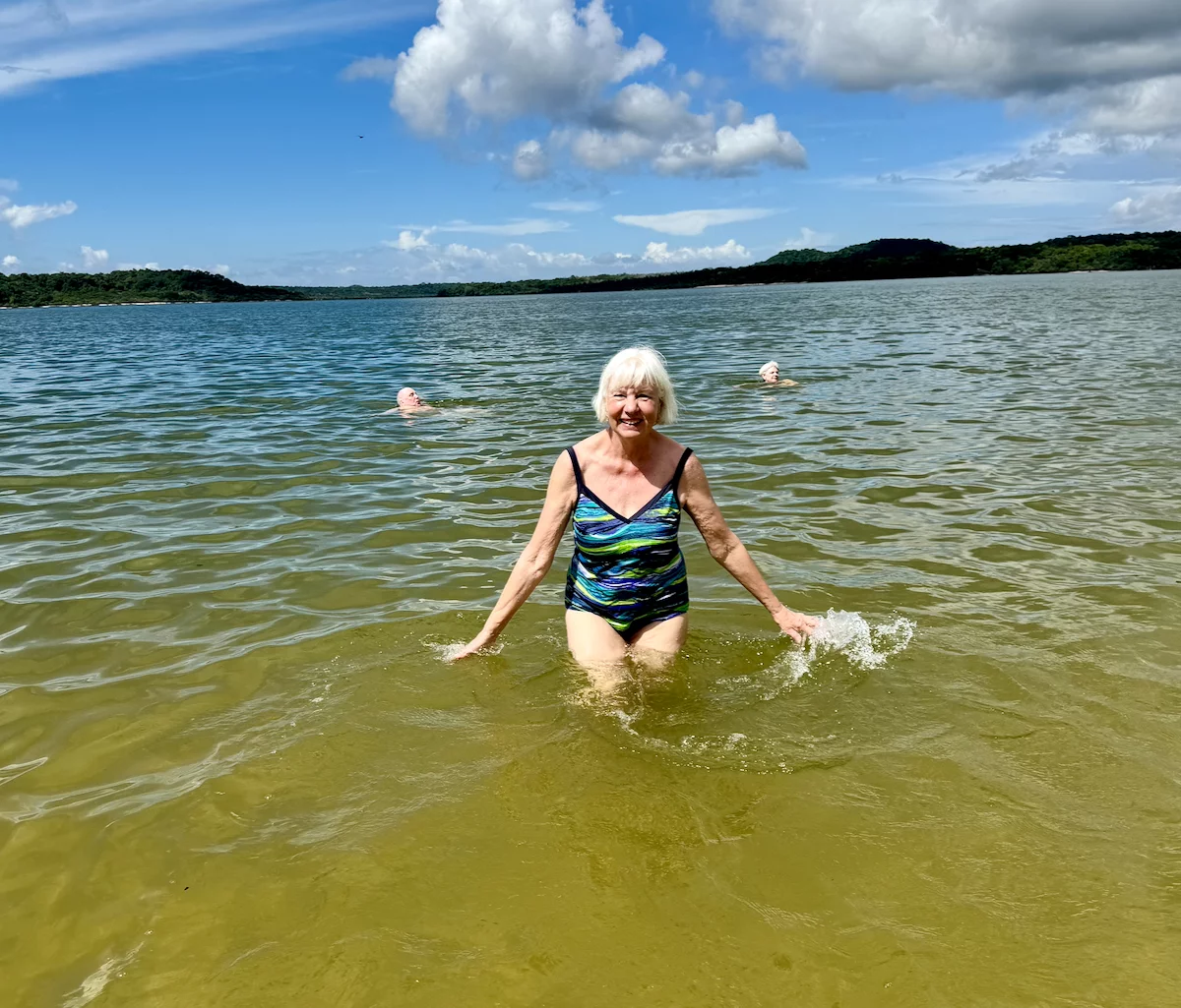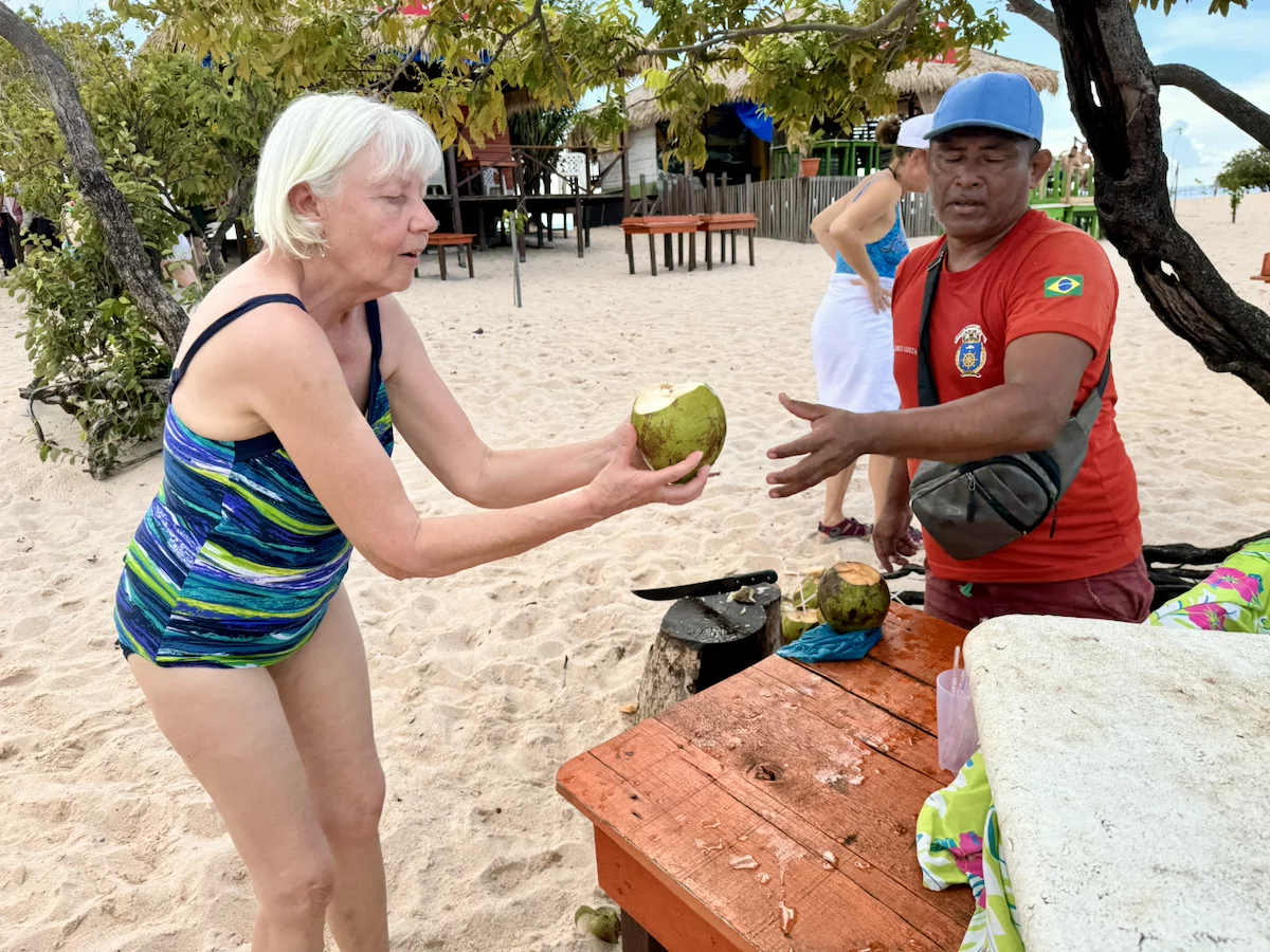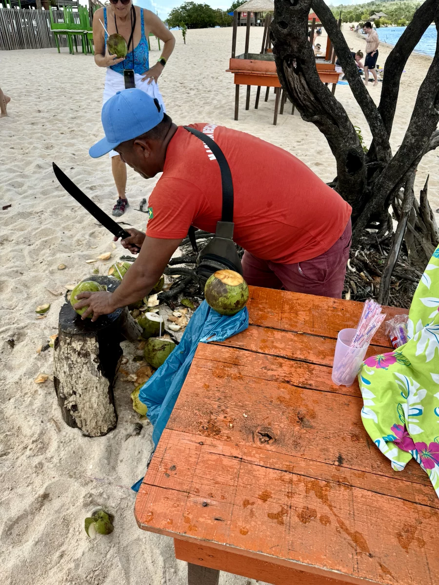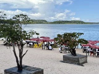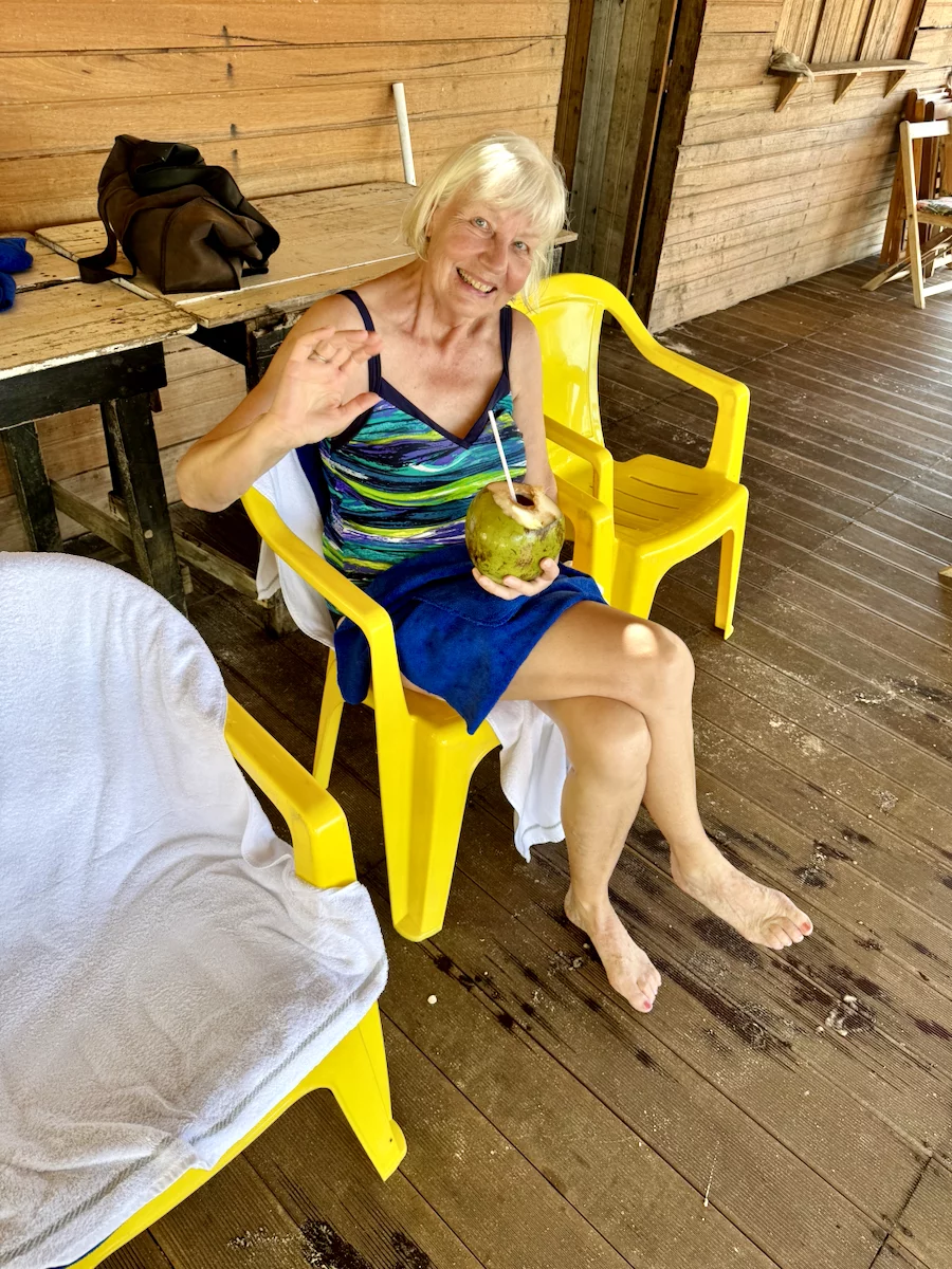 Neben dem BBQ stand für den Nachmittag aber auch noch Baden und Plantschen im Amazonas auf dem Programm. Abkühlung war davon bei der Wassertemperatur zwar nicht wirklich zu erwarten, denn dessen Temperatur lag mit 30° eher im Badewannenbereich. Aber natürlich haben wir die Gelegenheit genutzt, um den Piranhas einmal Guten Tag zu sagen. Wann bekommt man schonmal die Gelegenheit im Amazonas zu baden?? Es war eine sehr willkommene Abwechslung und hat viel Spaß gemacht. Etwas Kühles zu trinken gab es auch, denn das Küchenteam hatte noch schnell eine kleine "Versorgungsstation" an den Strand gezaubert.