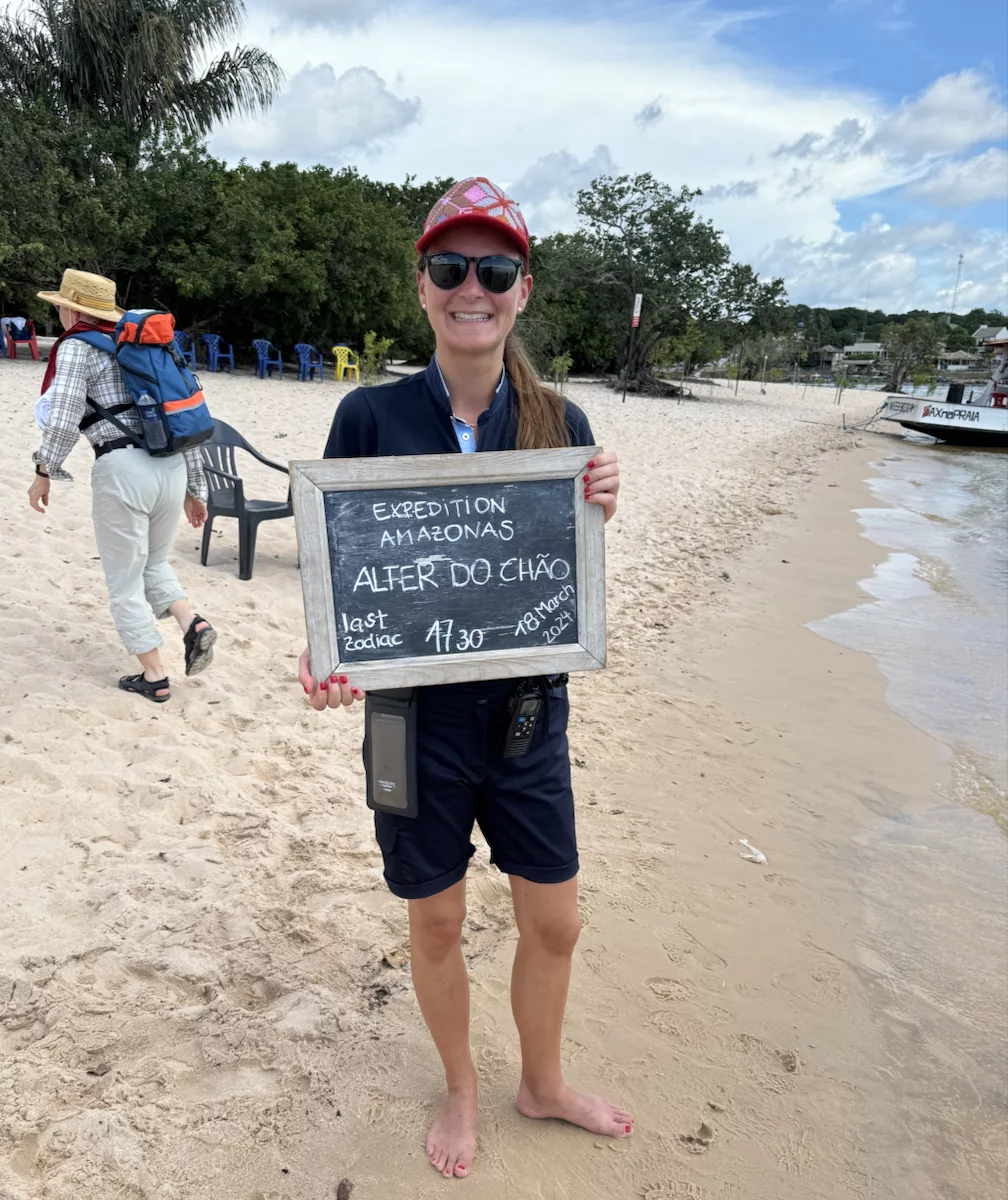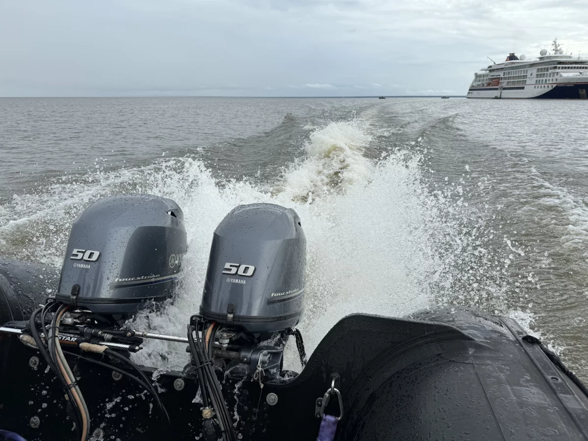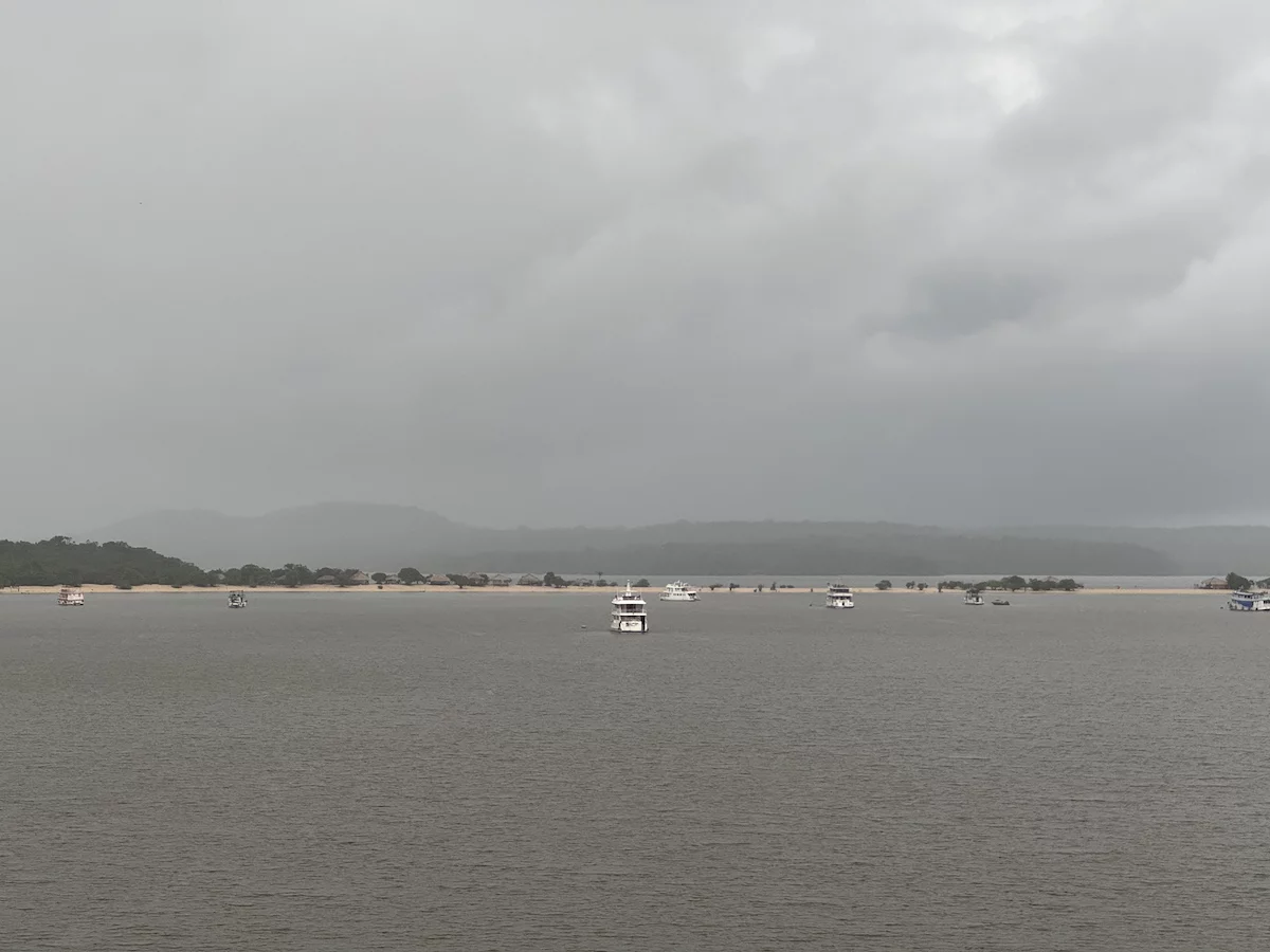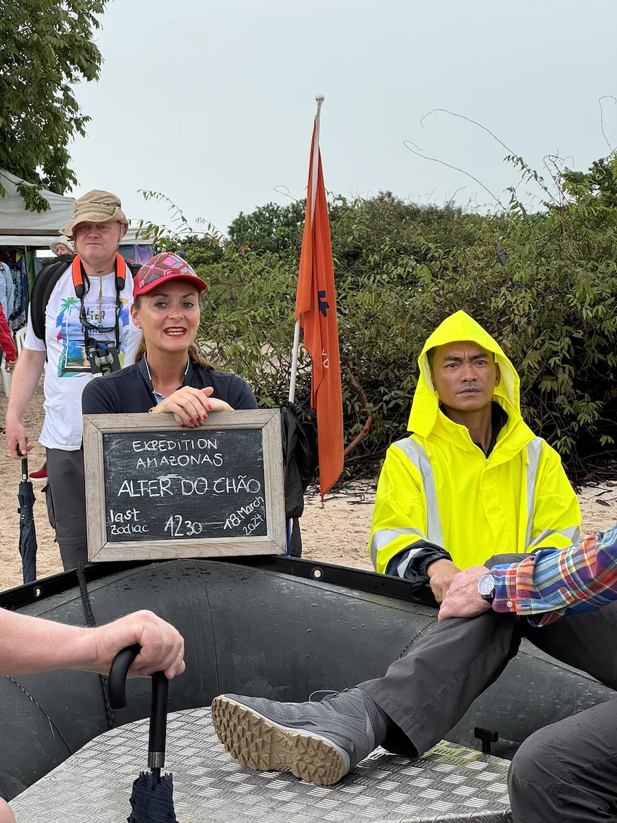 Am frühen Morgen haben wir Alter do Cháo erreicht. Ein neuerliches Beispiel des unberechenbaren Ablaufs einer Expeditionskreuzfahrt gab es heute morgen direkt vor dem Frühstück. Der Blick aus dem Fenster ließ schon erahnen was kommen würde. Die Regenzeit machte ihrem Namen mal wieder alle Ehre. Obwohl wir in Sichtweite zur Stadt vor Anker lagen, war der markante Hausberg von Alter do Cháo durch die Regenschwaden kaum zu erkennen. Damit war ziemlich schnell klar, dass es mit der geplanten Wanderung dort hinauf schon allein aus Sicherheitsgründen nichts werden würde. Aber HL-Cruises wäre nicht HL-Cruises, wenn sie nicht nach kurzer Beratung zwischen Brücken- und Expeditionsteam einen Plan “B” parat hätten. Es wurde ein Shuttle-Service mit den Zodiacs eingerichtet und die Expeditionsexperten nahmen uns mit auf einen kleinen Stadtrundgang.