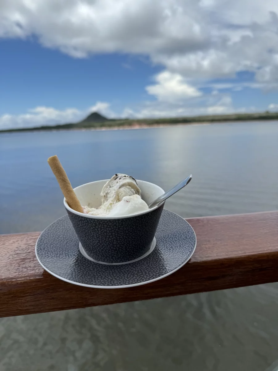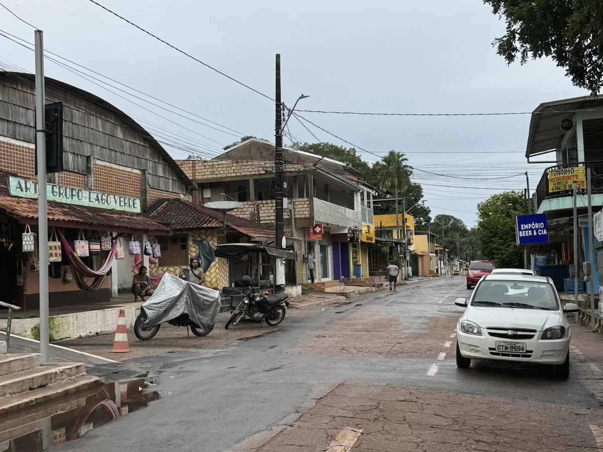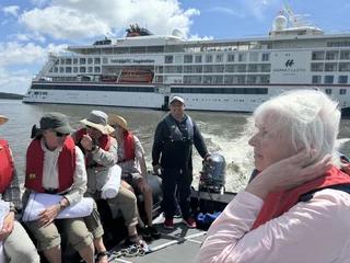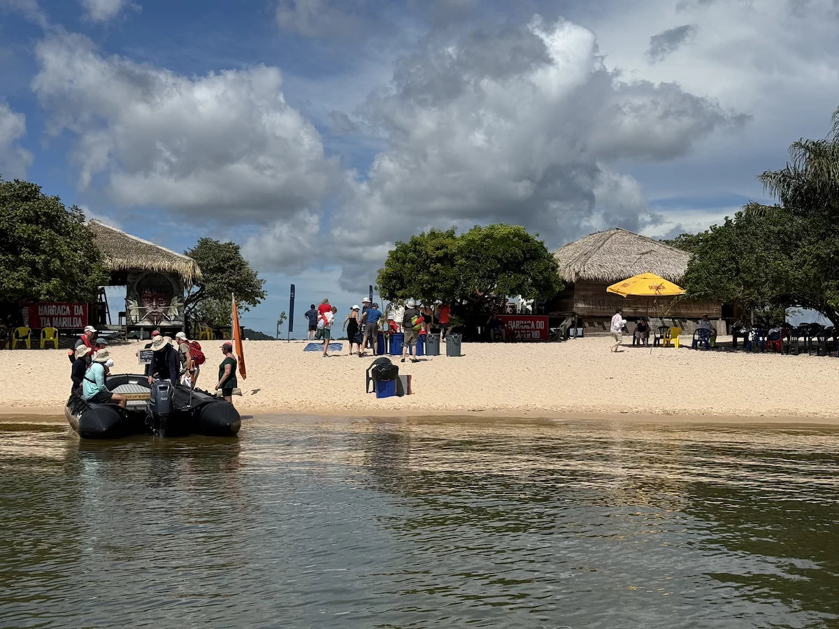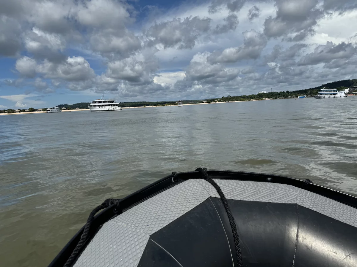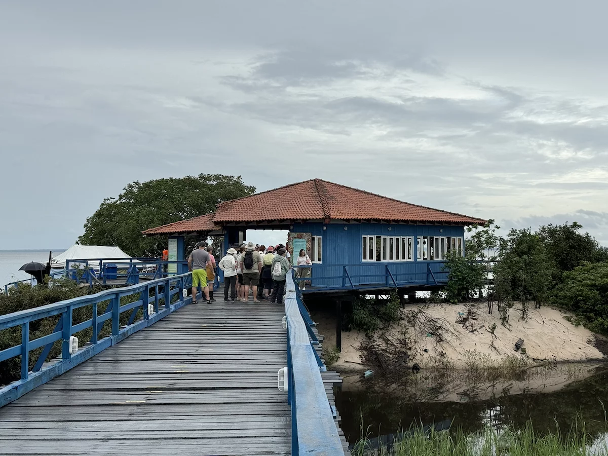 Am frühen Morgen haben wir Alter do Cháo erreicht. Ein neuerliches Beispiel des unberechenbaren Ablaufs einer Expeditionskreuzfahrt gab es heute morgen direkt vor dem Frühstück. Der Blick aus dem Fenster ließ schon erahnen was kommen würde. Die Regenzeit machte ihrem Namen mal wieder alle Ehre. Obwohl wir in Sichtweite zur Stadt vor Anker lagen, war der markante Hausberg von Alter do Cháo durch die Regenschwaden kaum zu erkennen. Damit war ziemlich schnell klar, dass es mit der geplanten Wanderung dort hinauf schon allein aus Sicherheitsgründen nichts werden würde. Aber HL-Cruises wäre nicht HL-Cruises, wenn sie nicht nach kurzer Beratung zwischen Brücken- und Expeditionsteam einen Plan “B” parat hätten. Es wurde ein Shuttle-Service mit den Zodiacs eingerichtet und die Expeditionsexperten nahmen uns mit auf einen kleinen Stadtrundgang.