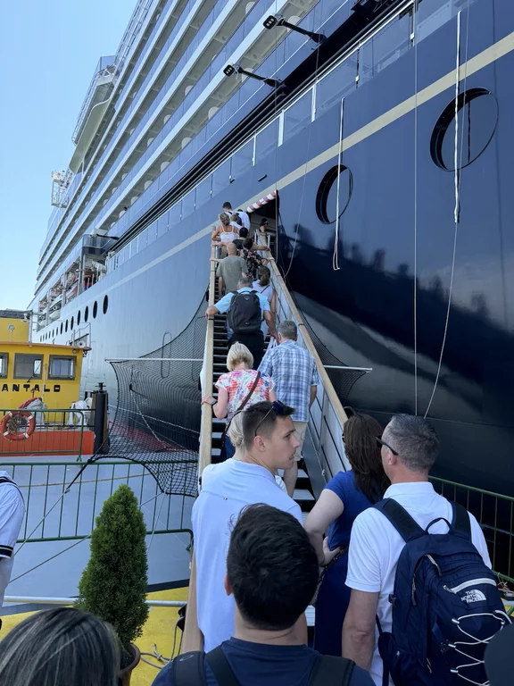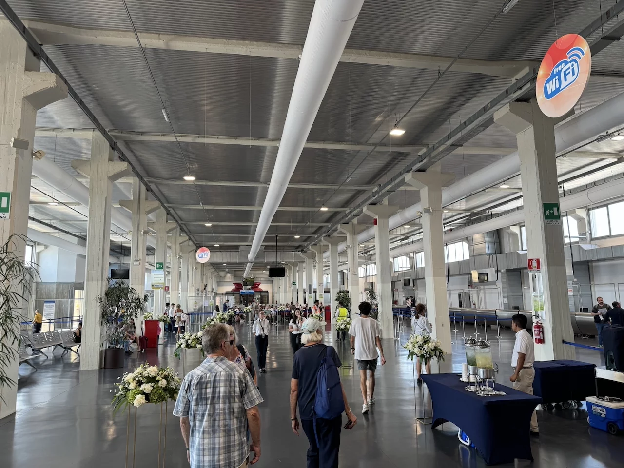 Die Einschiffung auf die Explora 1 fand quasi in 2 Phasen statt. Seit Oktober 2021 dürfen Kreuzfahrtschiffe mit einer Tonnage über 25.000t nicht mehr direkt durch die Lagune in den Hafen von Venedig einfahren, sondern müssen die Industrie-Häfen Fusina oder Maghera am Festland anlaufen.
