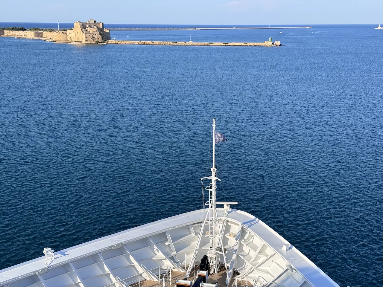 Am Abend ging es weiter in Richtung Nydri auf der griechischen Insel Lefkada. Die Ausfahrt aus dem Hafen von Brindisi war aufgrund der engen Hafeneinfahrt ein interessantes Manöver.