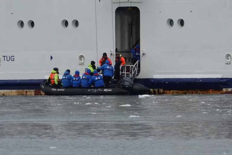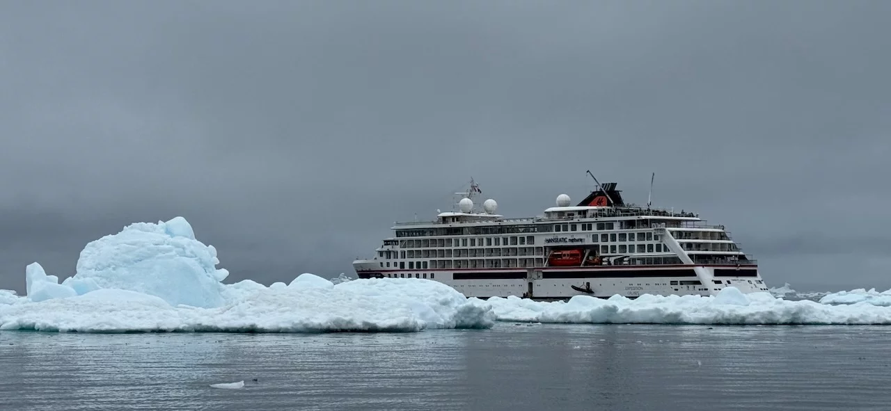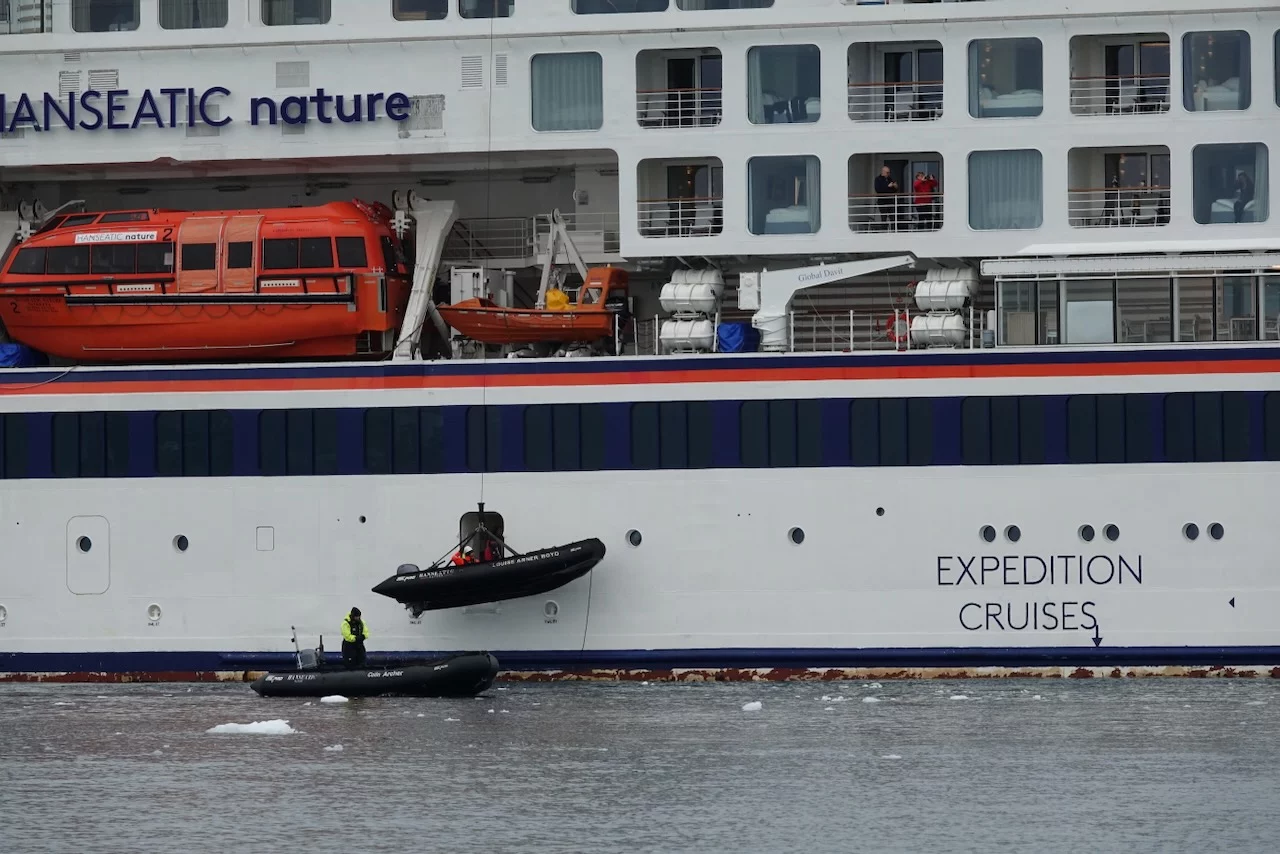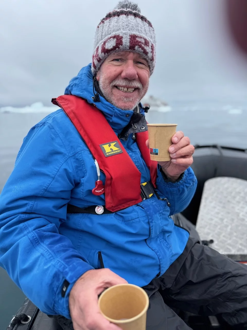 Doch trotz der wärmenden Parka’s und gefütterten Spritzwasserhosen kroch nach fast 2h cruisen zwischen den Eisbergen bei Regen, Wind und Nebel die Kälte so langsam in die Knochen. Zum Glück hatte die Crew ein Zodiac als „Versorgungsschiff“ in der Nähe der HANSEATIC nature postiert, an dem man sich mit einem Becher heißer Schokolade mit Rum noch schnell ein wenig aufwärmen konnte, bevor es zurück ging zum Schiff.
