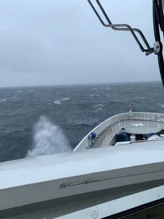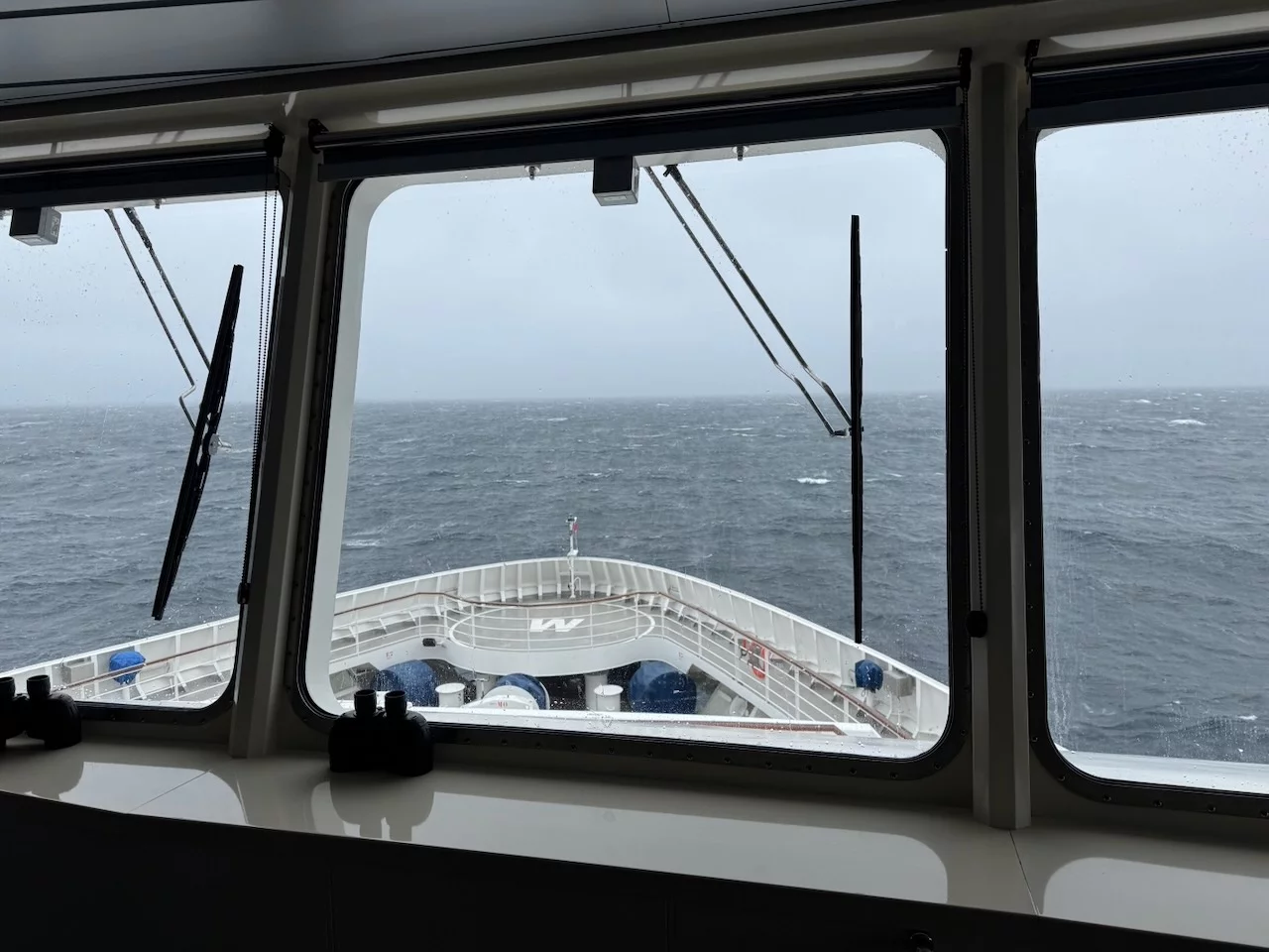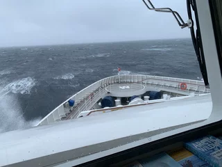 Auf unserem südliche Kurs zum Prins Christian Sund hatten wir heute morgen etwa die Hälfte der 715 Seemeilen abgeritten. Warum abgeritten? Nun, seit dem späten gestrigen Nachmittag sahen wir uns mit einer typisch grönländischen Wetterlage konfrontiert. Sturm mit Windgeschwindigkeiten zwischen 50-55 Knoten (90-100km/h) direkt auf die Nase, Seegang um die 4-5 Meter, Temperatur bei 3° und reichlich flüssigen Sonnenschein von oben. Die Nacht war für die meisten ziemlich unruhig, denn das Schiff knorzte und knarrte aufgrund der Stampfbewegungen gewaltig. Gut war eigentlich nur, dass Wellen und Wind direkt von vorne kamen. Somit gab es fast keine Rollbewegung, was wiederum für Passagiere mit Neigung zu Seekrankheit ein großer Vorteil ist. Wenn das Schiff in die Wellentäler eintauchte, gingen die Brecher teilweise über den Bug hinaus. Deshalb war auch der sogenannte „Nature Walk“ den ganzen Tag gesperrt. Man sah reichlich Leute, die mit „blasse Nasen“ herumliefen. Für uns ist diese Situation zum Glück kein Thema, denn wir sind ziemlich seefest.