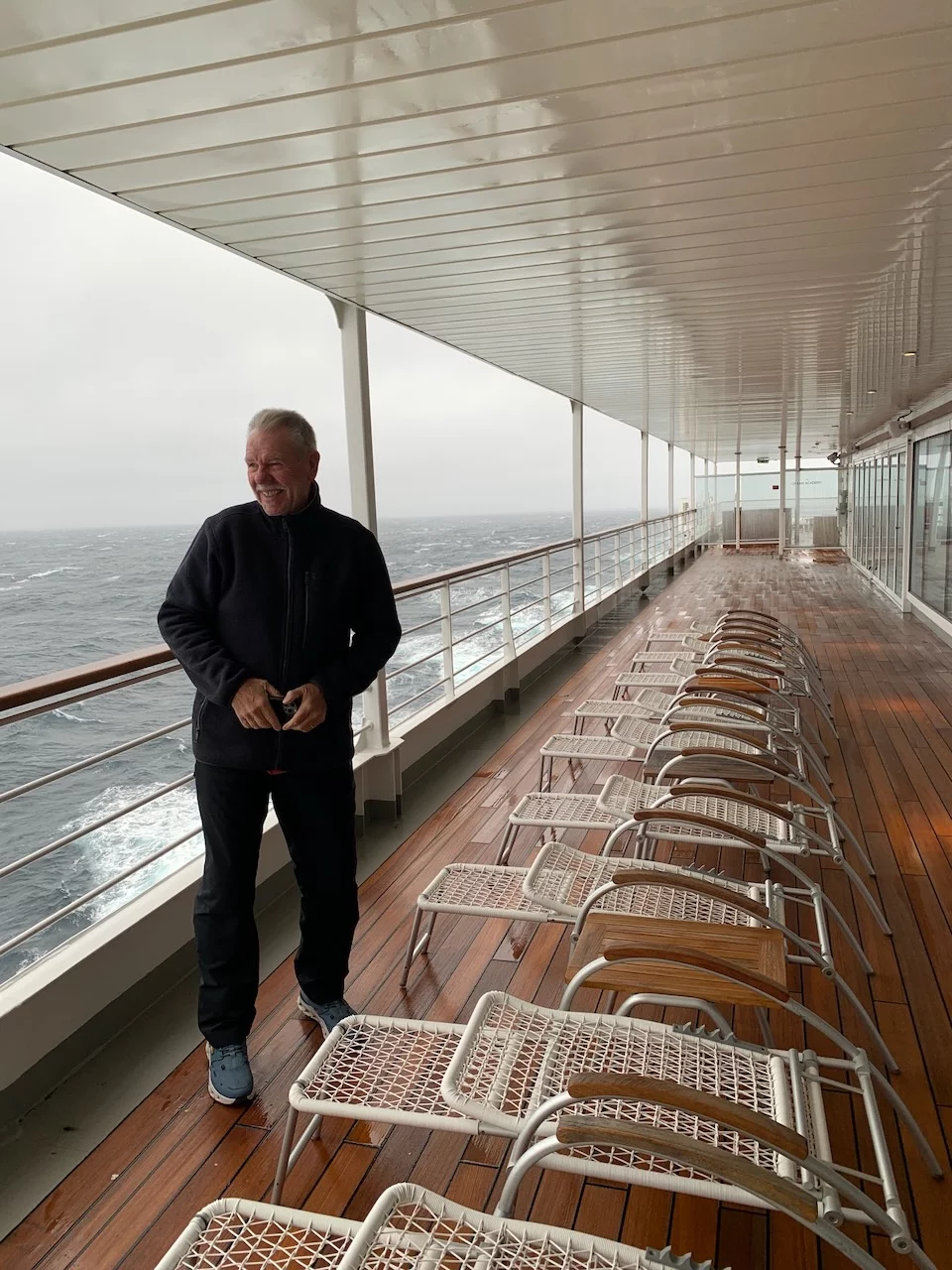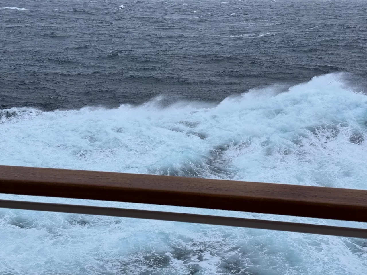 Der große Nachteil ist, dass diese Naturgewalten das Schiff deutlich einbremsen. Damit ist unsere geplante Ankunftszeit von 12:00 Uhr am Mittwoch nicht zu halten, wie uns der Kapitän in seiner täglichen „Morgenpredigt“ mitteilte. Unsere Geschwindigkeit lag nur noch bei 12-13 Knoten, geplant waren eigentlich 19 Knoten, also quasi Vollgas.
