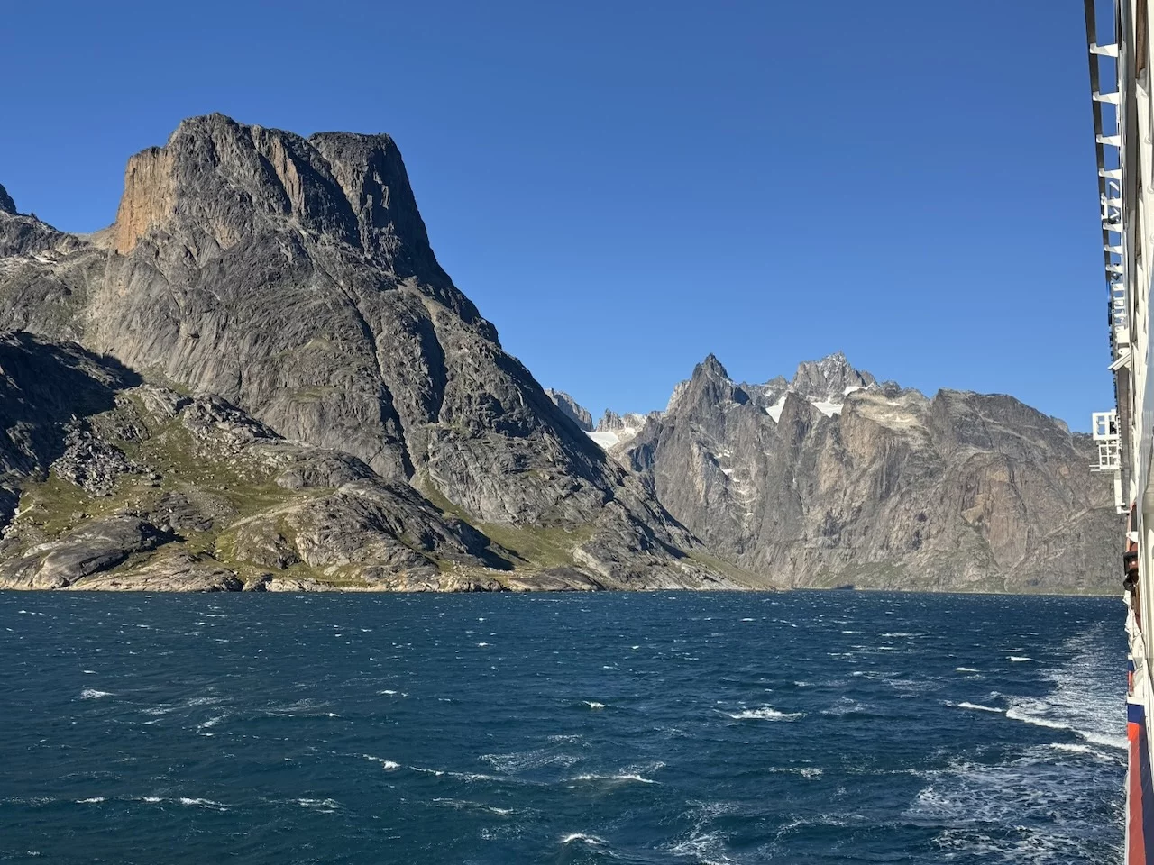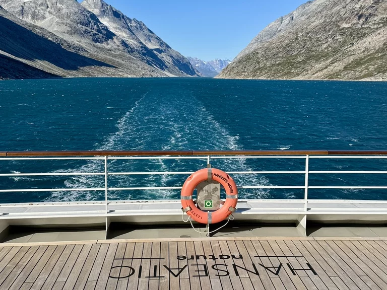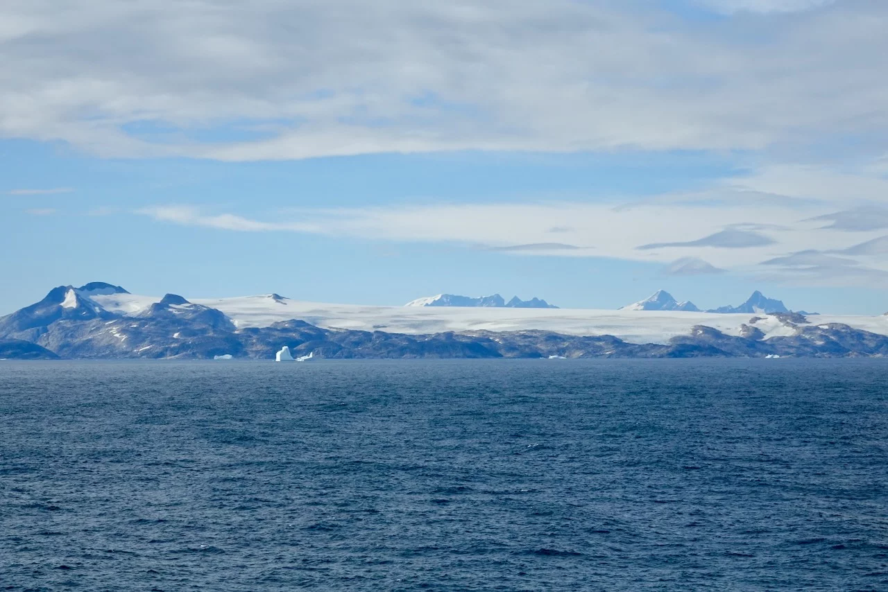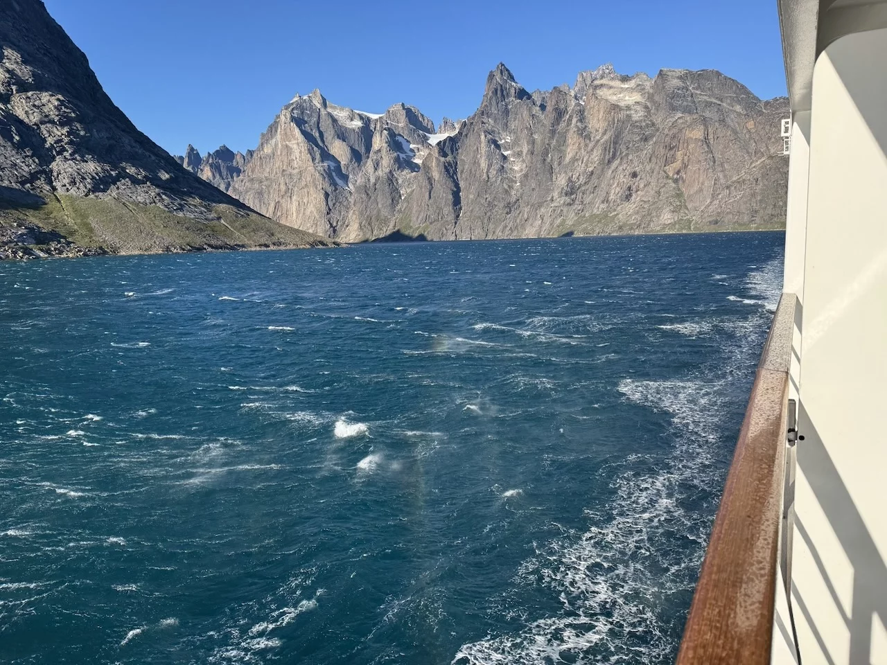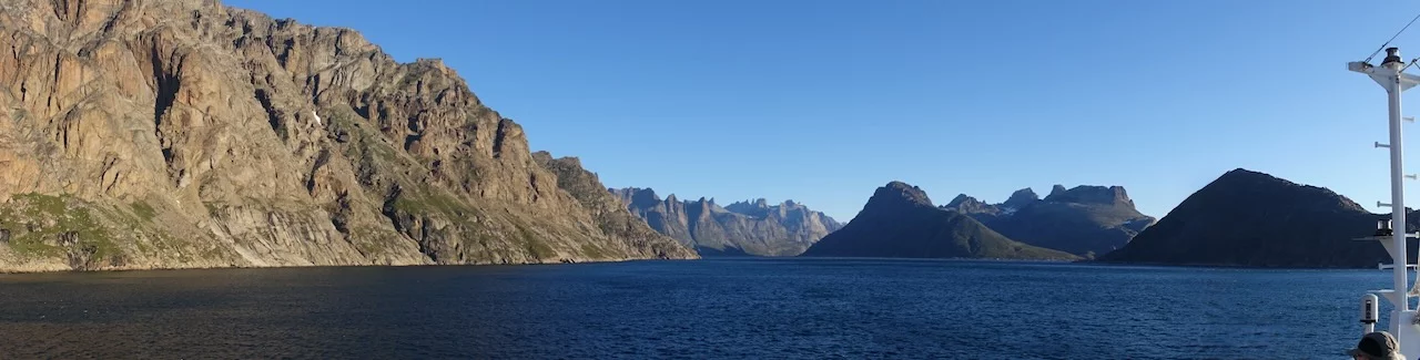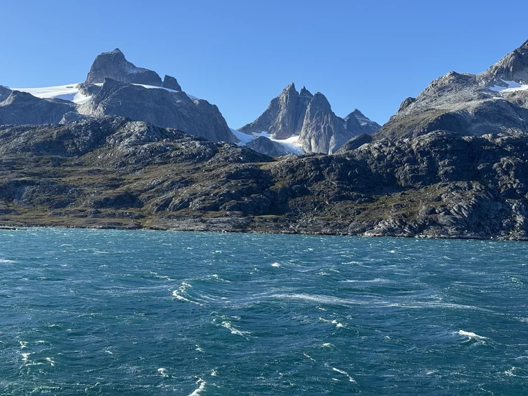 Gegen 13:00 Uhr haben wir die östliche Ausfahrt des Prins Christian Sund erreicht und arbeiten uns nun weiter nach Norden voran. Noch strahlt die Sonne vom blauen Himmel, doch das soll sich zum Abend hin ändern. Laut „Morgenpredigt“ vom Kapitän, die heute erst am Mittag stattfand, baut sich nördlich von uns zwischen Grönland und Island ein starkes Sturmtief auf.