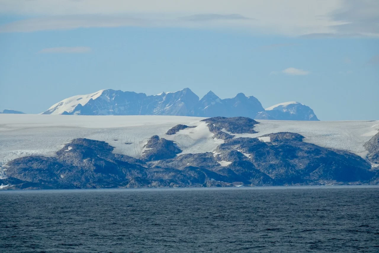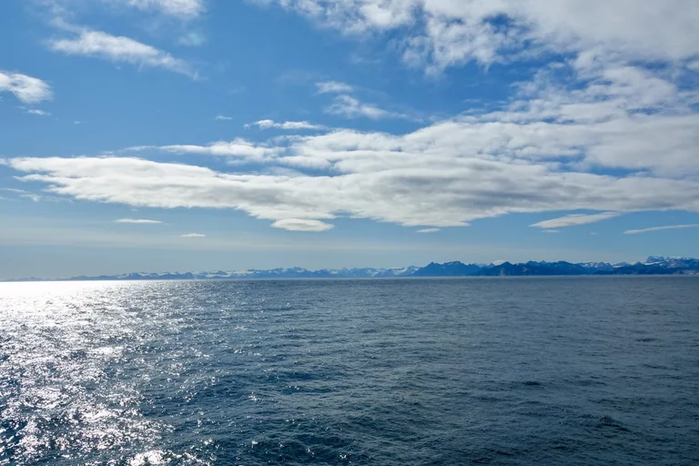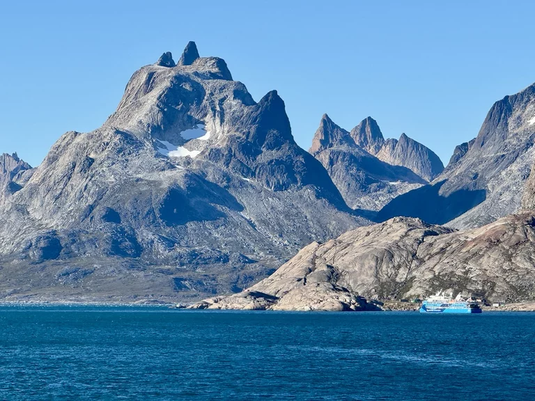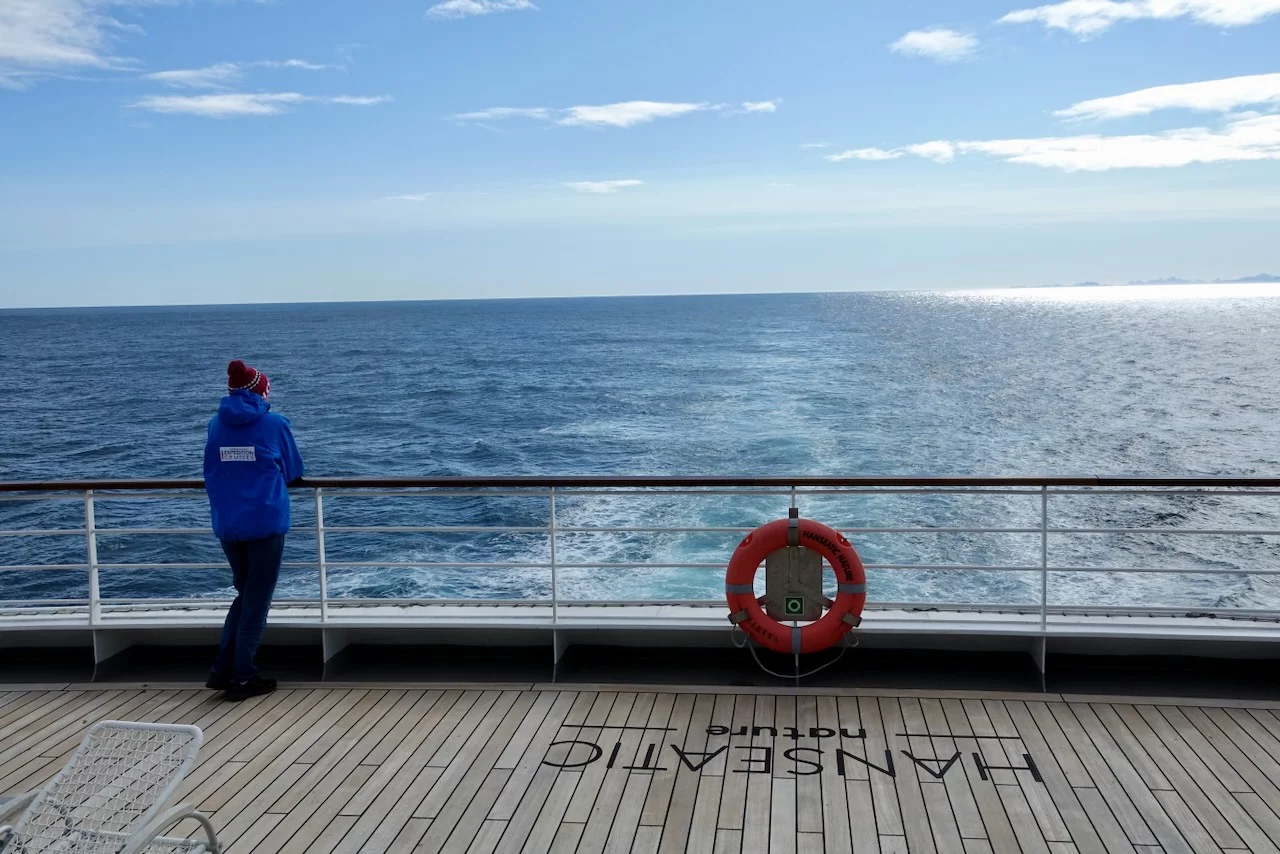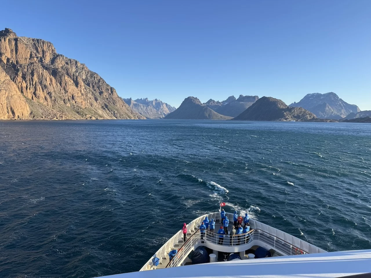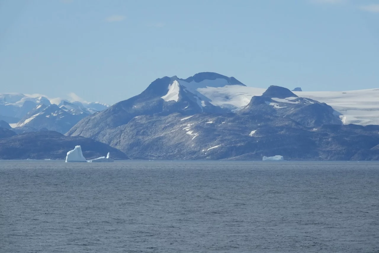 Gegen 13:00 Uhr haben wir die östliche Ausfahrt des Prins Christian Sund erreicht und arbeiten uns nun weiter nach Norden voran. Noch strahlt die Sonne vom blauen Himmel, doch das soll sich zum Abend hin ändern. Laut „Morgenpredigt“ vom Kapitän, die heute erst am Mittag stattfand, baut sich nördlich von uns zwischen Grönland und Island ein starkes Sturmtief auf.
