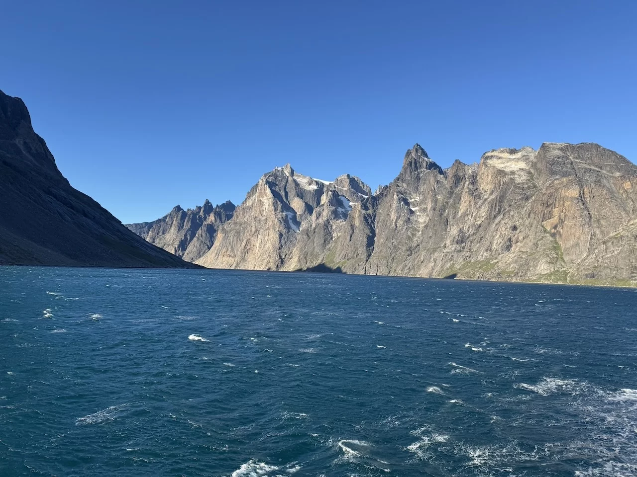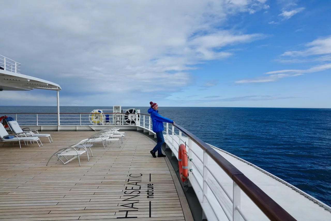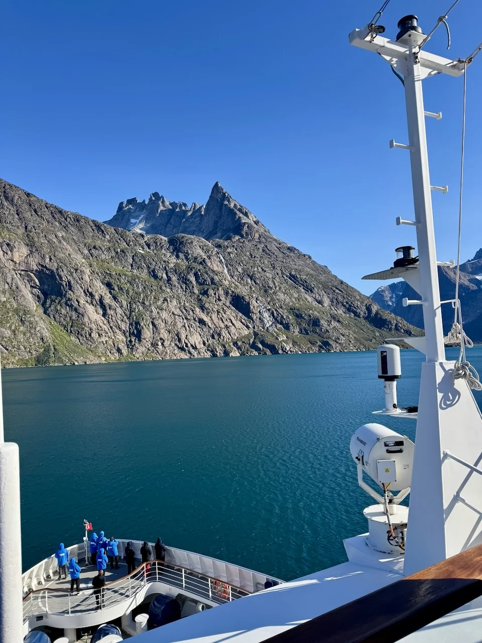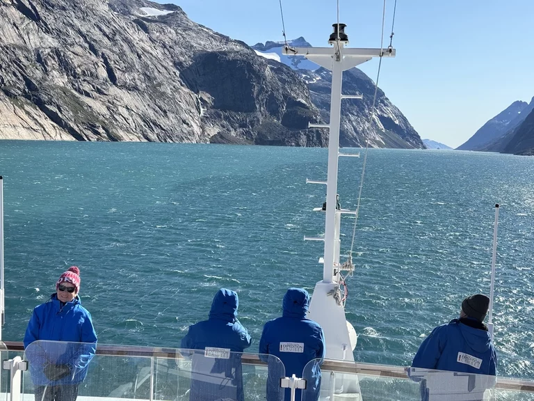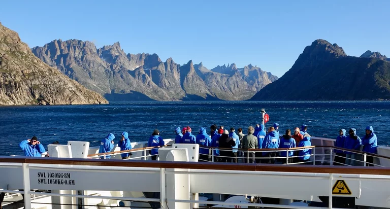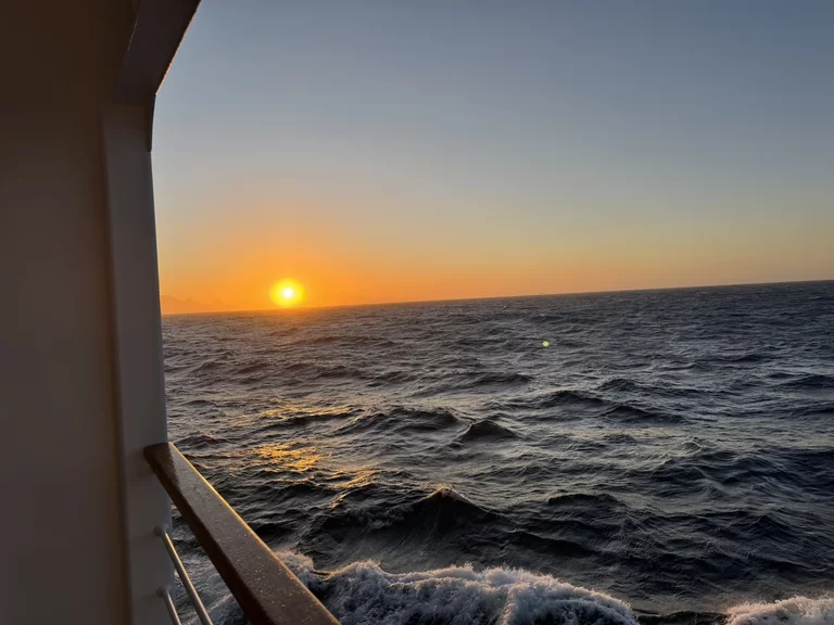 Gegen 13:00 Uhr haben wir die östliche Ausfahrt des Prins Christian Sund erreicht und arbeiten uns nun weiter nach Norden voran. Noch strahlt die Sonne vom blauen Himmel, doch das soll sich zum Abend hin ändern. Laut „Morgenpredigt“ vom Kapitän, die heute erst am Mittag stattfand, baut sich nördlich von uns zwischen Grönland und Island ein starkes Sturmtief auf.