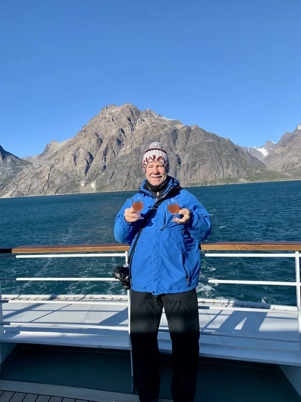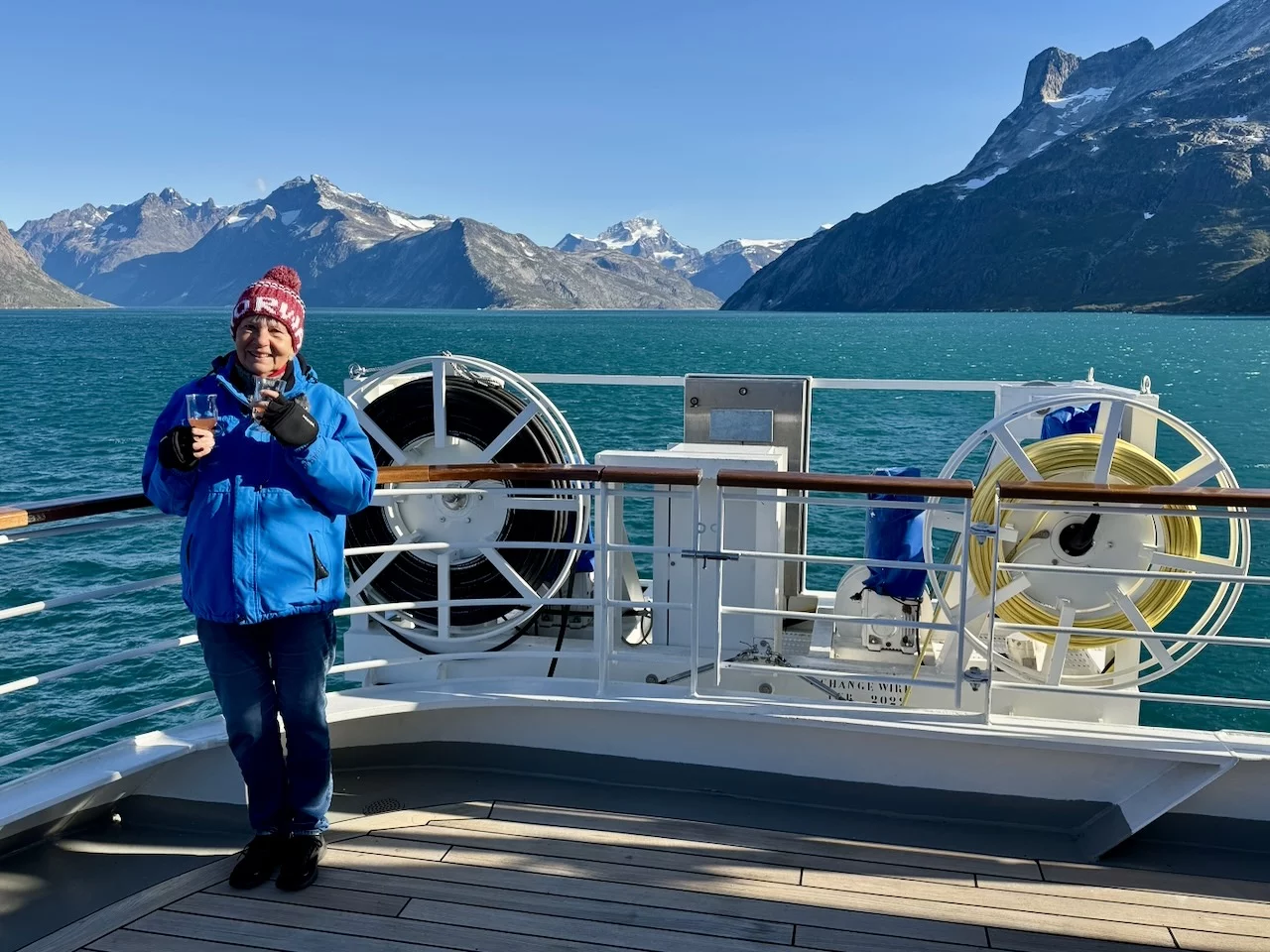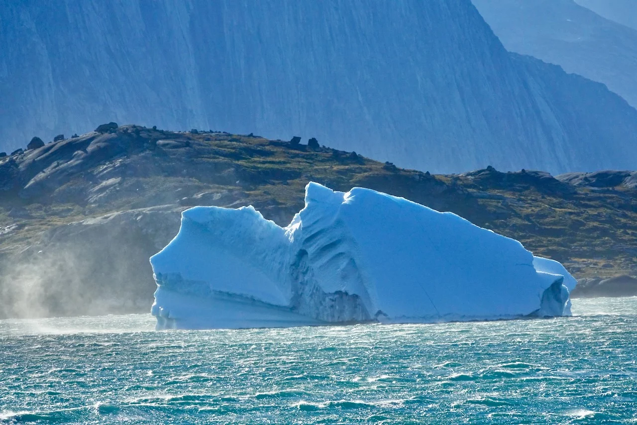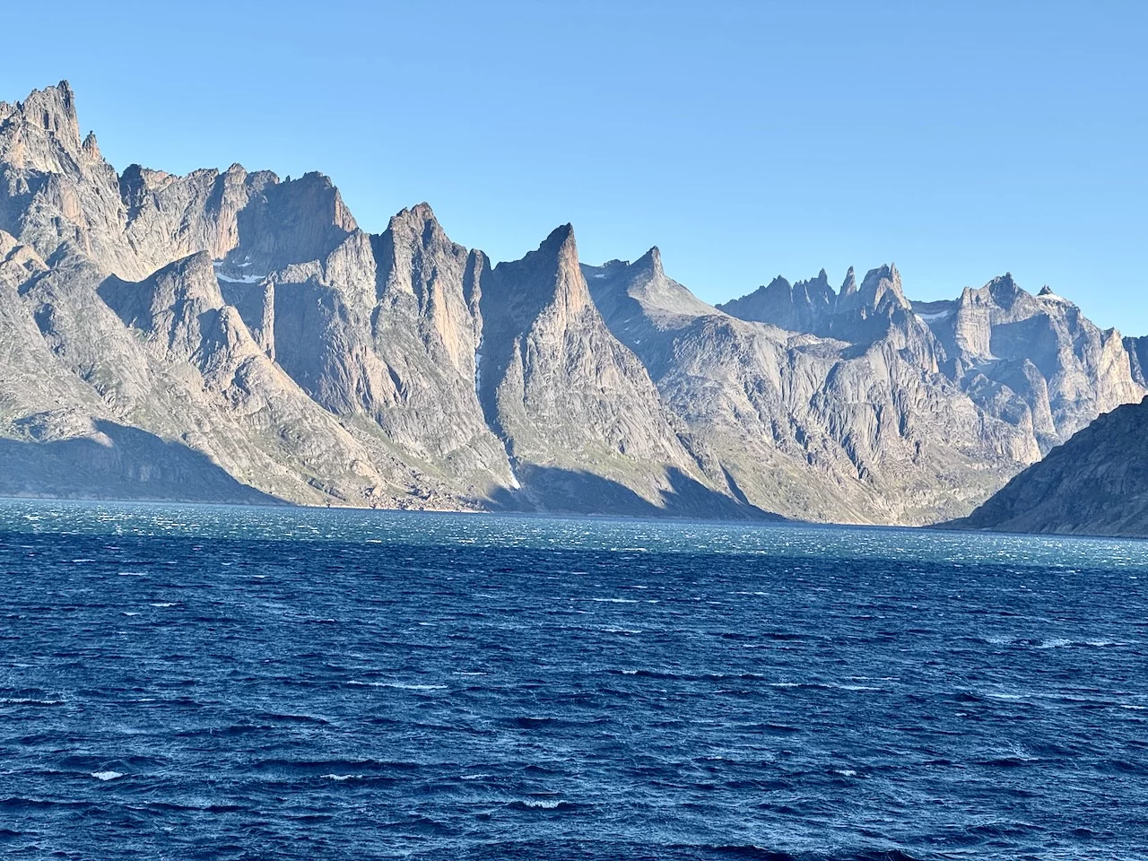 Gegen 13:00 Uhr haben wir die östliche Ausfahrt des Prins Christian Sund erreicht und arbeiten uns nun weiter nach Norden voran. Noch strahlt die Sonne vom blauen Himmel, doch das soll sich zum Abend hin ändern. Laut „Morgenpredigt“ vom Kapitän, die heute erst am Mittag stattfand, baut sich nördlich von uns zwischen Grönland und Island ein starkes Sturmtief auf.