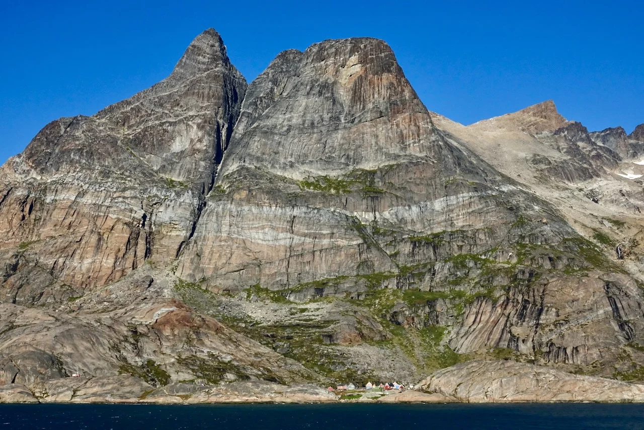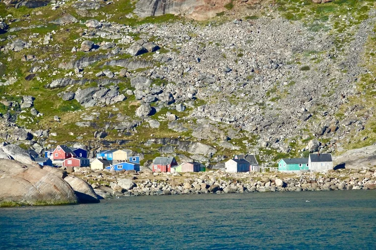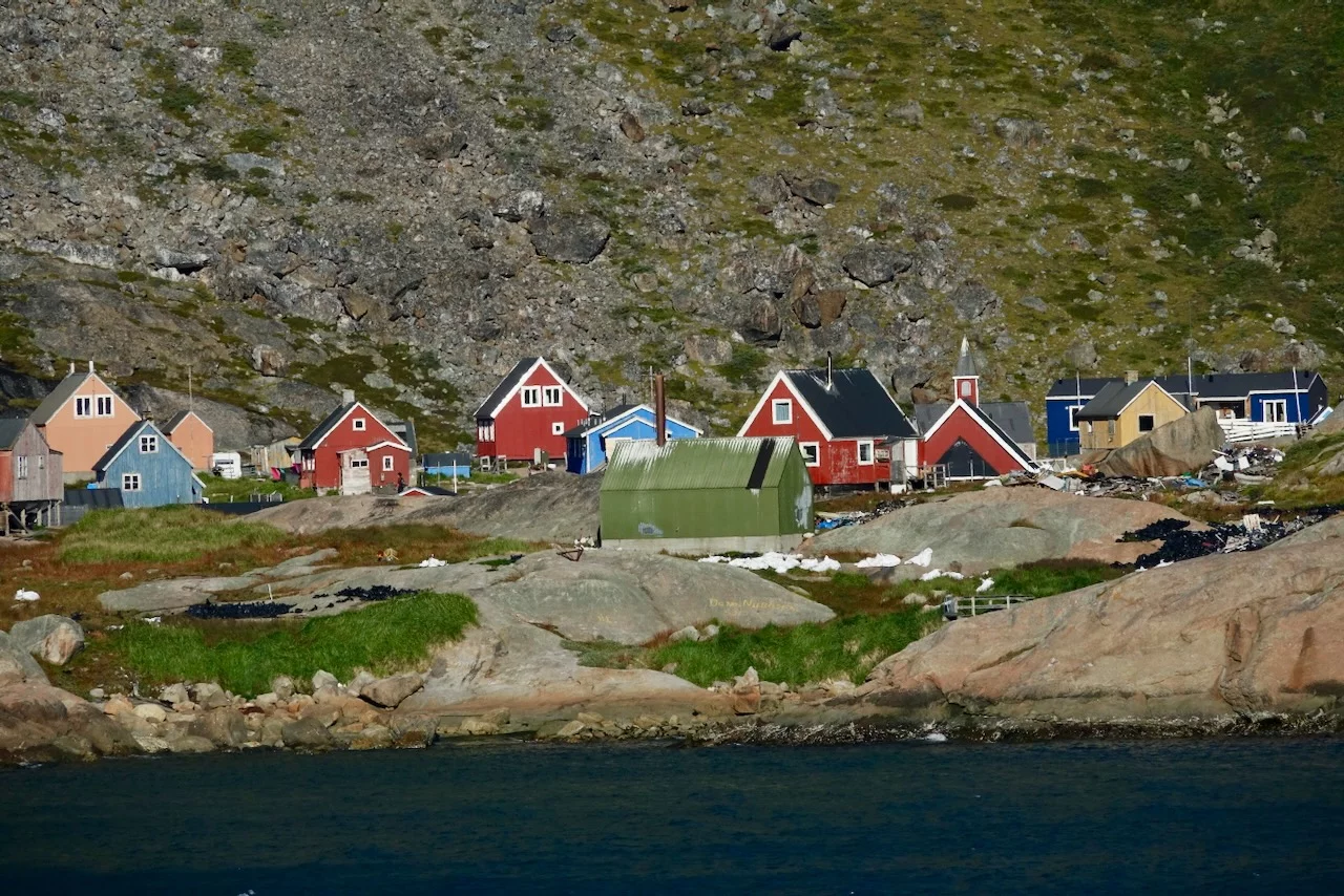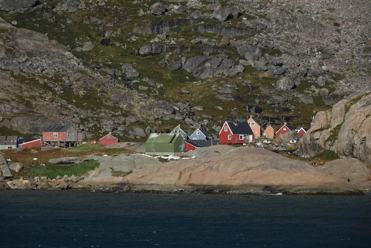 Mitten im Fjord liegt die kleine grönländische Siedlung Aappilattoq. Sie liegt auf einer kleinen Halbinsel an einer Stelle, wo sich drei Zuflüsse treffen. Hier leben 82 Menschen - Stand 01.01. 2025 - von Fischfang und der Jagd. Die Siedlung ist von 3 Seiten von Wasser dreier Zuflüsse des Fjords umgeben. Einzig im Norden wird sie nicht von Wasser abgetrennt, sondern von hochaufragenden Bergen.
