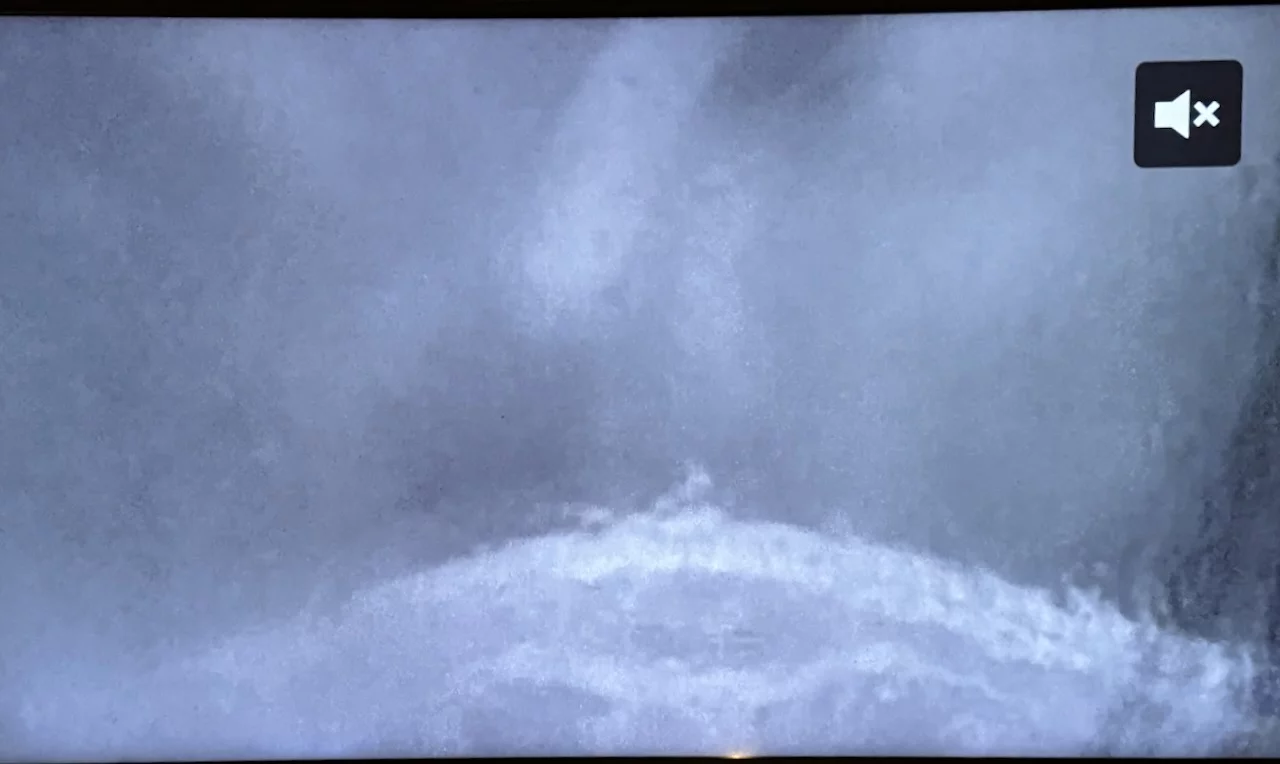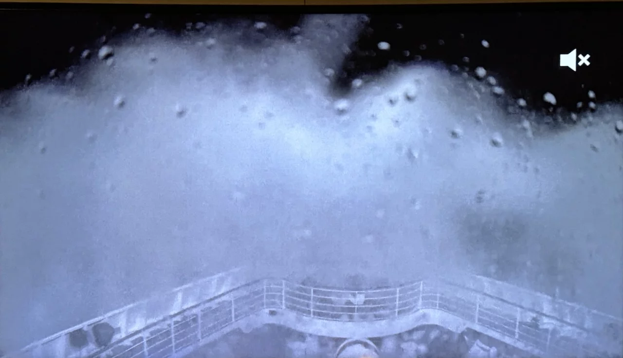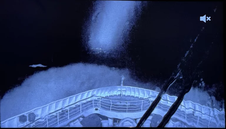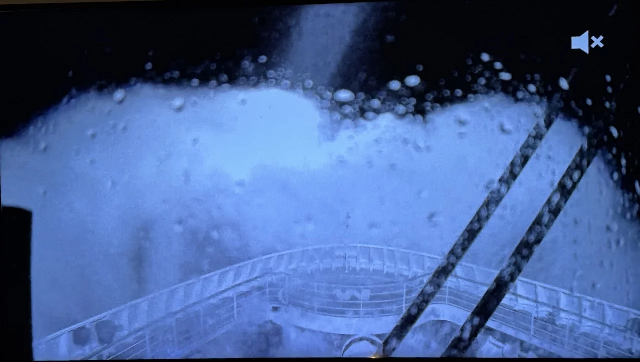 Die Aufnahmen unten habe ich vor 15 Minuten von unserem Fernseher in der Kabine gemacht. Das ist das Live-Bild der Bugkamera über der Brücke auf Deck 8. Wir sind ok, keine Seekrankheit, zumindest noch nicht!!!!