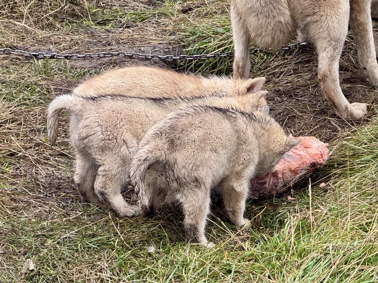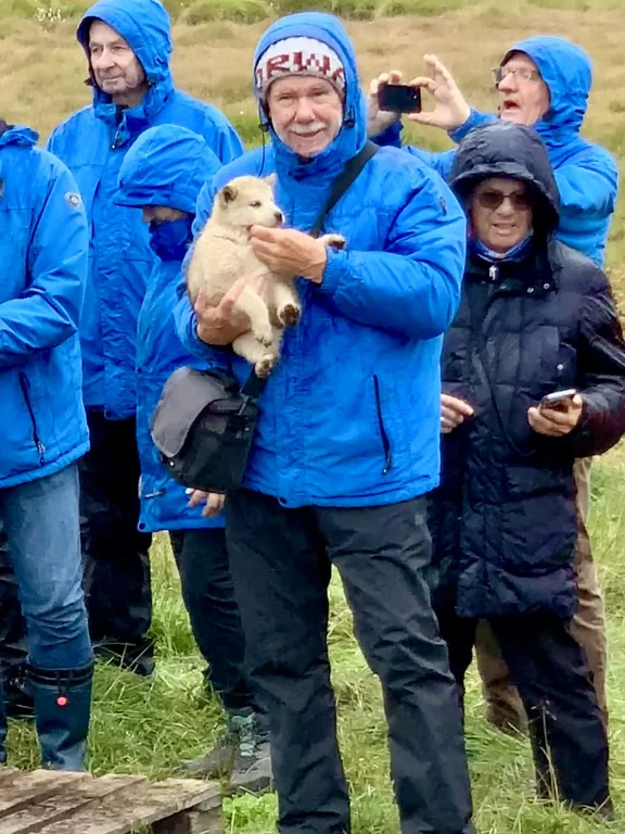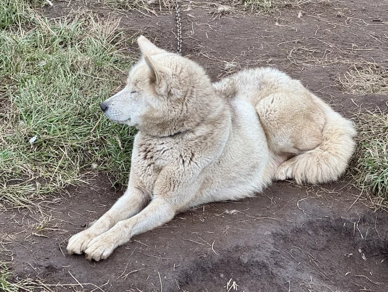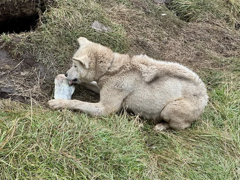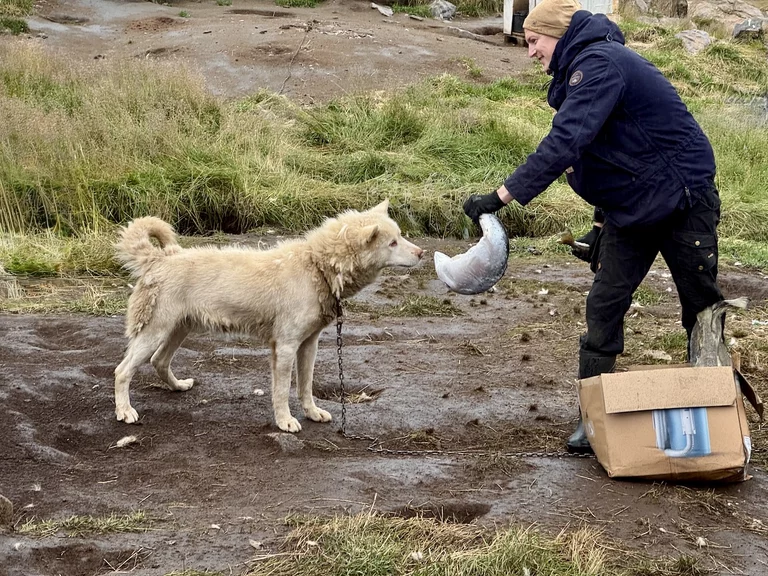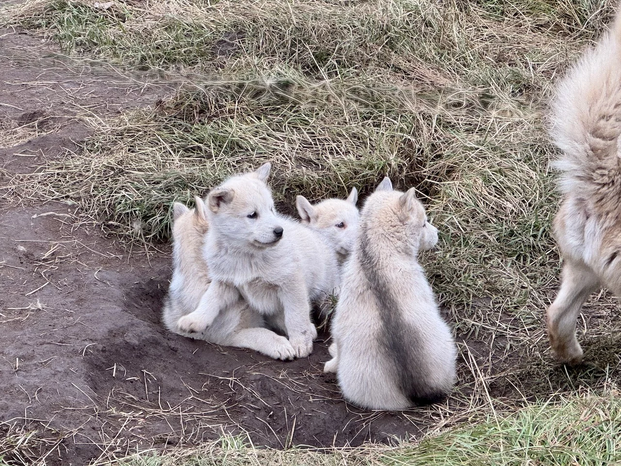Wir hatten heute die Gelegenheit, während eines Spaziergangs durch das Dorf einer Fütterung von Schlittenhunden beizuwohnen. Im Programm als eine etwas blutige Angelegenheit angekündigt, verlief das Ganze aber äußerst harmlos. Die Jäger des Dorfes waren in der letzte Zeit nicht sehr erfolgreich beim Jagen, deshalb gab es für die Hunde anstelle von frischem Robbenfleisch „nur“ gefrorenen Heilbutt und Seelachs. Zu dem Rudel gehörten auch eine Hand voll Welpen, die natürlich ganz besonders bei den Damen für Entzückung sorgten. Die Hunde sind an bis zu 10m langen Leinen festgemacht, leben Sommer wie Winter draußen, können sich aber entweder in kleine Hütten oder selbstgebuddelte Höhlen bei Winterstürmen zurückziehen.