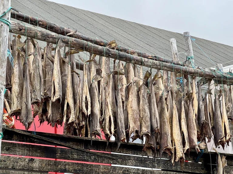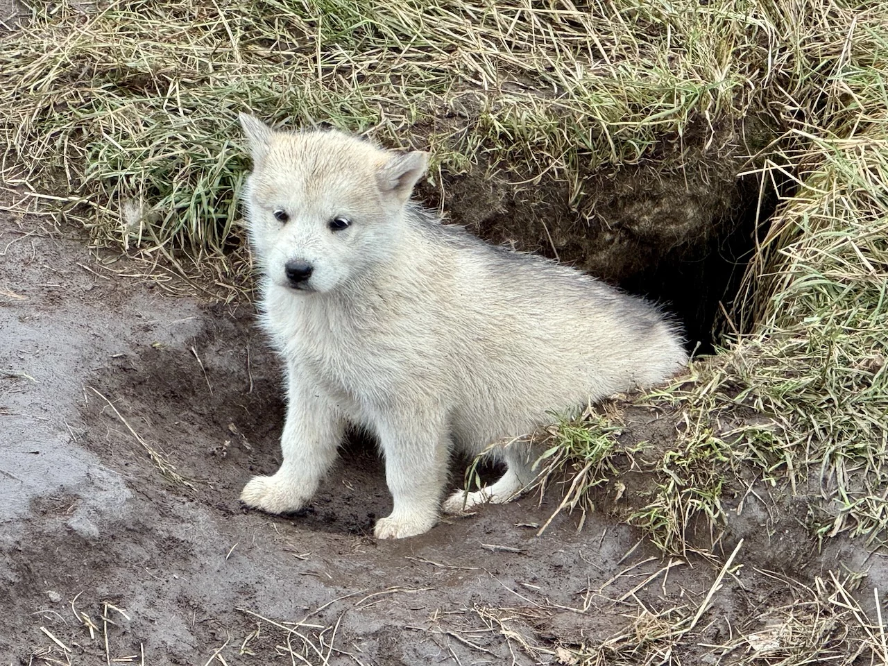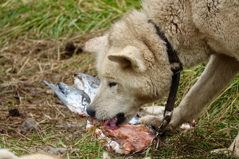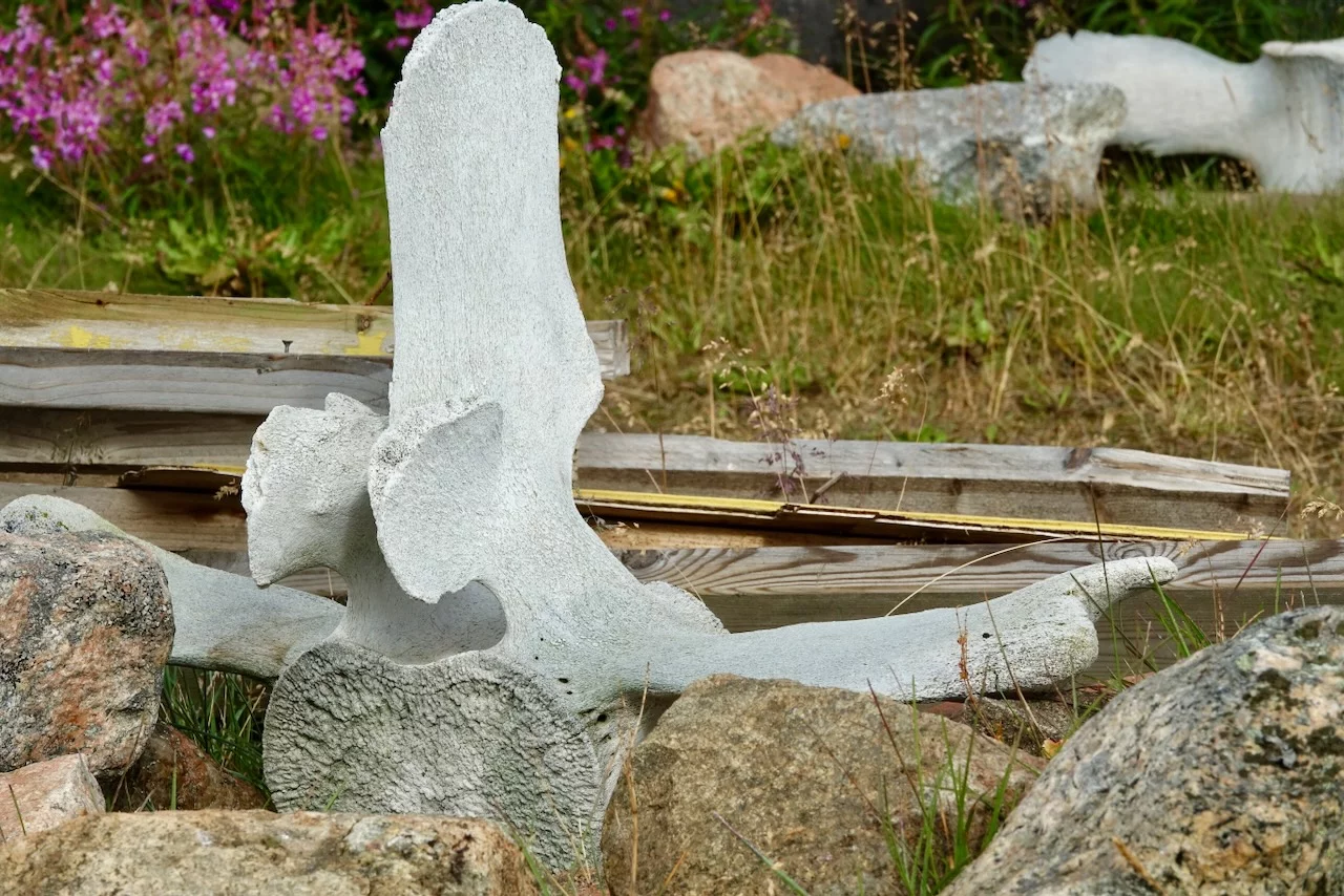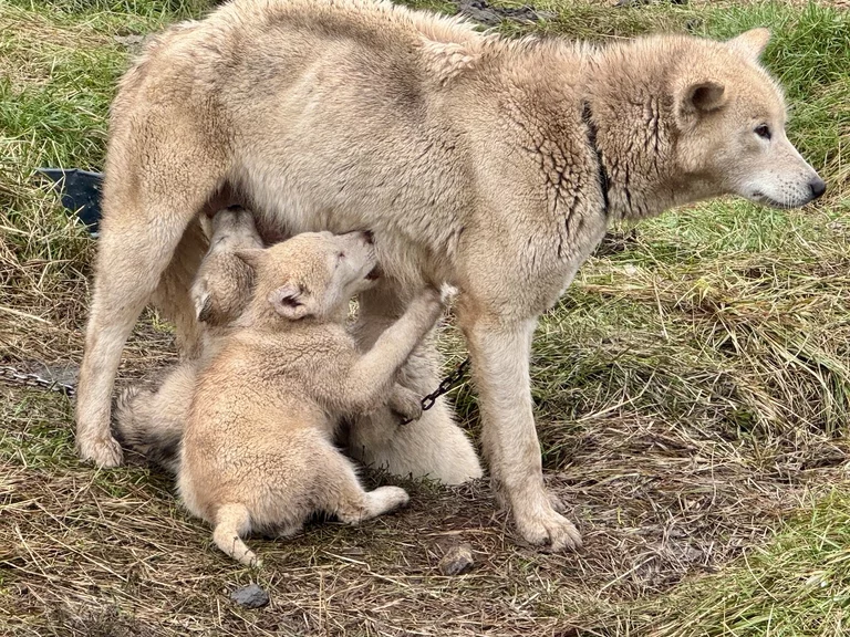 Wir hatten heute die Gelegenheit, während eines Spaziergangs durch das Dorf einer Fütterung von Schlittenhunden beizuwohnen. Im Programm als eine etwas blutige Angelegenheit angekündigt, verlief das Ganze aber äußerst harmlos. Die Jäger des Dorfes waren in der letzte Zeit nicht sehr erfolgreich beim Jagen, deshalb gab es für die Hunde anstelle von frischem Robbenfleisch „nur“ gefrorenen Heilbutt und Seelachs. Zu dem Rudel gehörten auch eine Hand voll Welpen, die natürlich ganz besonders bei den Damen für Entzückung sorgten. Die Hunde sind an bis zu 10m langen Leinen festgemacht, leben Sommer wie Winter draußen, können sich aber entweder in kleine Hütten oder selbstgebuddelte Höhlen bei Winterstürmen zurückziehen.