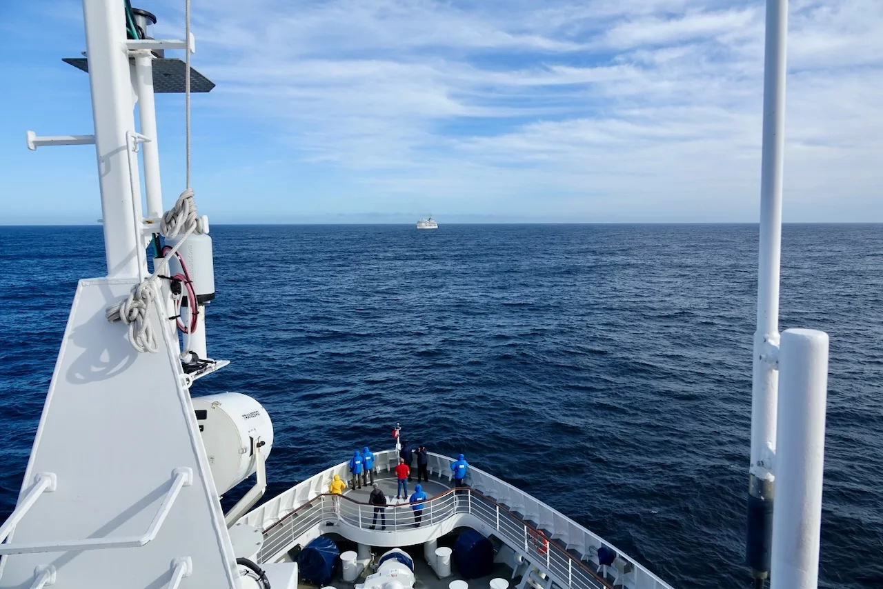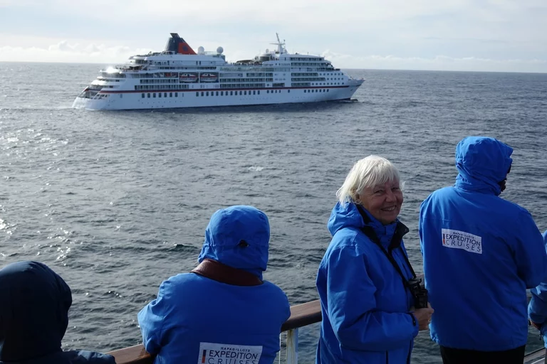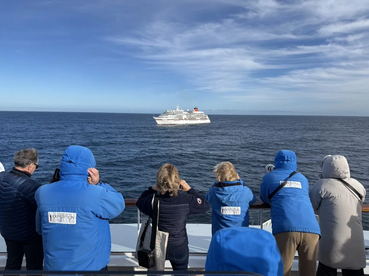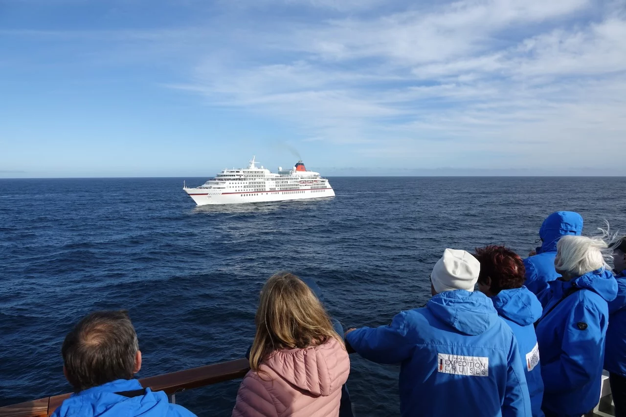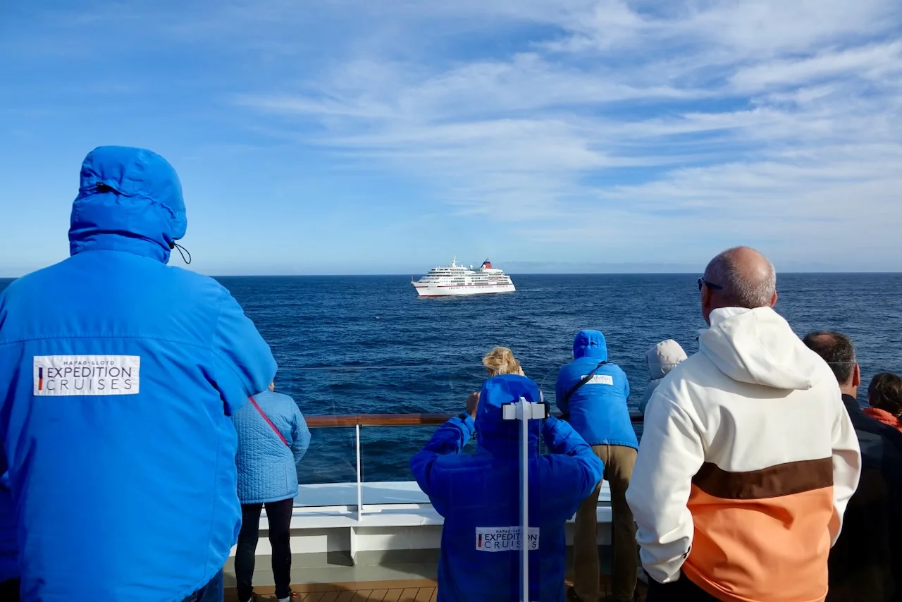 Kurz vor Mittag kam die Nachricht vom Kapitän, dass wir zwischen 15:30 - 16:00 Uhr ein sogenanntes Flottentreffen mit der MS Europa haben werden. Die ist auf dem Weg nach Island, wo wir gerade herkommen. Die beiden Kapitäne hatten sich abgesprochen, dass die „junge Deern“ HANSEATIC nature, die „alte Dame“ MS Europa am Treffpunkt einmal umrundet. Da hier in dieser Ecke so gut wie kein anderer Schiffsverkehr herrscht, ist das ein völlig sicheres Manöver. Auf beiden Schiffen waren die Außendecks natürlich mit winkenden Passagieren und Crew-Mitgliedern voll besetzt. Solche Treffen sind immer etwas Besonderes, denn sie sind nicht so häufig und deshalb und auch mit reichlich Typhon-Getute verbunden.