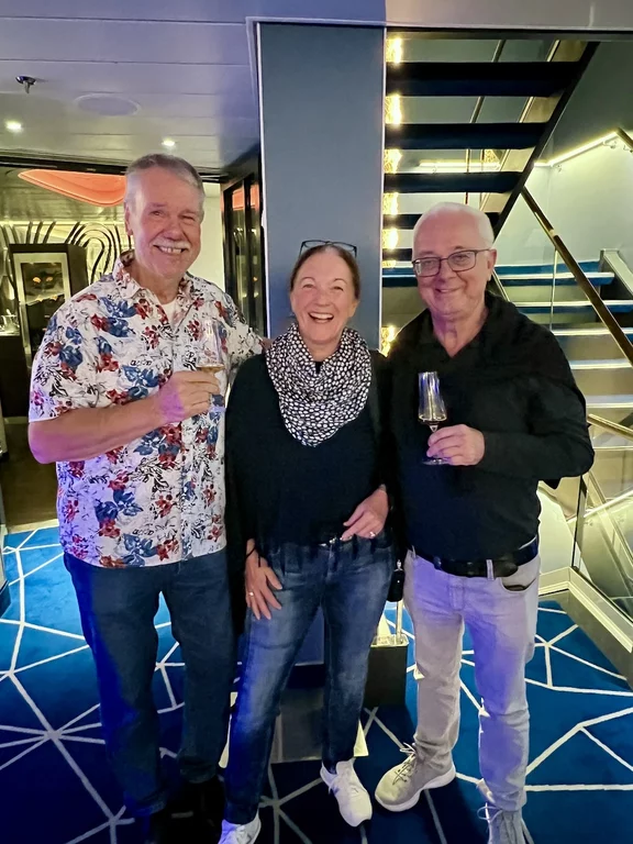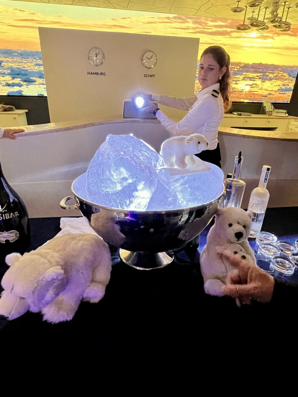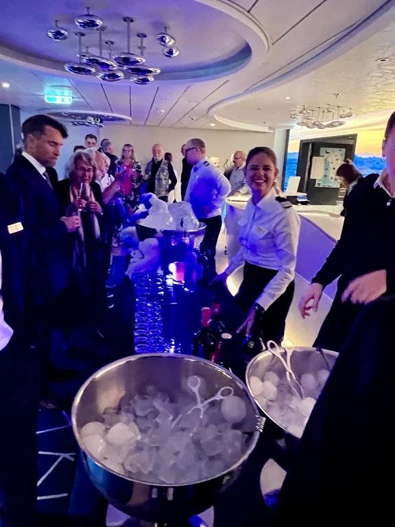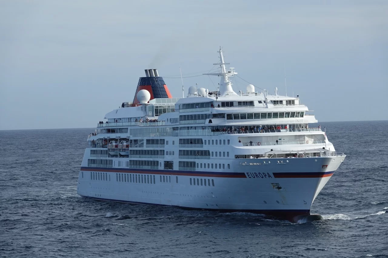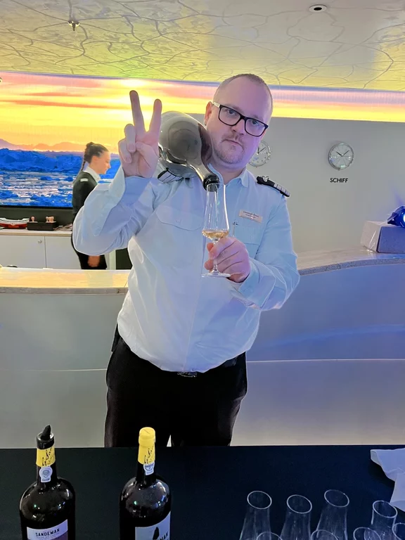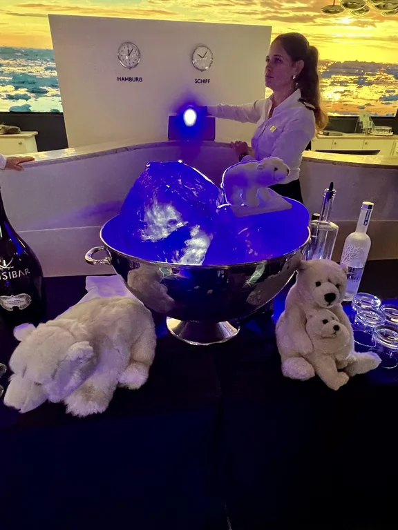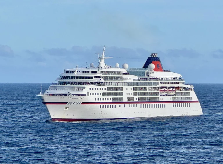 Kurz vor Mittag kam die Nachricht vom Kapitän, dass wir zwischen 15:30 - 16:00 Uhr ein sogenanntes Flottentreffen mit der MS Europa haben werden. Die ist auf dem Weg nach Island, wo wir gerade herkommen. Die beiden Kapitäne hatten sich abgesprochen, dass die „junge Deern“ HANSEATIC nature, die „alte Dame“ MS Europa am Treffpunkt einmal umrundet. Da hier in dieser Ecke so gut wie kein anderer Schiffsverkehr herrscht, ist das ein völlig sicheres Manöver. Auf beiden Schiffen waren die Außendecks natürlich mit winkenden Passagieren und Crew-Mitgliedern voll besetzt. Solche Treffen sind immer etwas Besonderes, denn sie sind nicht so häufig und deshalb und auch mit reichlich Typhon-Getute verbunden.