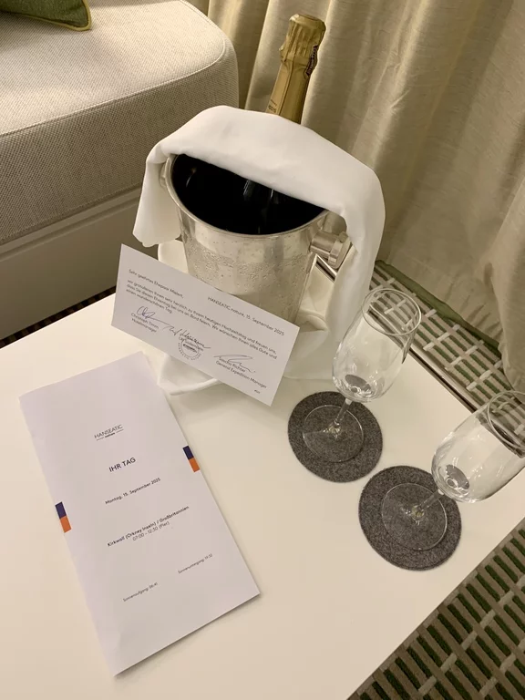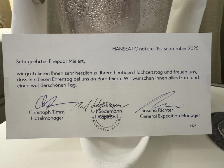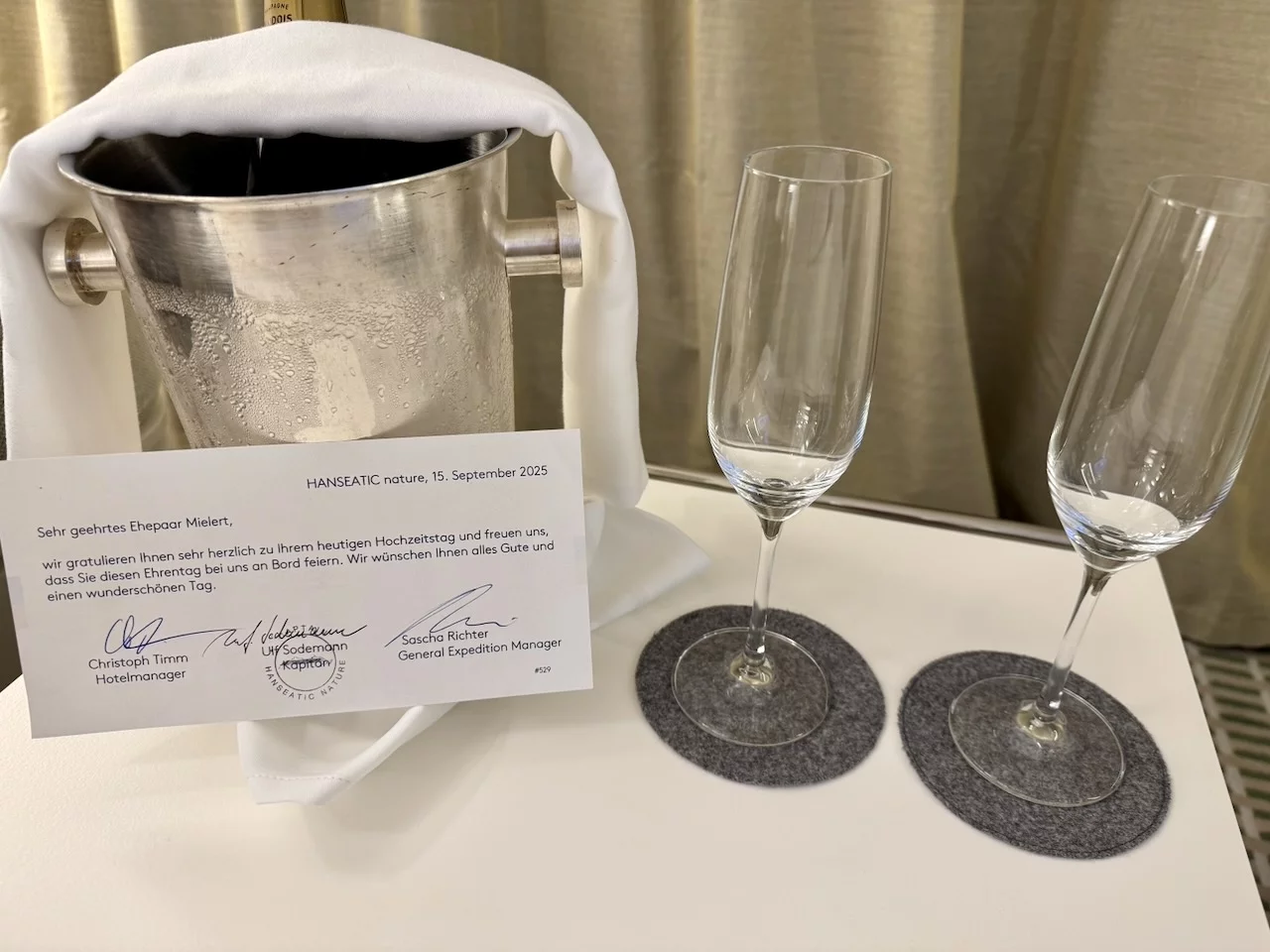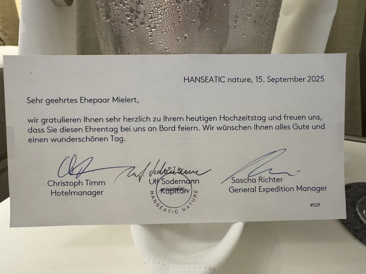 Der 15.09. ist unser Hochzeitstag und den haben wir mit einem fantastischen Abendessen im Spezialitätenrestaurant „Hamptons“ gekrönt. Wir wurden sehr verwöhnt, denn die Service-Crew wusste natürlich von unserem besonderen Tag. Nicht nur das, eine weitere Überraschung gab es, als wir am späten Abend zurück auf unsere Kabine kamen, denn auch die Schiffsleitung liess es sich nicht nehmen zu gratulieren.