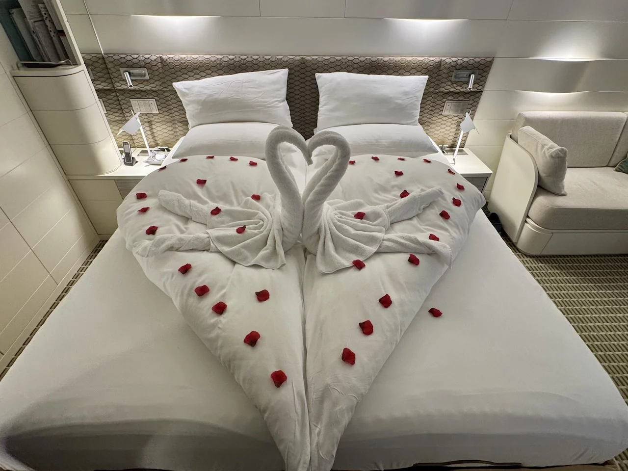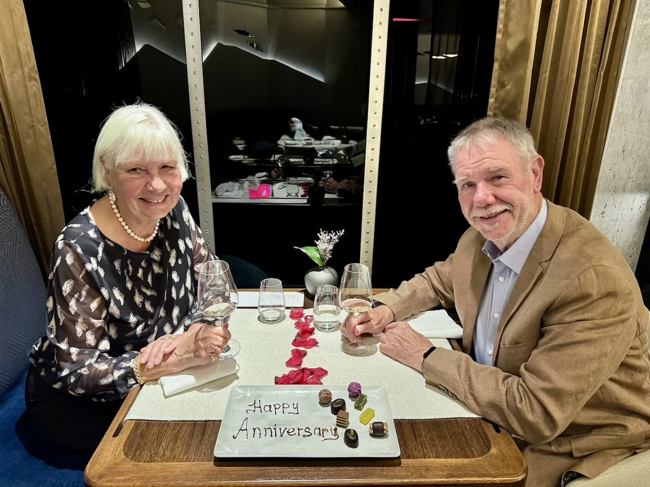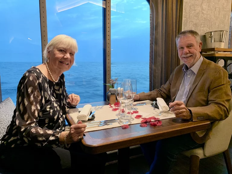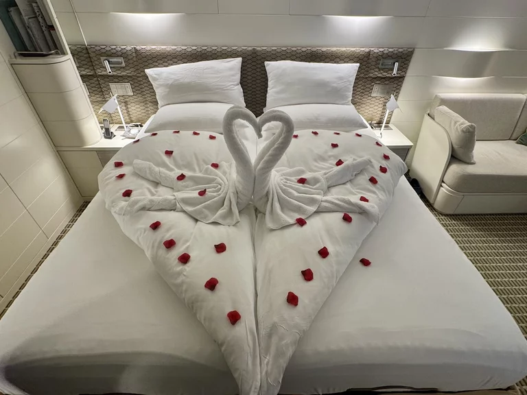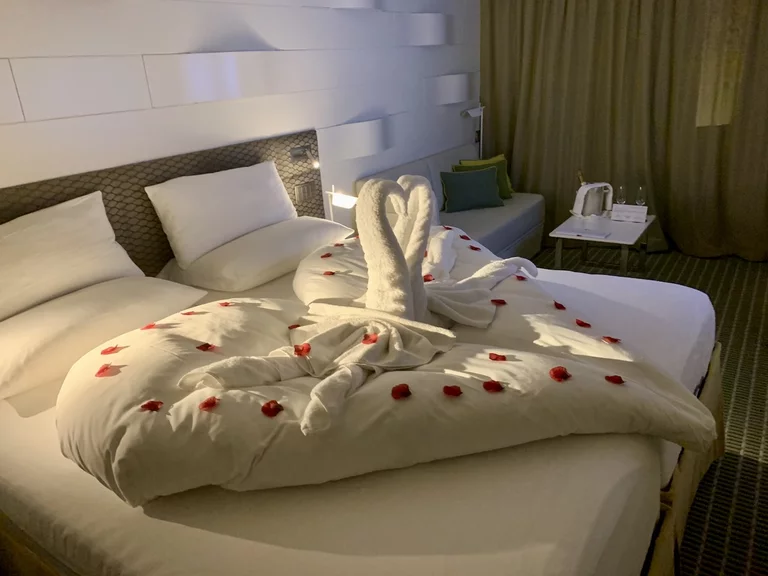 Der 15.09. ist unser Hochzeitstag und den haben wir mit einem fantastischen Abendessen im Spezialitätenrestaurant „Hamptons“ gekrönt. Wir wurden sehr verwöhnt, denn die Service-Crew wusste natürlich von unserem besonderen Tag. Nicht nur das, eine weitere Überraschung gab es, als wir am späten Abend zurück auf unsere Kabine kamen, denn auch die Schiffsleitung liess es sich nicht nehmen zu gratulieren.
