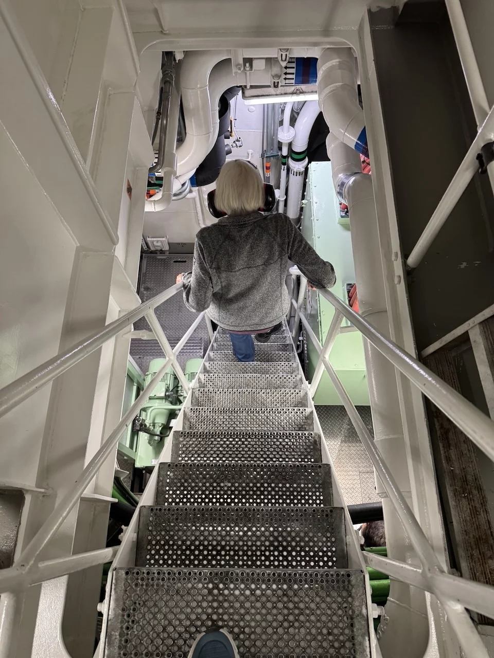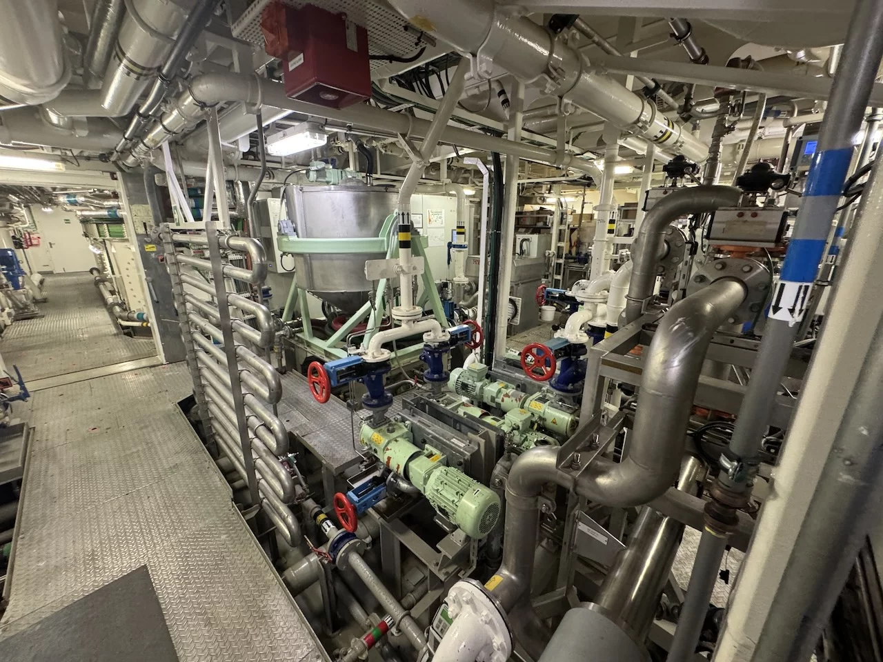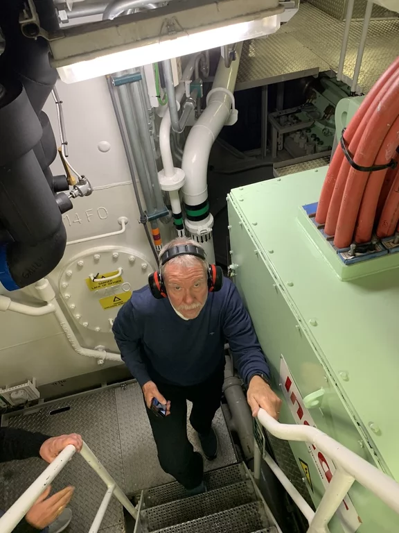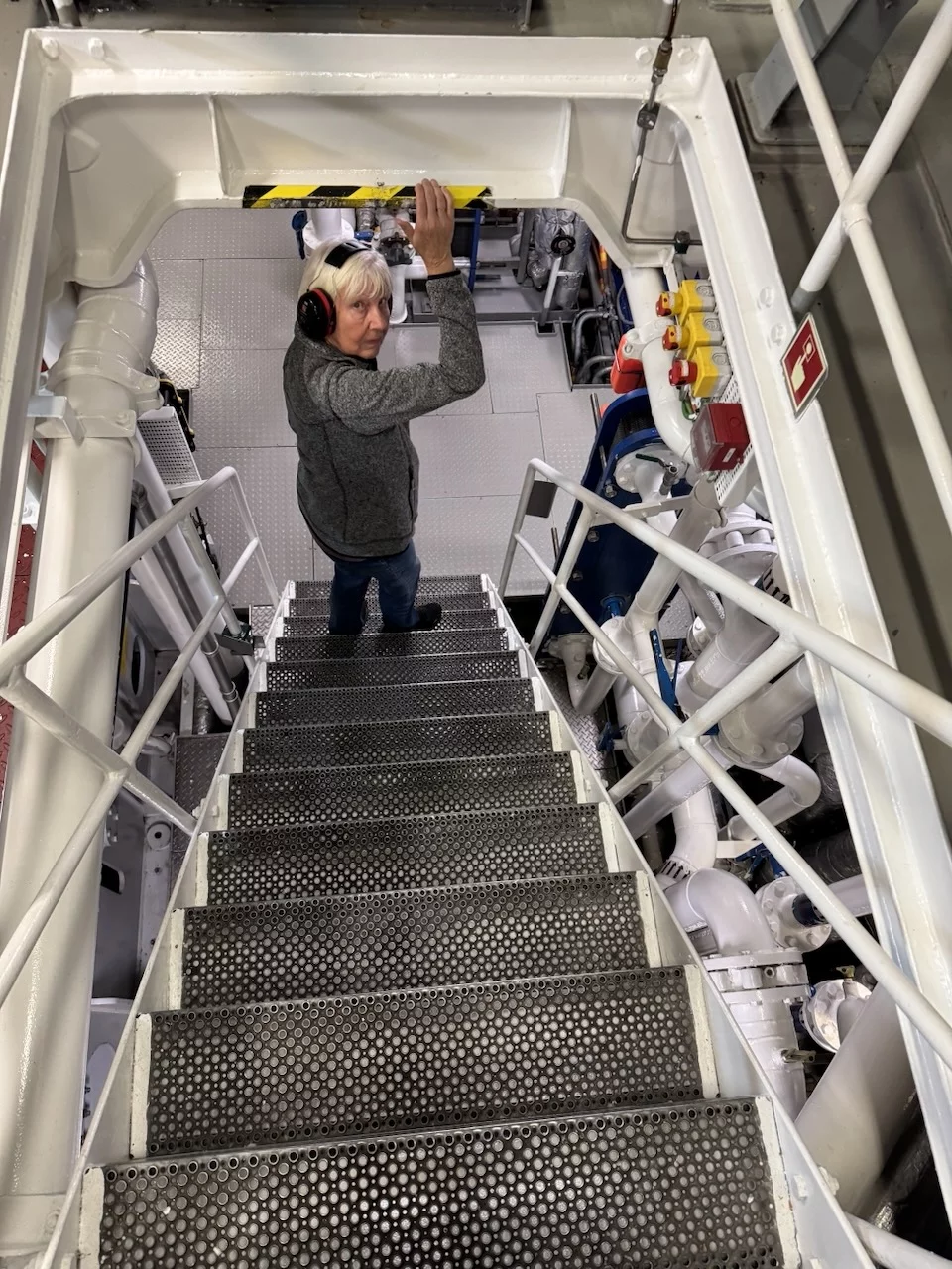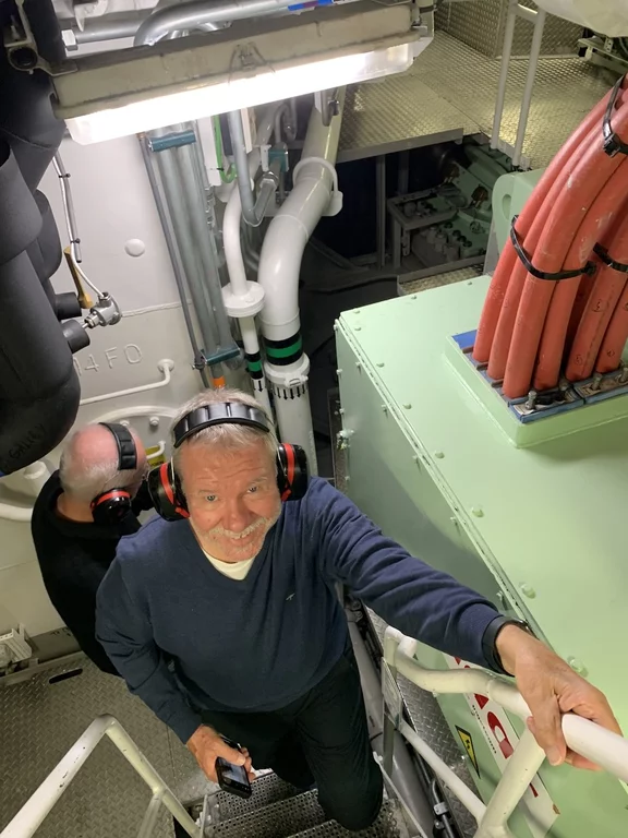 Am Nachmittag gab es für uns mit der Besichtigung des Maschinenraums noch ein kleines Highlight. Der Chief Engineering höchstpersönlich gab sich die Ehre und stellte uns sein „Baby“,wie er es nannte, im Detail vor. Zunächst bekamen wir im Kontrollraum ein wenig technische Hintergrundinformationen, dann folgte ein Rundgang treppauf/treppab durch die verschiedenen Bereiche des Maschinenraums. Beeindruckend nicht nur in technischer Hinsicht, sondern auch mit Blick auf die Arbeitsbedingungen der Crew hier unten. Es ist in den meisten Bereichen sehr heiß und vor allem seeeehhhr laut!!!. Ohne Gehörschutz nicht auszuhalten. Trotzdem war es sehr interessant und lehrreich!!