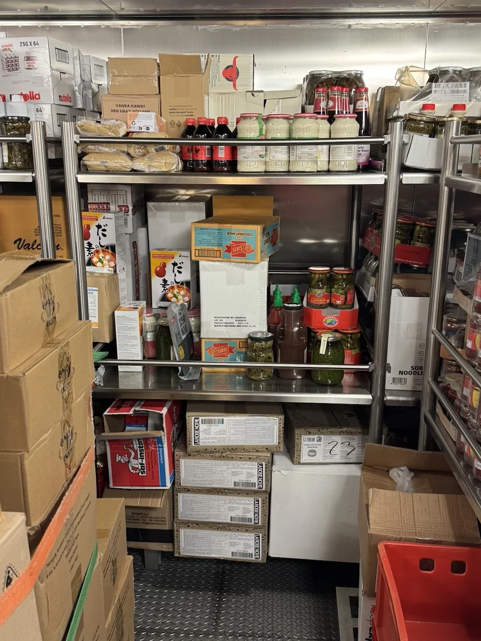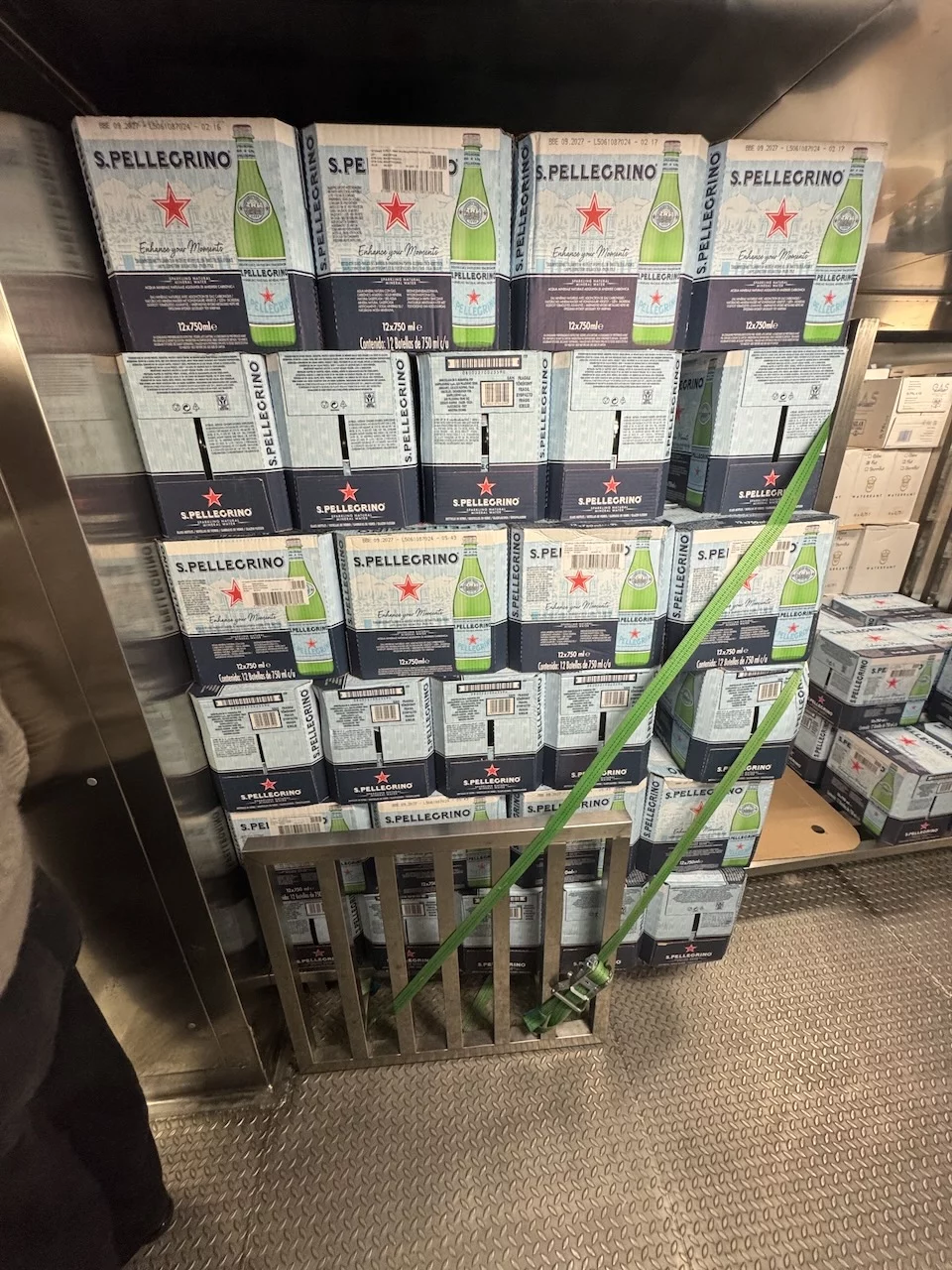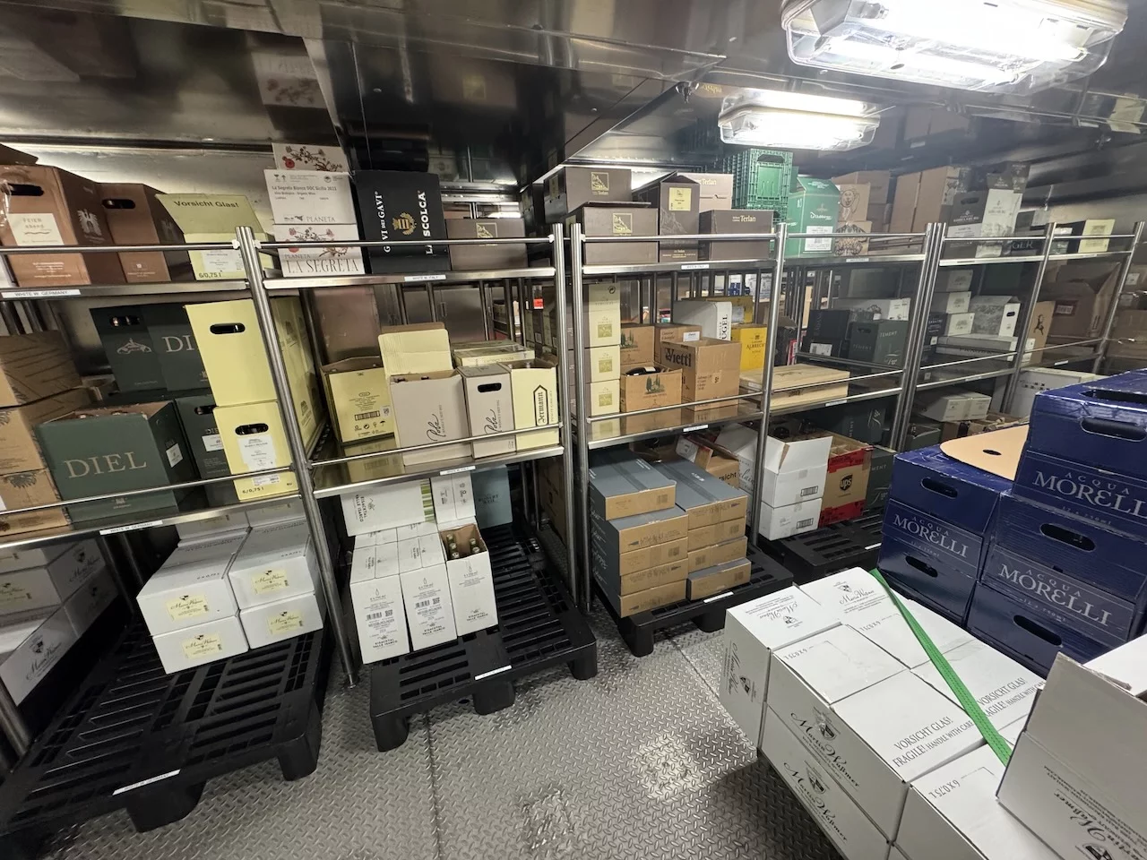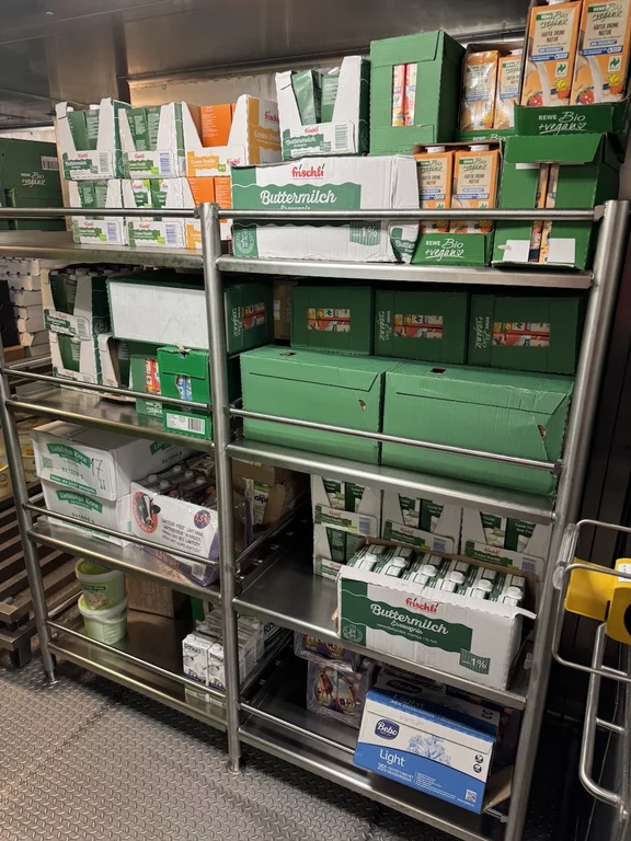 Für uns stand heute nachmittag neben Kofferpacken noch eine Einladung des Hoteldirektors für „Eine kleine Entdeckungsreise an Bord der HANSEATIC nature“ auf dem Programm. Der Treffpunkt war interessanterweise die Gummistiefelwaschanlage auf Deck 3. Es gab aber nichts zu putzen, sondern dahinter ist die Tür, die zu den Lager- und Provianträume der HANSEATIC nature auf Deck 2 führt. Hier bekamen wir einen kleinen Überblick, wie die Logistik auf einem Expeditionsschiff dieser Größe funktioniert. Wir durften einen Blick in die Kühlkammern werfen, wo all' die leckeren Sachen lagern, die wir in den letzten 19 Tagen genießen durften. Es sieht zwar nicht unbedingt spektakulär aus, aber die Disposition hinter dieser Versorgung folgt einem sehr ausgeklügelten System. Bis zu 60 Tonnen an Lebensmittel und Getränken können hier unten gebunkert werden.